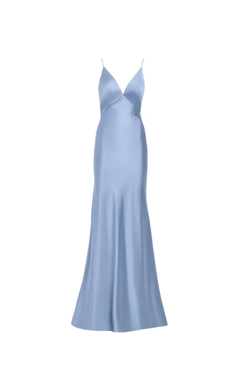ABITO LUNGO IN SATIN CON SCOLLO A V E SCIALLATO LUNGO LA SCHIENA