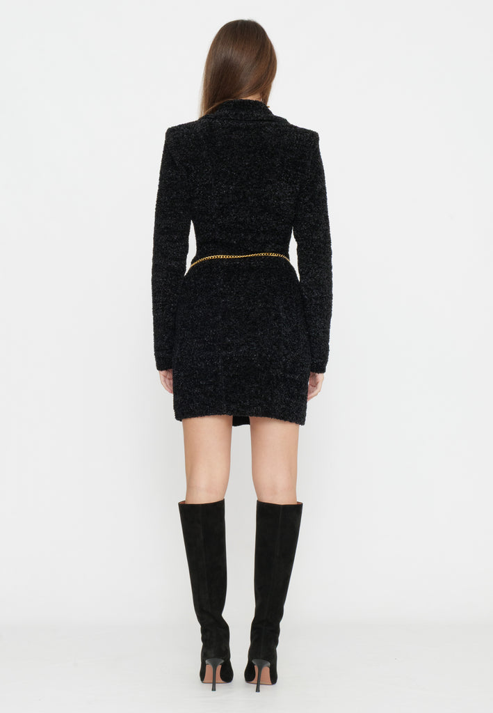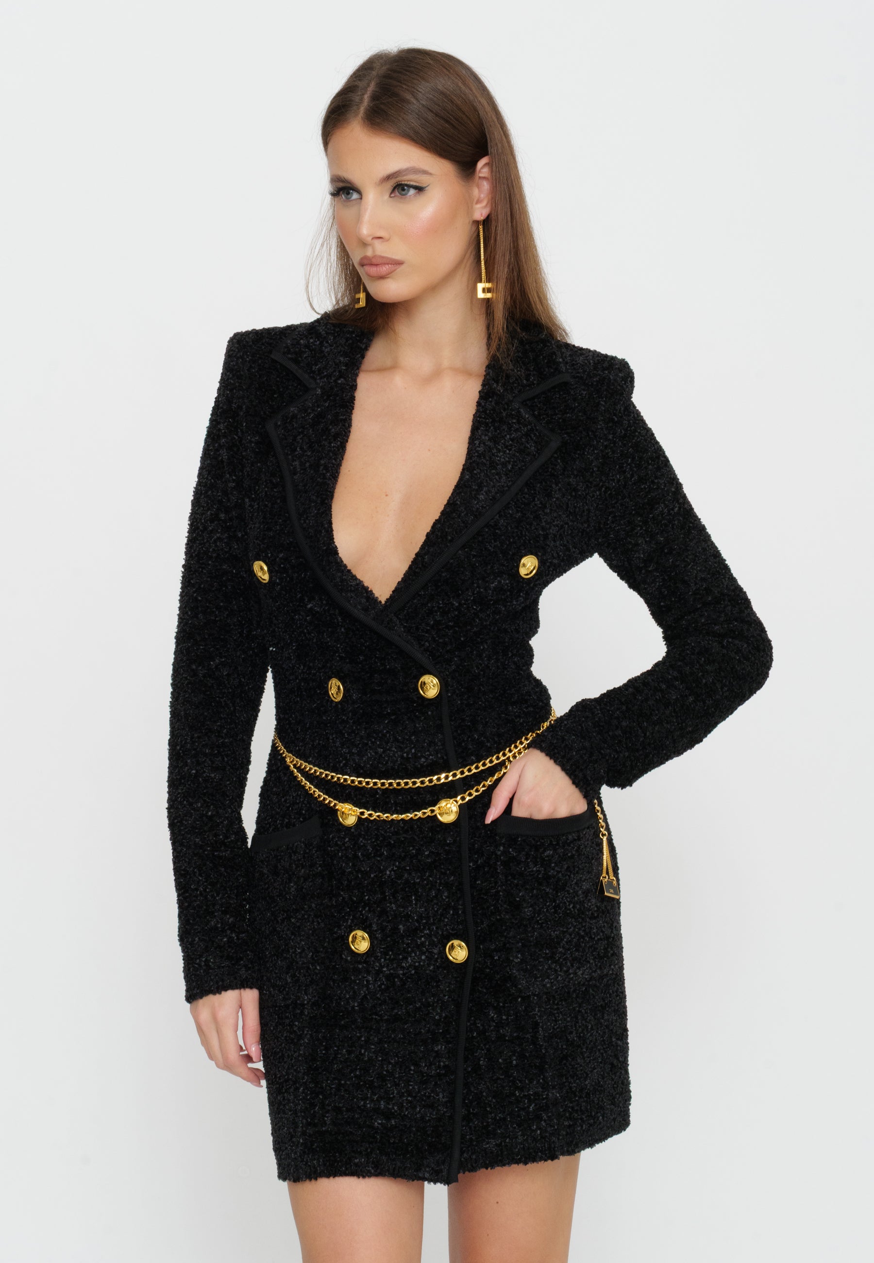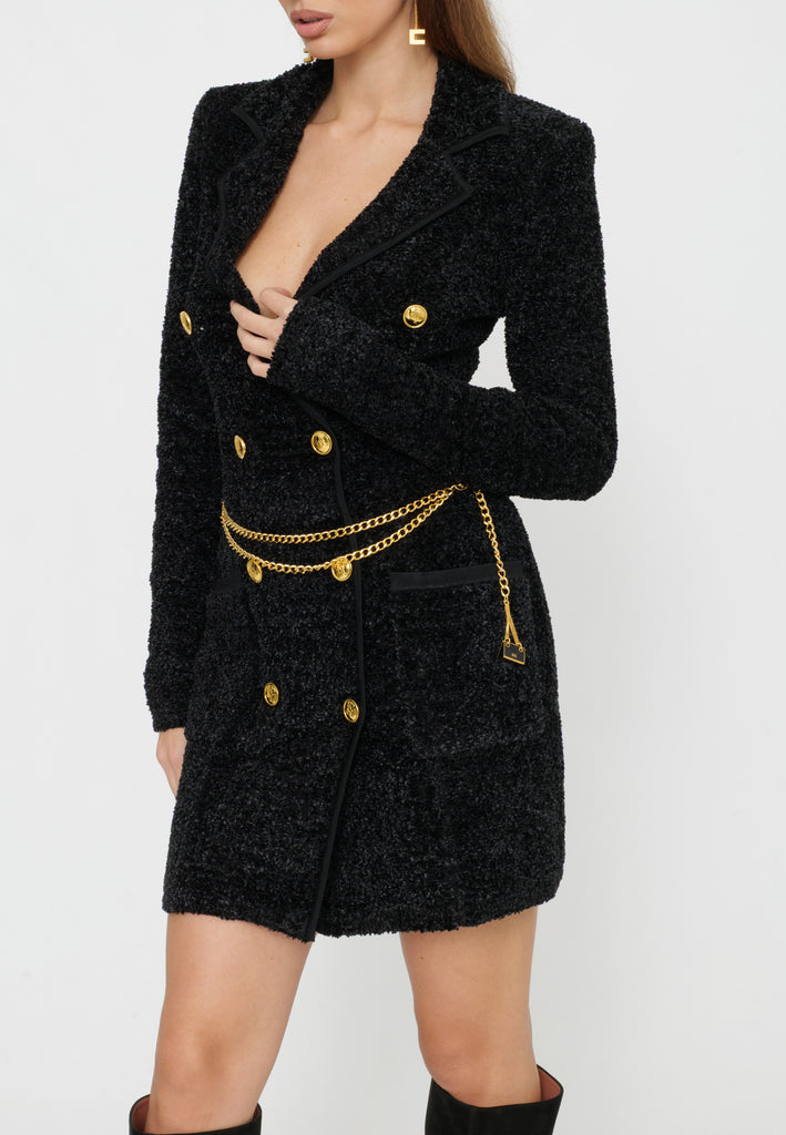 Abito robemanteau in ciniglia bouclé che incarna eleganza sofisticata con una silhouette aderente e affascinante. Le spalle strutturate conferiscono presenza e definizione, mentre il collo con rever doppiopetto aggiunge un tocco di raffinatezza senza tempo. Le tasche applicate garantiscono praticità mantenendo l'estetica pulita. Dettagli esclusivi come i bottoni e la cintura con charm a forma di mini-bag in metallo dorato con logo trasformano questo capo in una dichiarazione di stile consapevole. Un pezzo versatile che passa con disinvoltura da occasioni formali a look contemporanei.