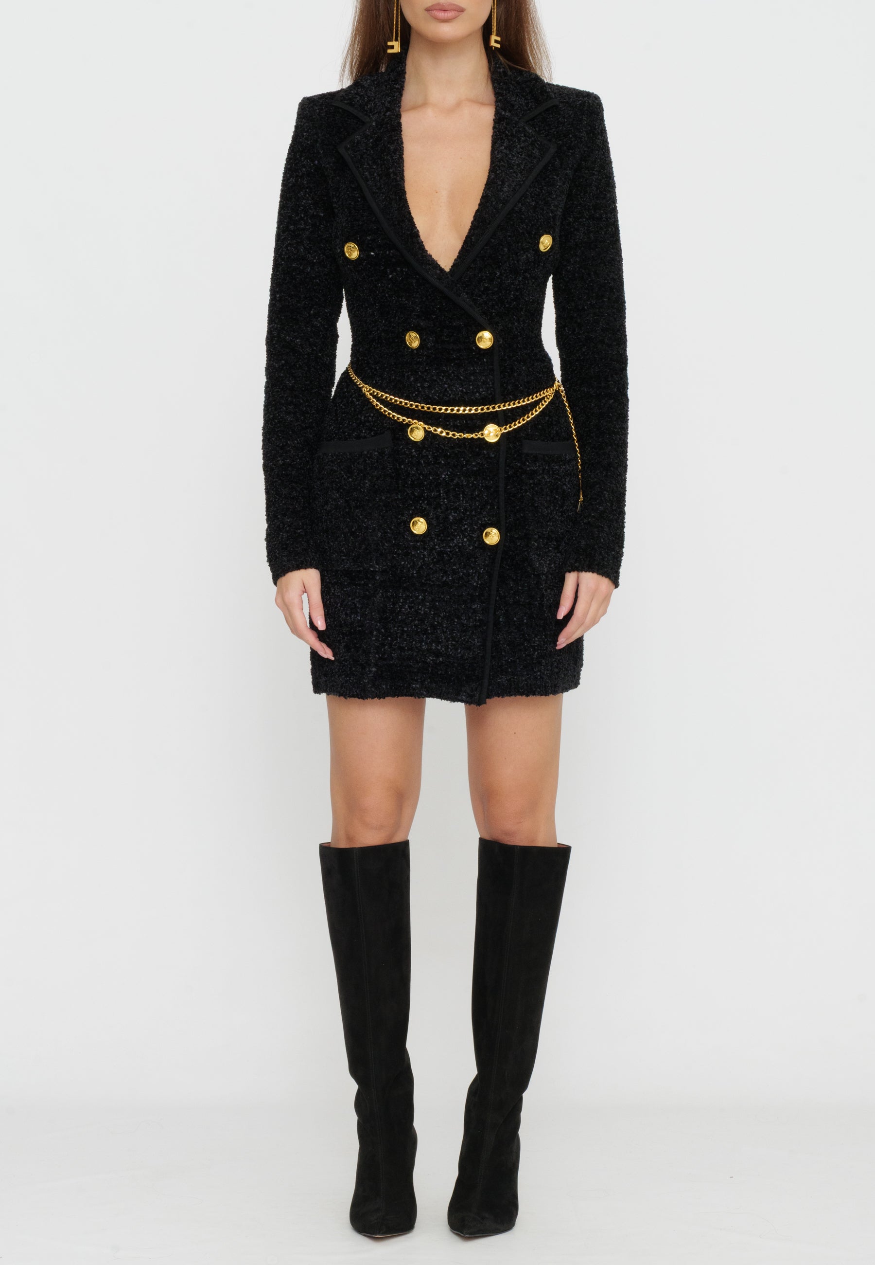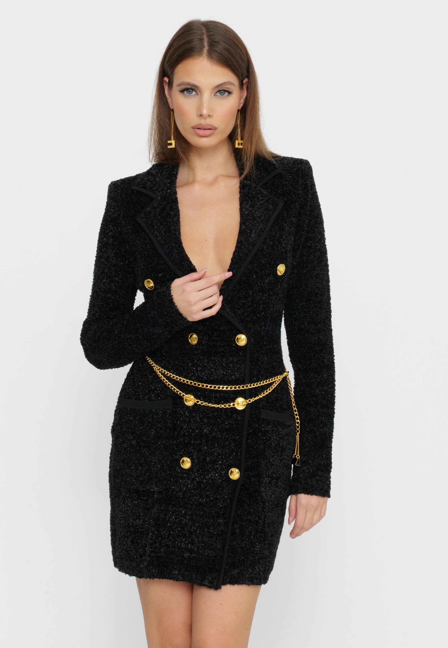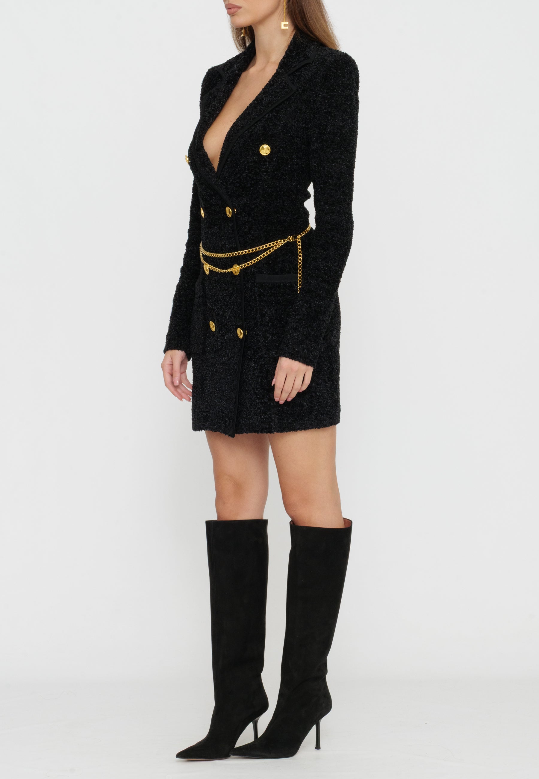 Abito robemanteau in ciniglia bouclé che incarna eleganza sofisticata con una silhouette aderente e affascinante. Le spalle strutturate conferiscono presenza e definizione, mentre il collo con rever doppiopetto aggiunge un tocco di raffinatezza senza tempo. Le tasche applicate garantiscono praticità mantenendo l'estetica pulita. Dettagli esclusivi come i bottoni e la cintura con charm a forma di mini-bag in metallo dorato con logo trasformano questo capo in una dichiarazione di stile consapevole. Un pezzo versatile che passa con disinvoltura da occasioni formali a look contemporanei.