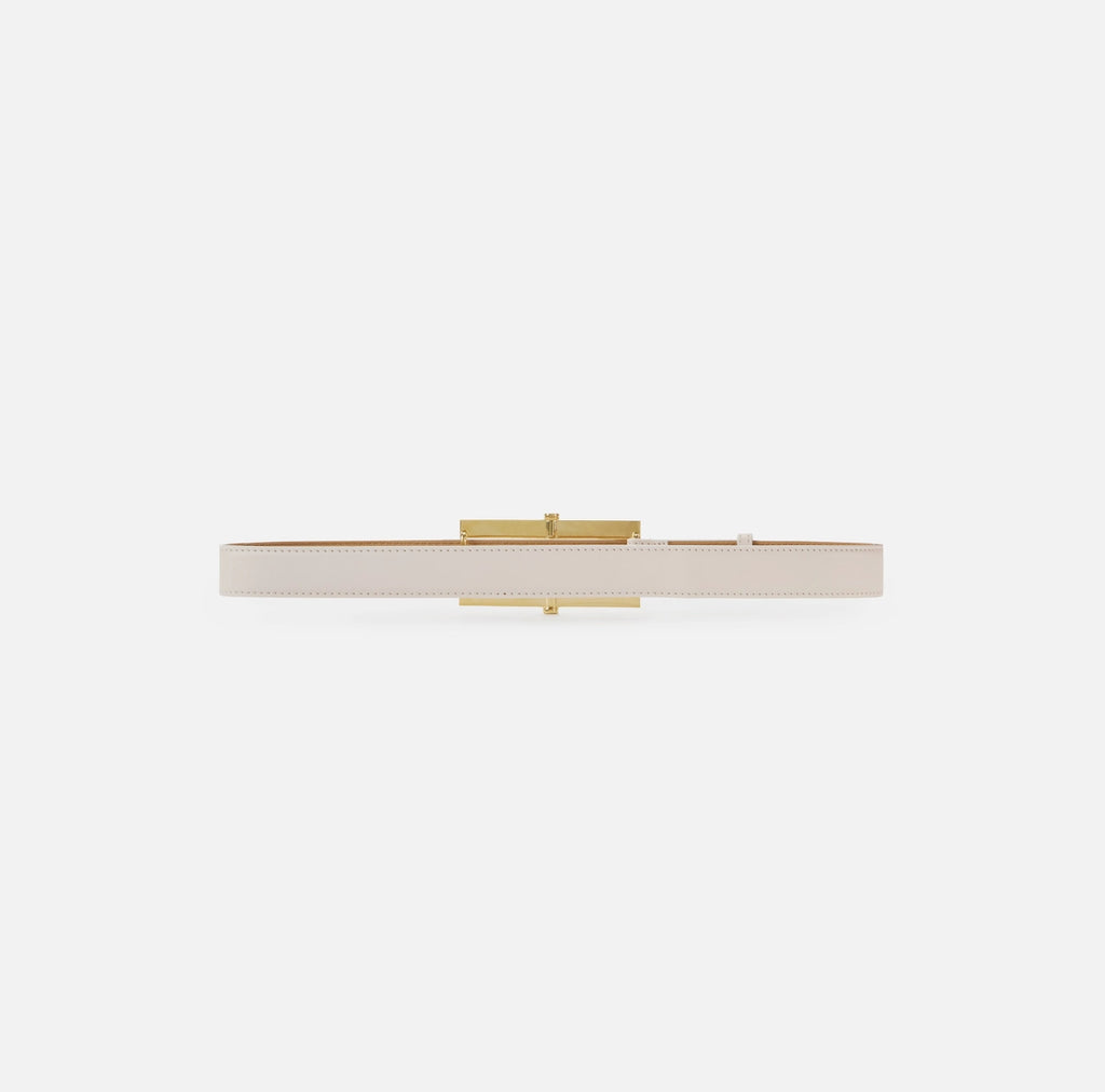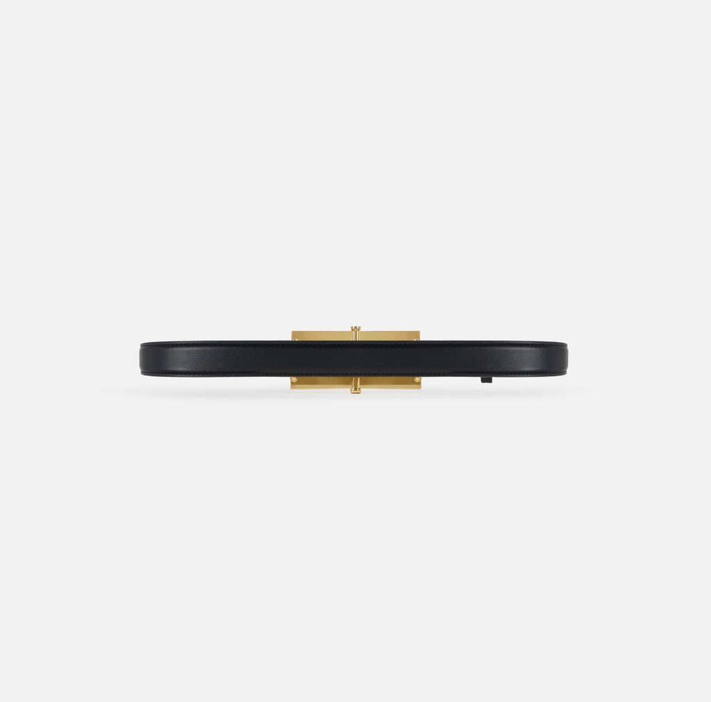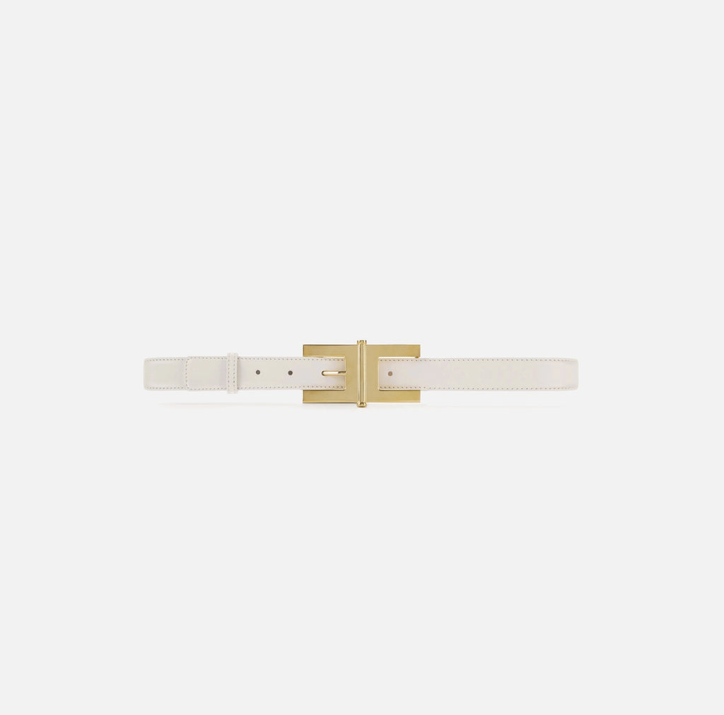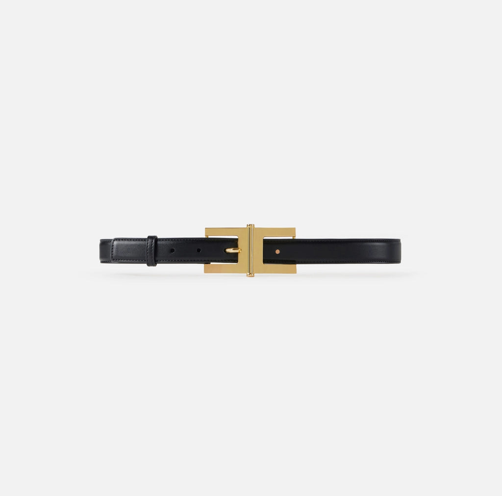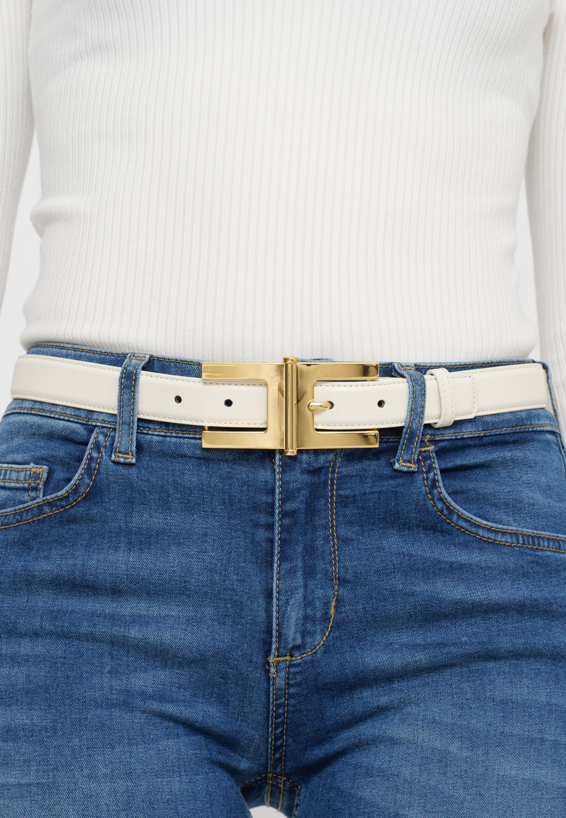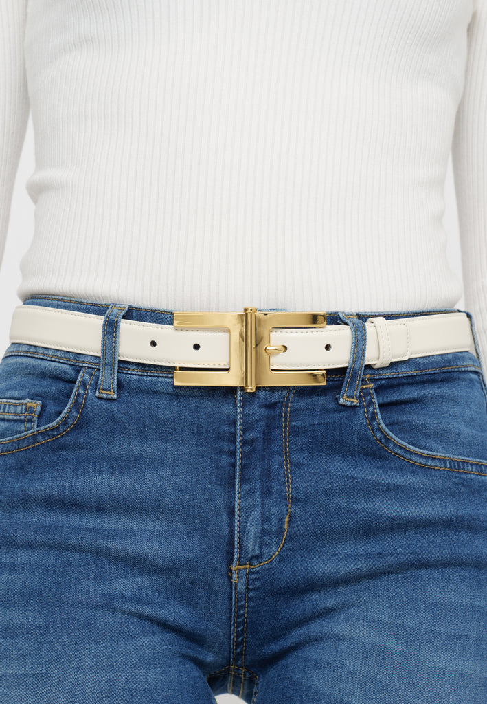 Questa cintura a vita alta è realizzata in materiale sintetico effetto pelle, garantendo un look sofisticato e moderno. La fibbia ad ardiglione, arricchita dal logo in metallo dorato, aggiunge un tocco distintivo e raffinato. Ideale per valorizzare il punto vita e completare con eleganza ogni outfit.