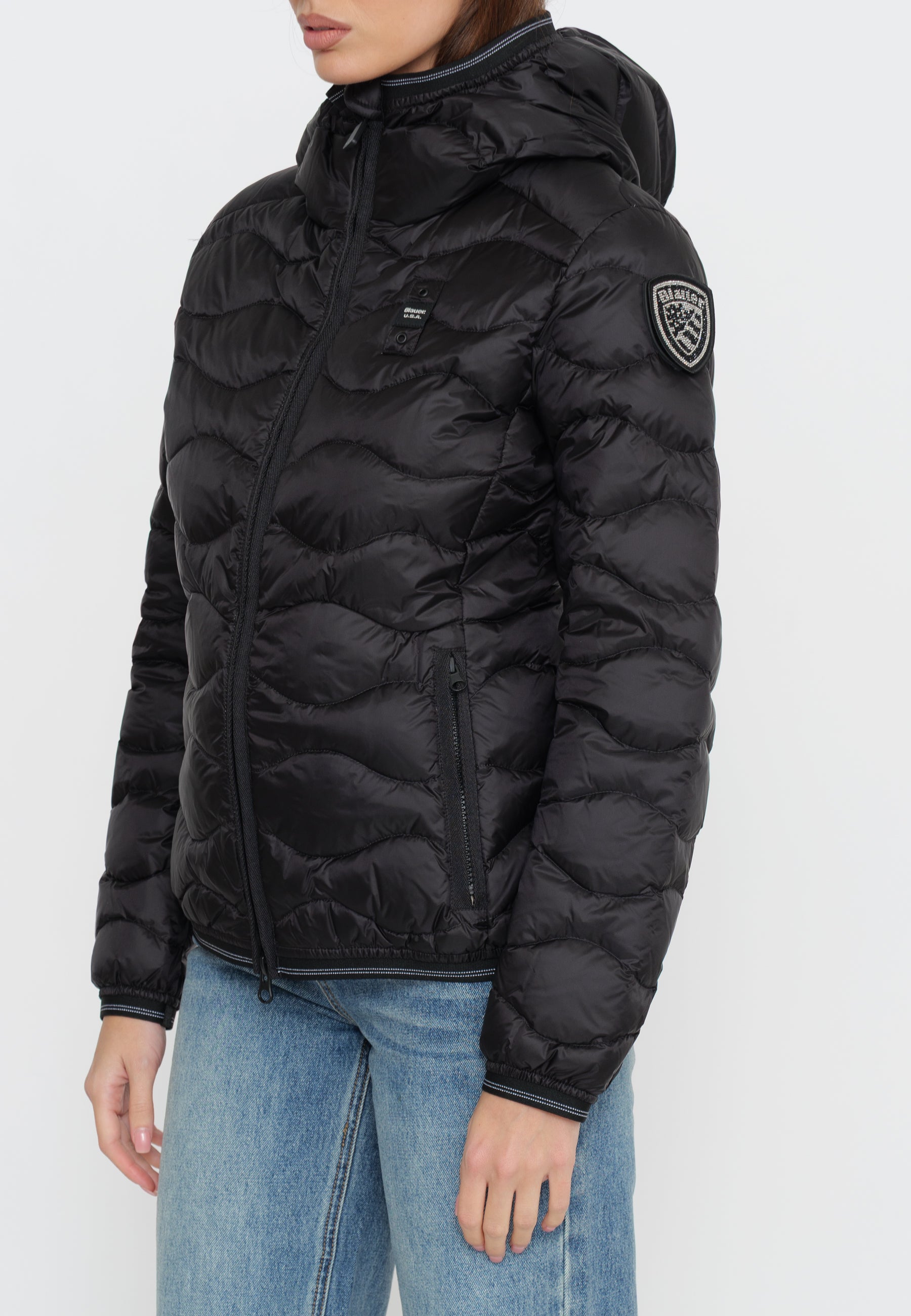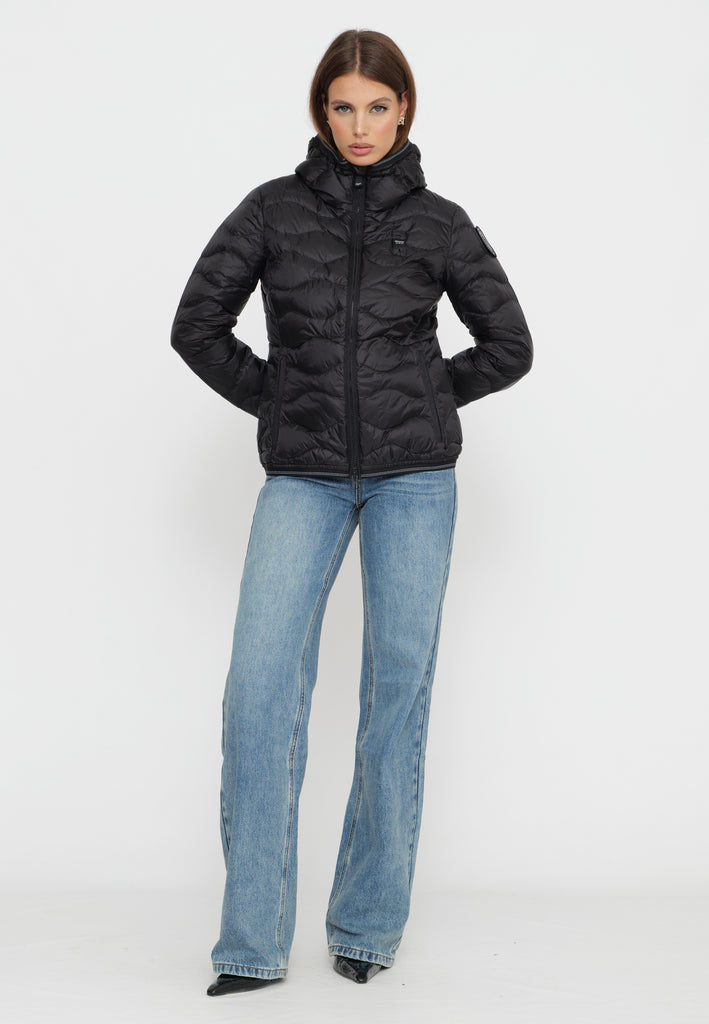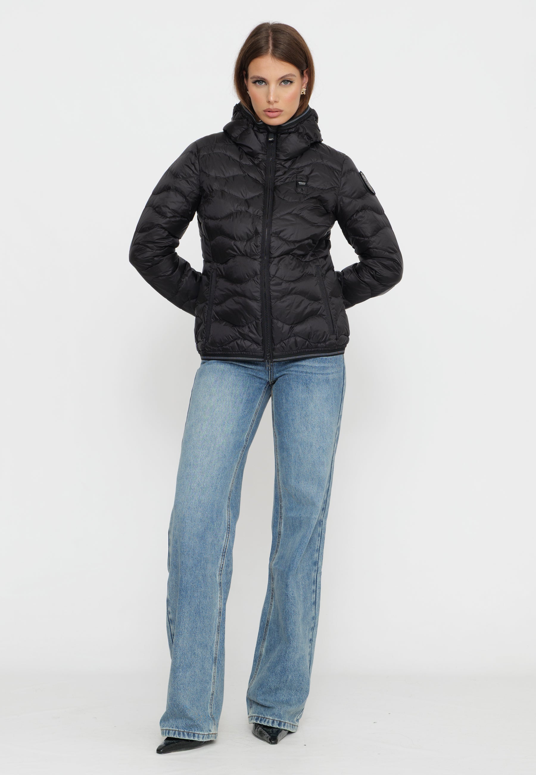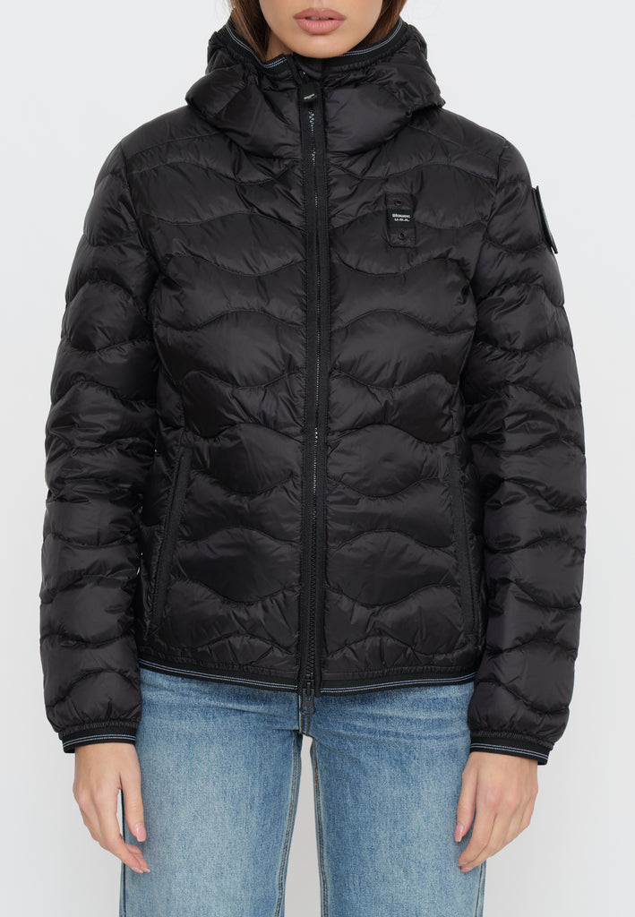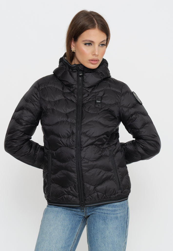 Piumino idrorepellente Blauer con trapuntatura a onde orizzontali e silhouette svasata. Questo capo iconico del brand combina praticità e stile con imbottitura in piuma 90/10 (150 gr) che garantisce calore senza ingombro. Caratteristiche tecniche: nylon lucido idrorepellente, fodera in nylon a contrasto, cappuccio fisso con elastico rigato, chiusura zip nascosta con copri cursore, tasche con zip e tasca interna in velcro. Finiture raffinate con elastico rigato su fondo e polsini, patch glitter e passante logo. Un'essenziale seconda pelle per la stagione fredda, versatile e performante.