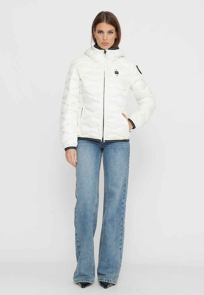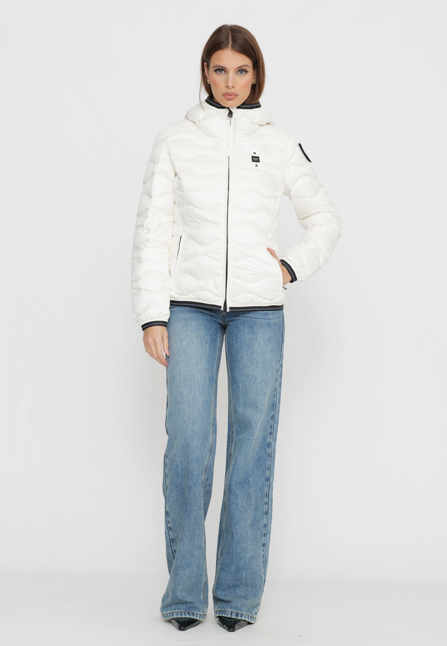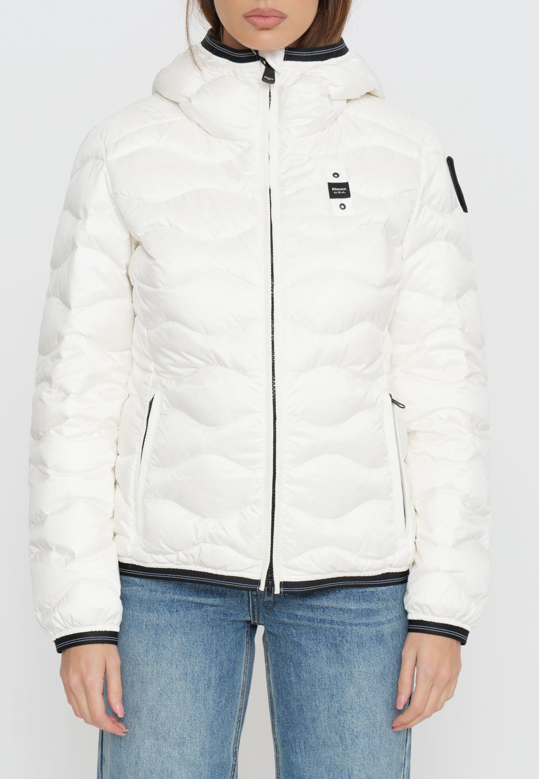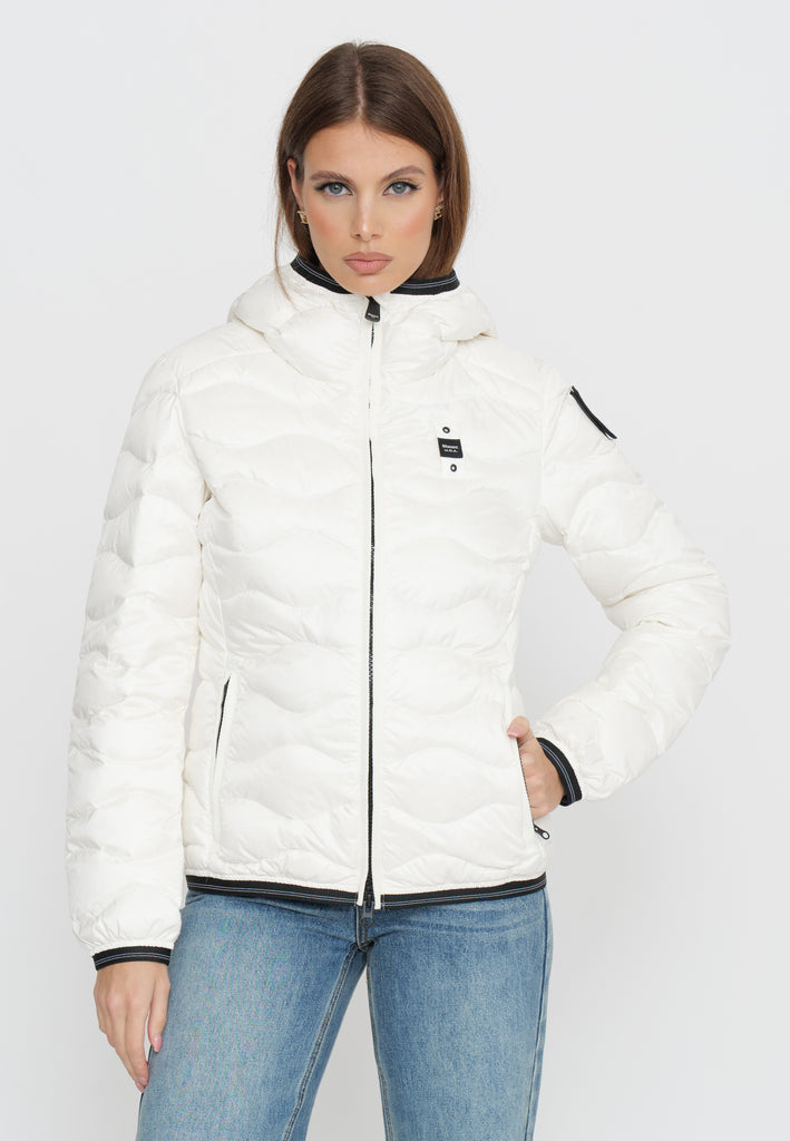 Piumino idrorepellente Blauer con trapuntatura a onde orizzontali e silhouette svasata. Questo capo iconico del brand combina praticità e stile con imbottitura in piuma 90/10 (150 gr) che garantisce calore senza ingombro. Caratteristiche tecniche: nylon lucido idrorepellente, fodera in nylon a contrasto, cappuccio fisso con elastico rigato, chiusura zip nascosta con copri cursore, tasche con zip e tasca interna in velcro. Finiture raffinate con elastico rigato su fondo e polsini, patch glitter e passante logo. Un'essenziale seconda pelle per la stagione fredda, versatile e performante.