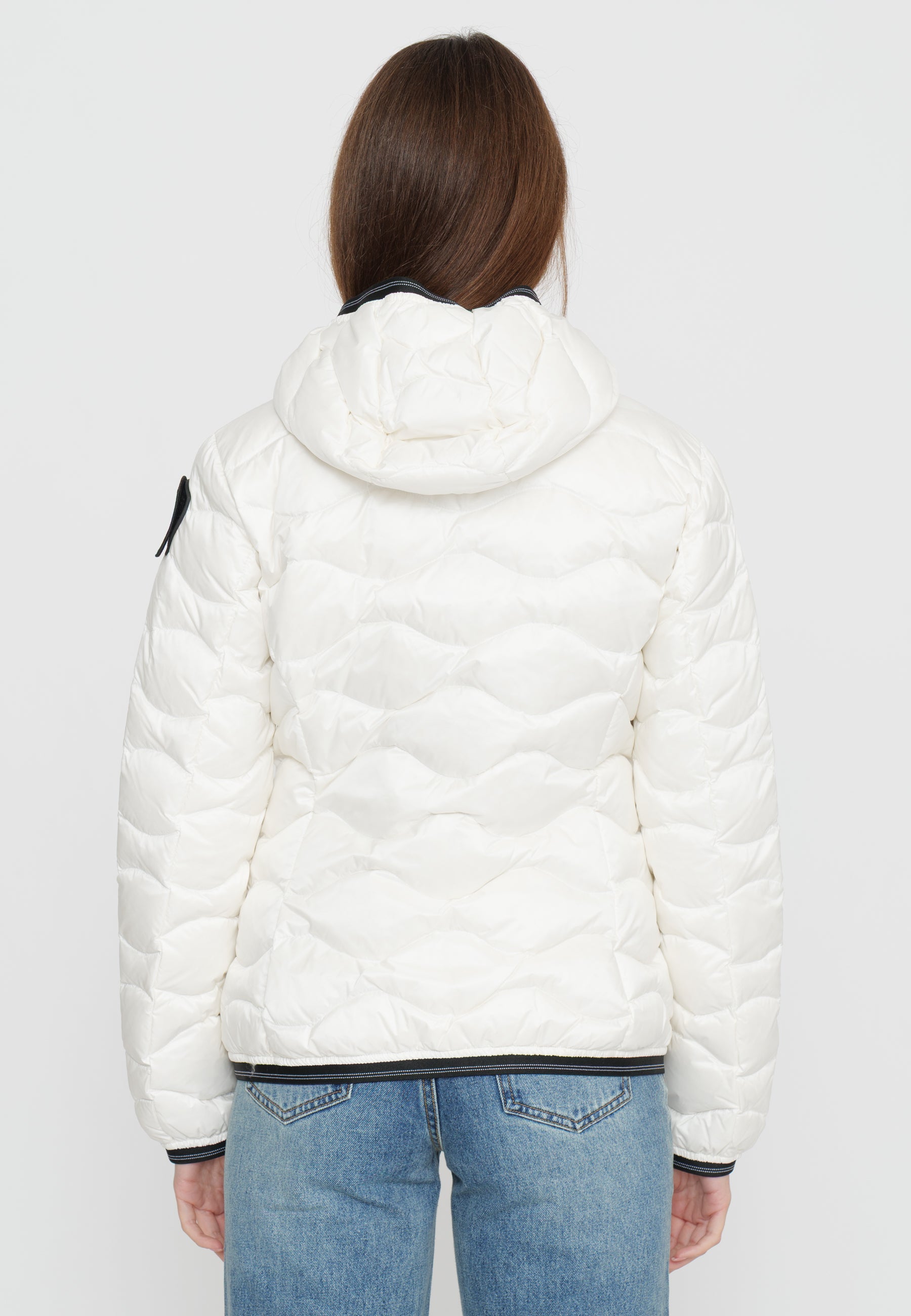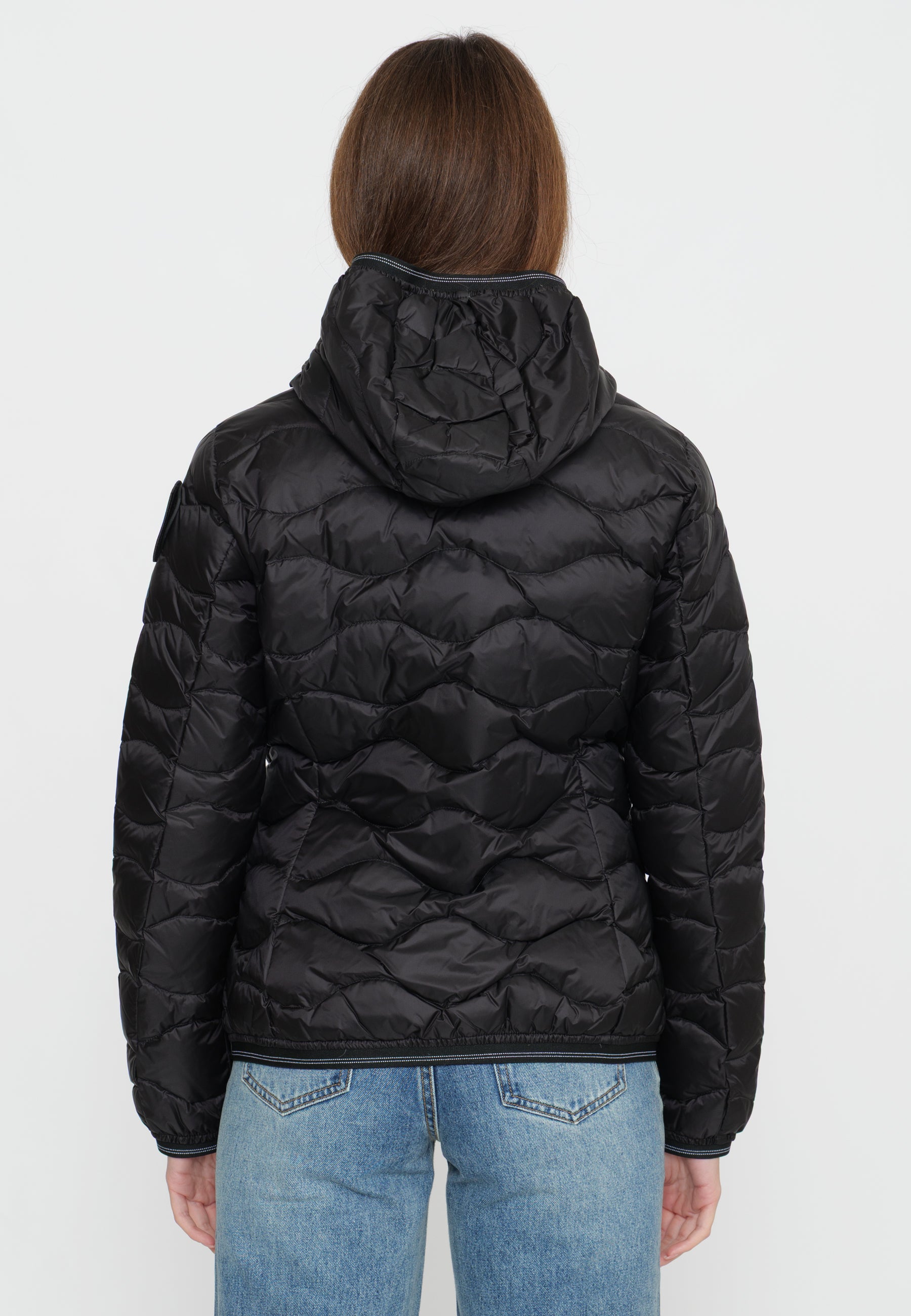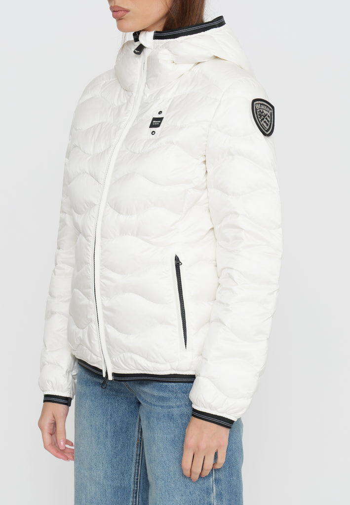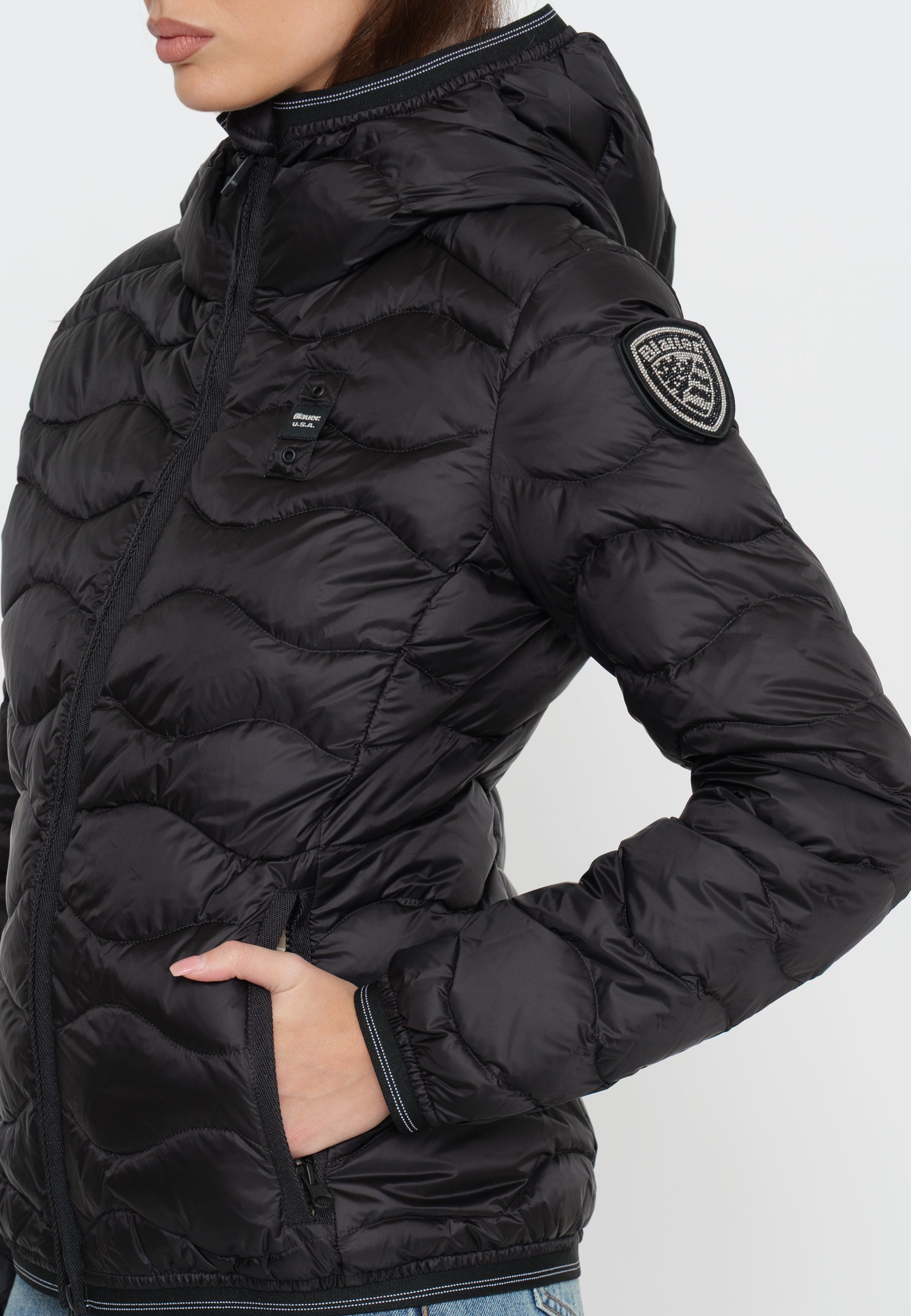 Piumino idrorepellente Blauer con trapuntatura a onde orizzontali e silhouette svasata. Questo capo iconico del brand combina praticità e stile con imbottitura in piuma 90/10 (150 gr) che garantisce calore senza ingombro. Caratteristiche tecniche: nylon lucido idrorepellente, fodera in nylon a contrasto, cappuccio fisso con elastico rigato, chiusura zip nascosta con copri cursore, tasche con zip e tasca interna in velcro. Finiture raffinate con elastico rigato su fondo e polsini, patch glitter e passante logo. Un'essenziale seconda pelle per la stagione fredda, versatile e performante.