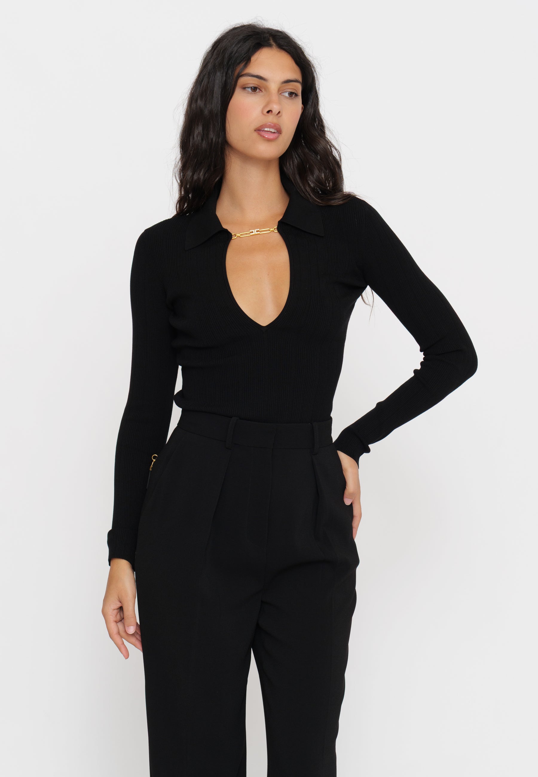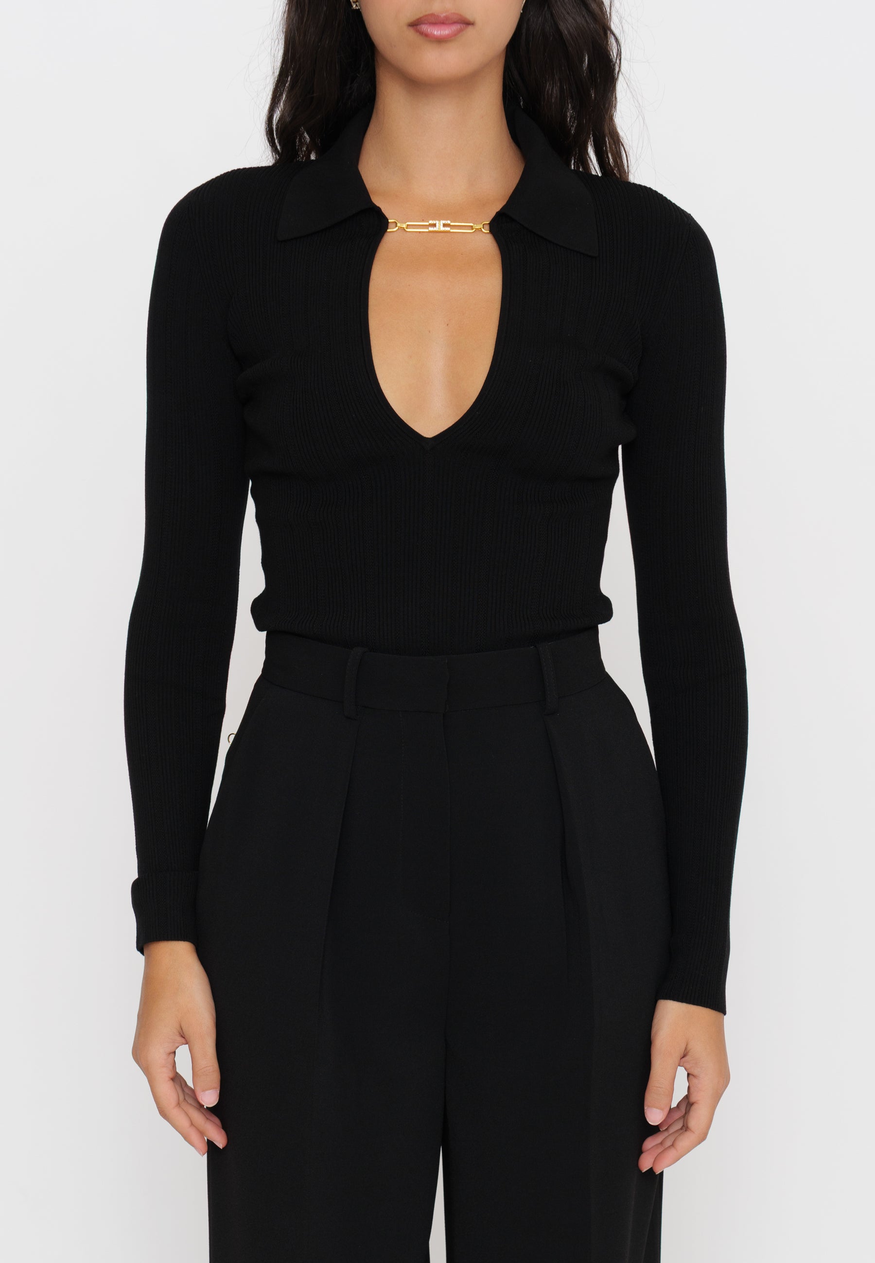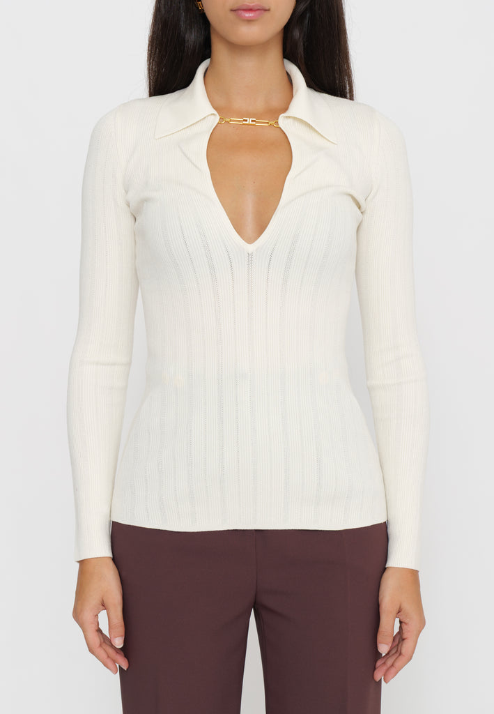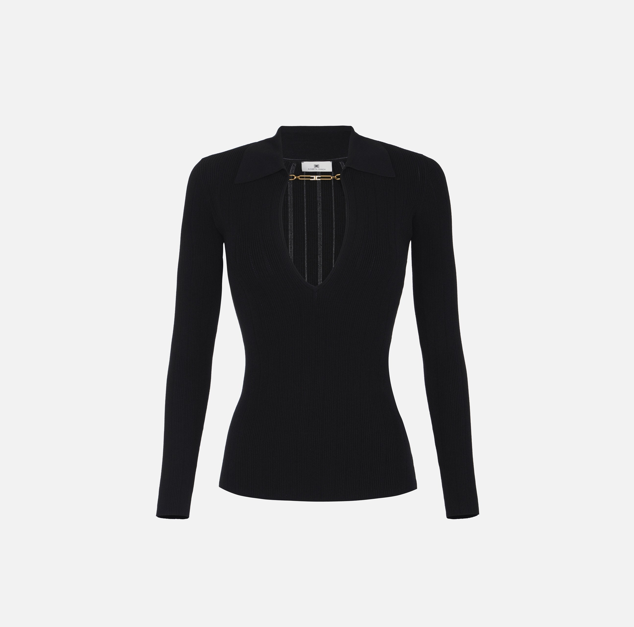 Maglia a costine firmata Elisabetta Franchi, caratterizzata da un colletto raffinato e da un delicato dettaglio gioiello. Il design sagomato valorizza la silhouette, offrendo un equilibrio tra eleganza e comfort. Un capo ideale per chi cerca uno stile contemporaneo con un tocco di classe distintiva.