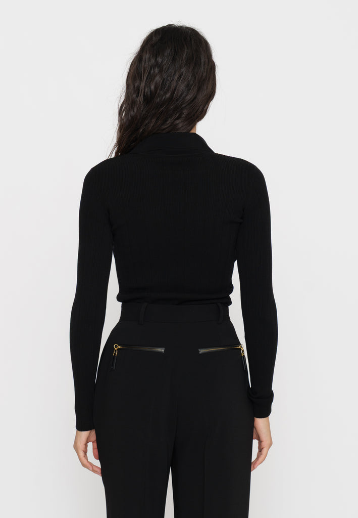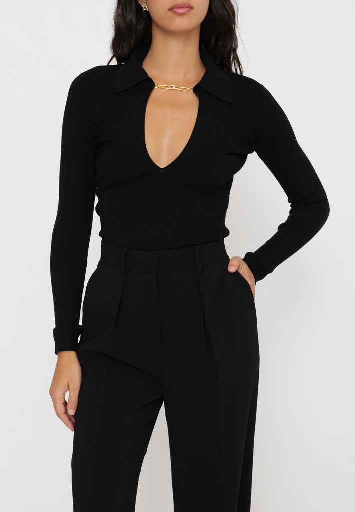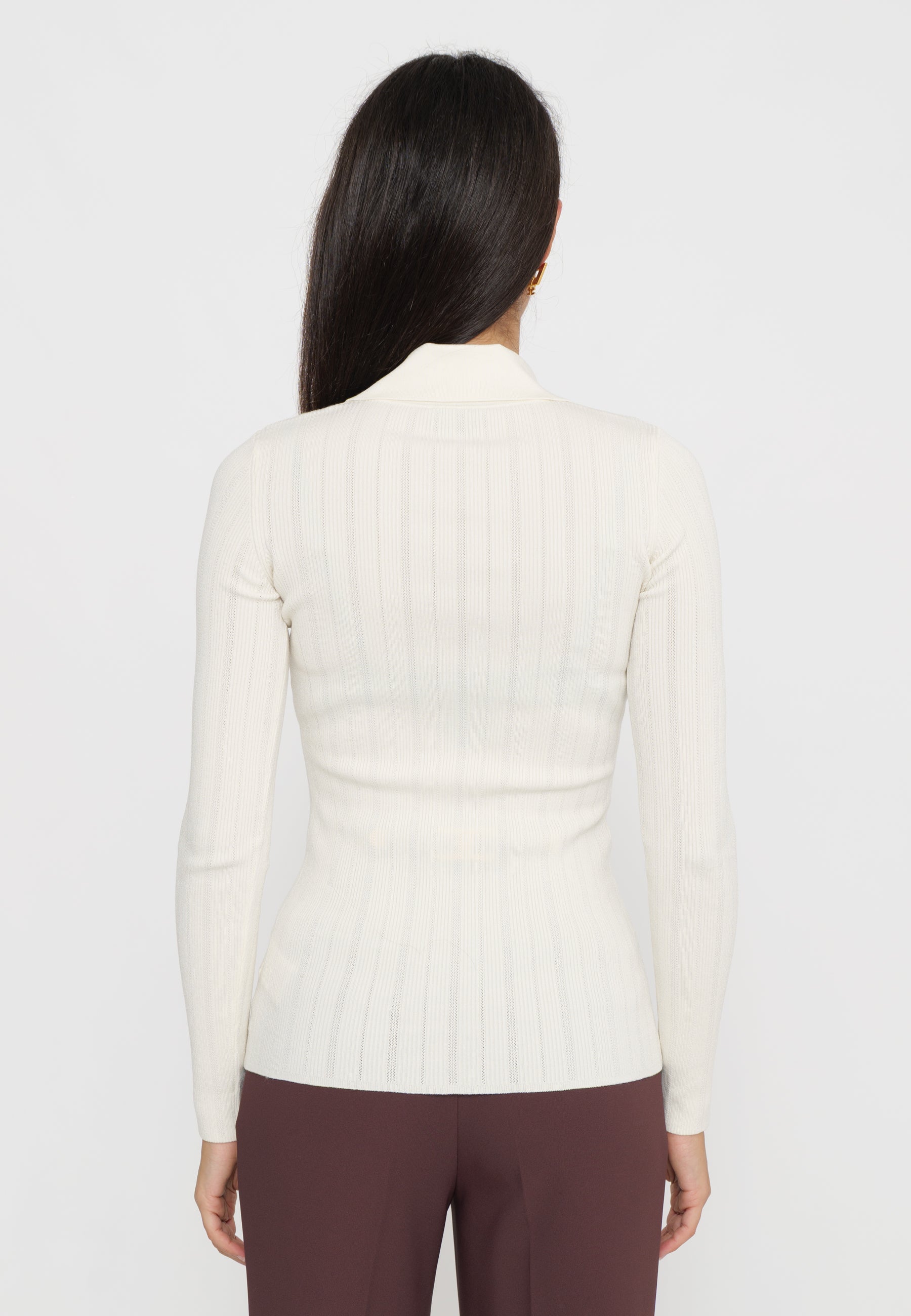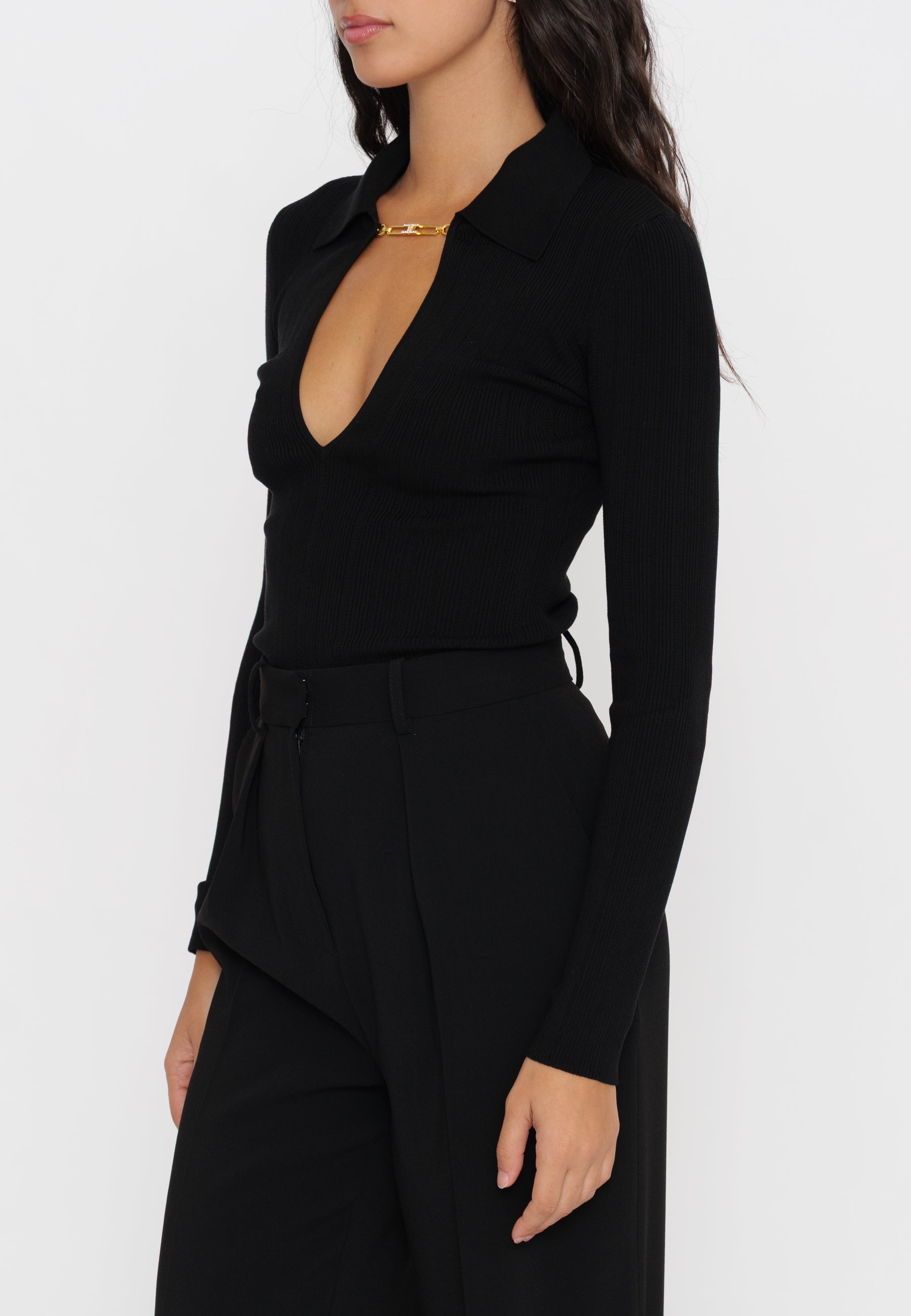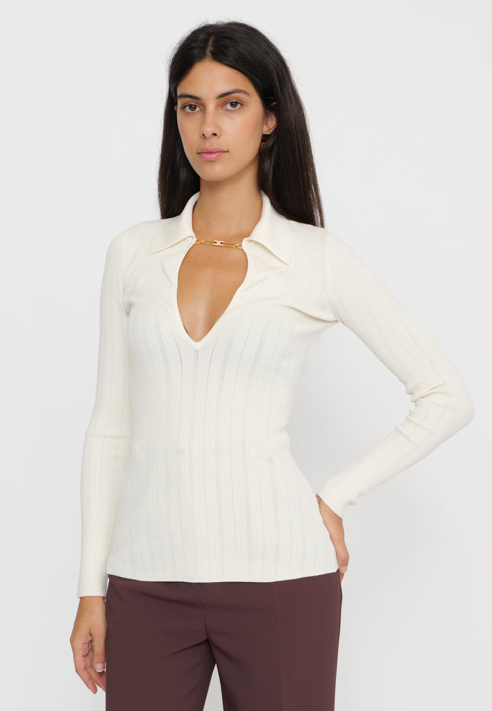 Maglia a costine firmata Elisabetta Franchi, caratterizzata da un colletto raffinato e da un delicato dettaglio gioiello. Il design sagomato valorizza la silhouette, offrendo un equilibrio tra eleganza e comfort. Un capo ideale per chi cerca uno stile contemporaneo con un tocco di classe distintiva.