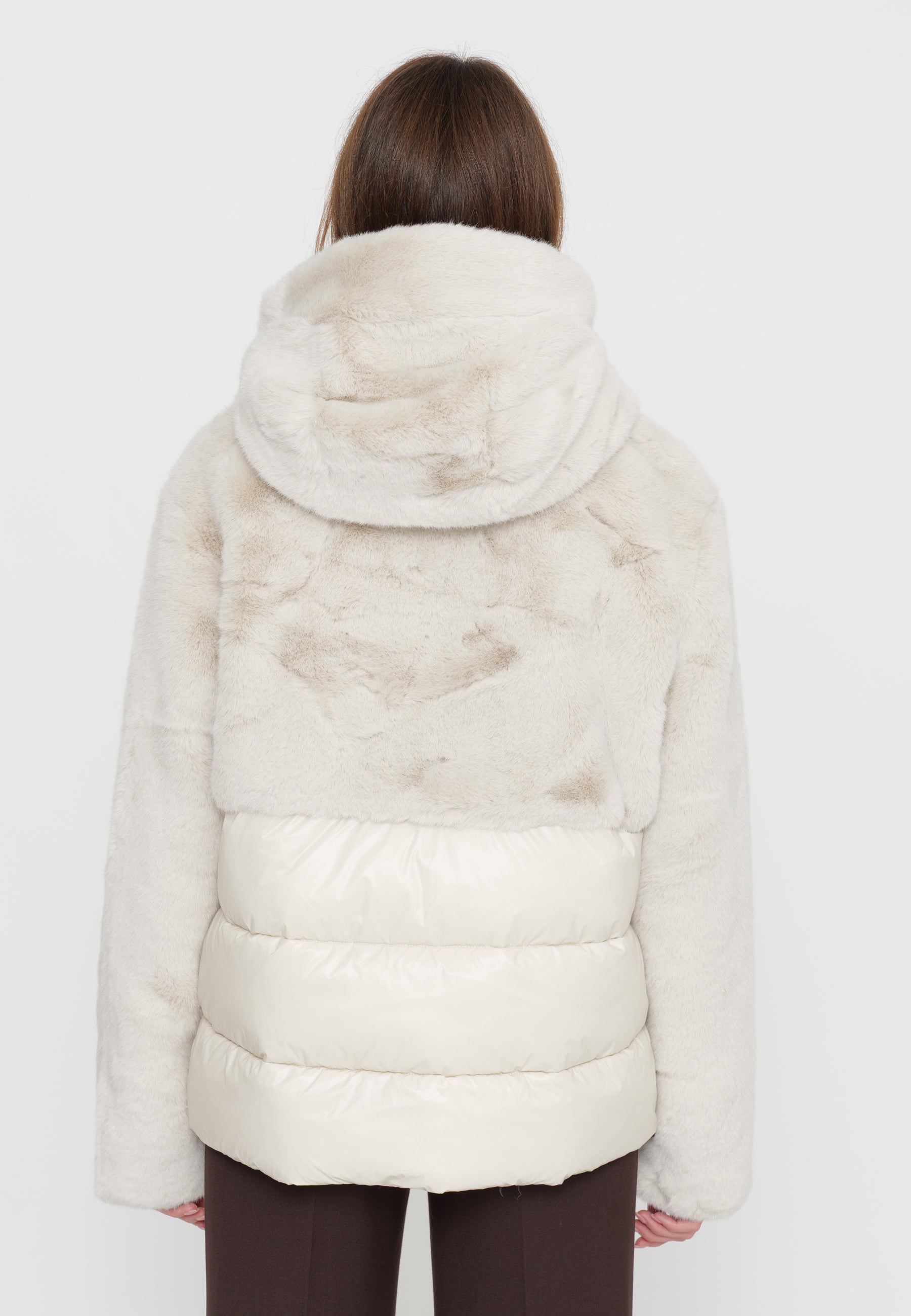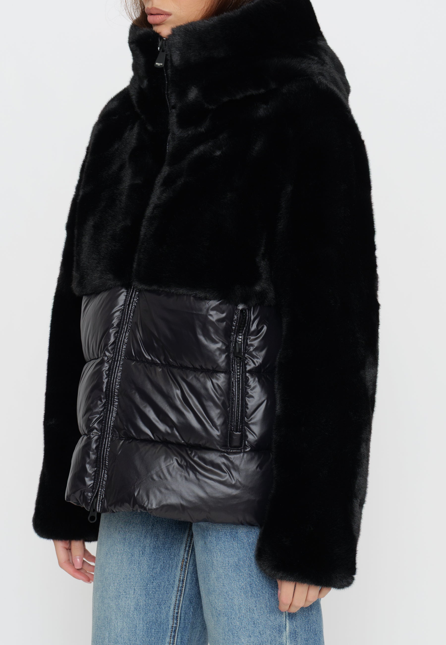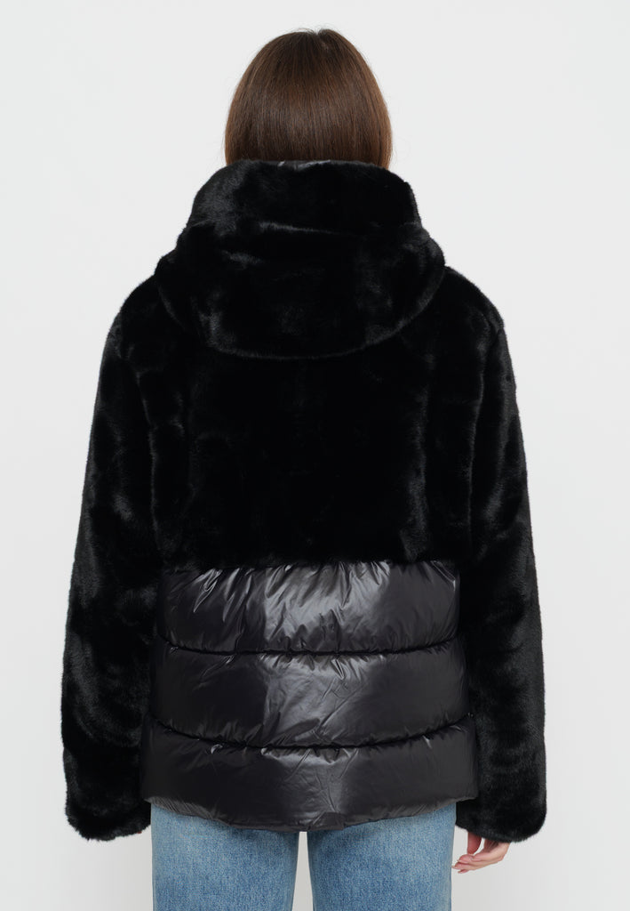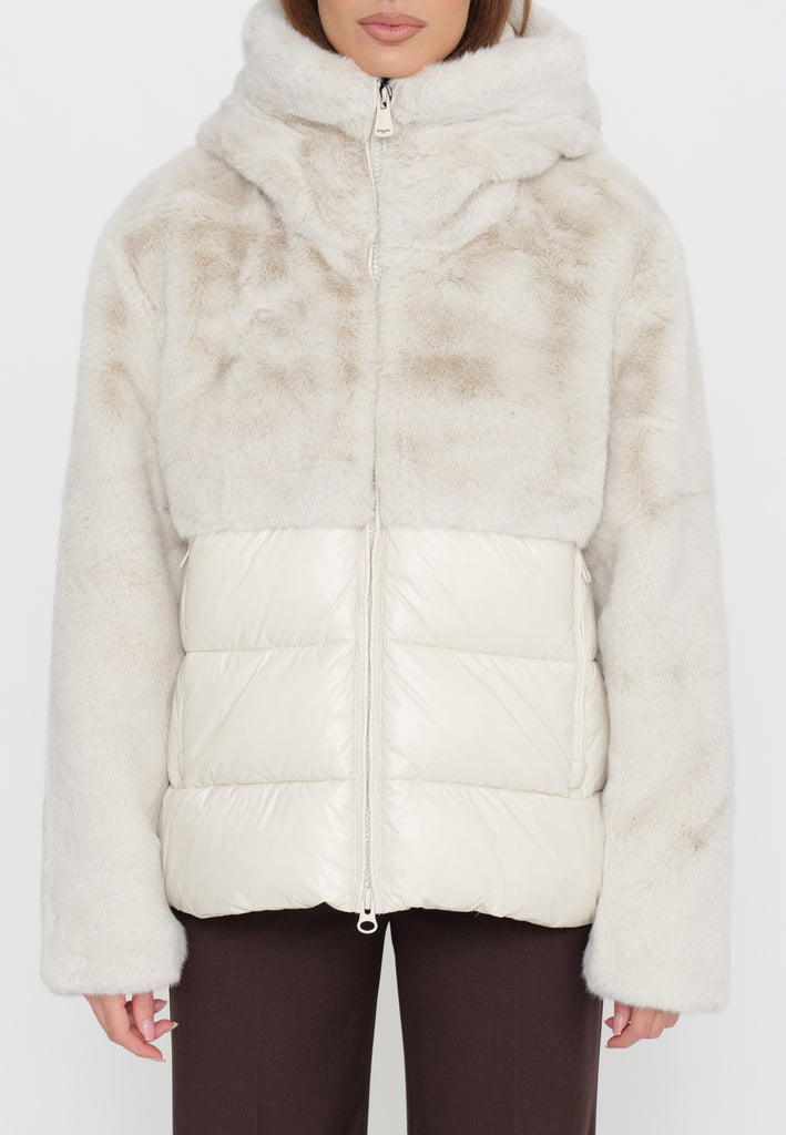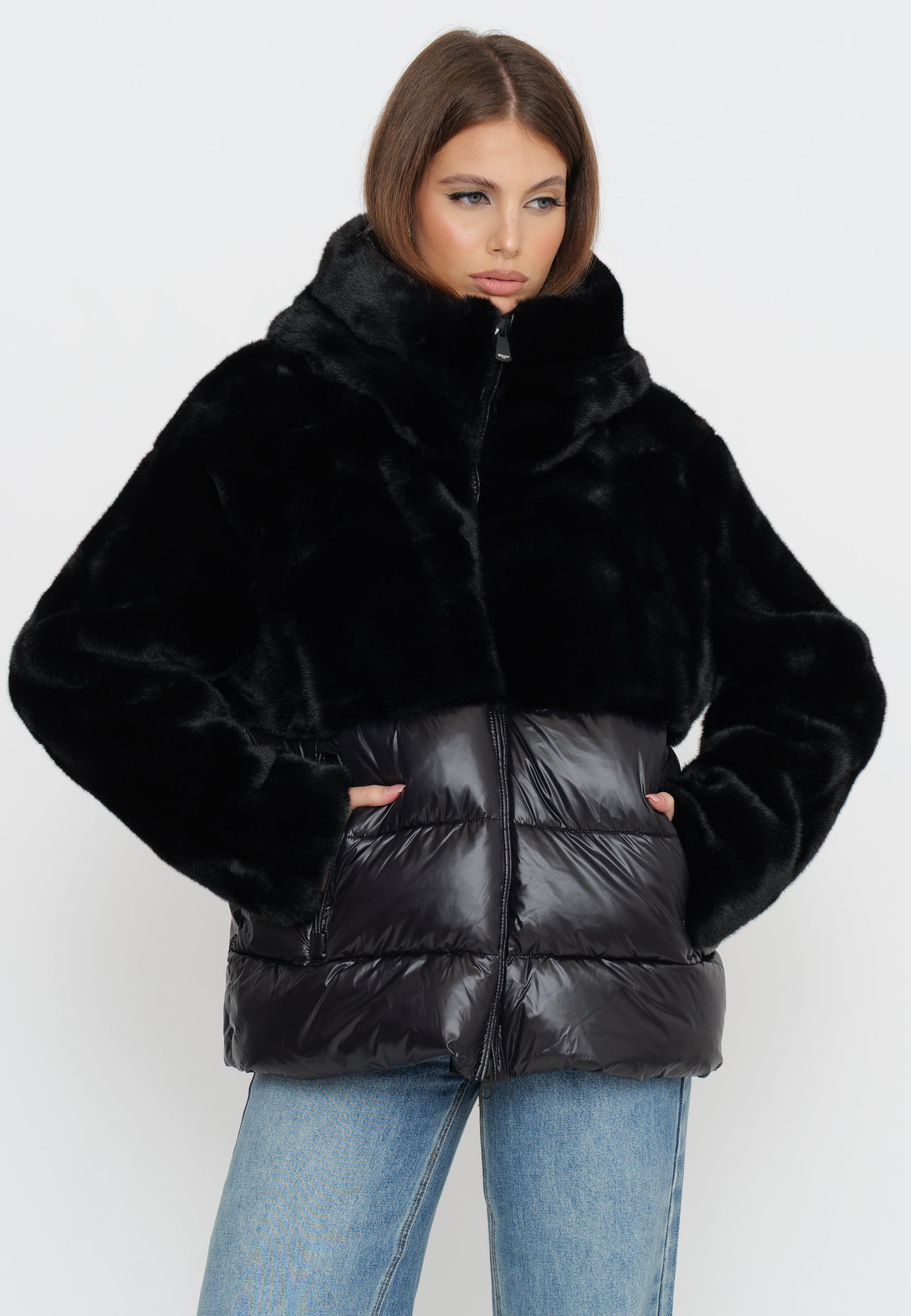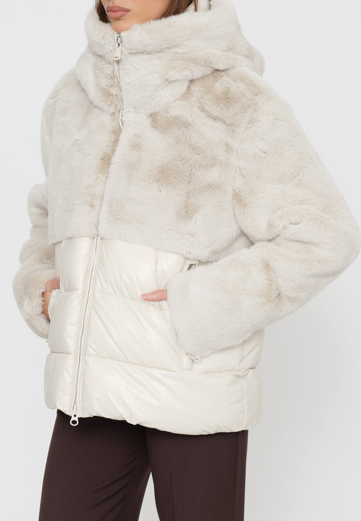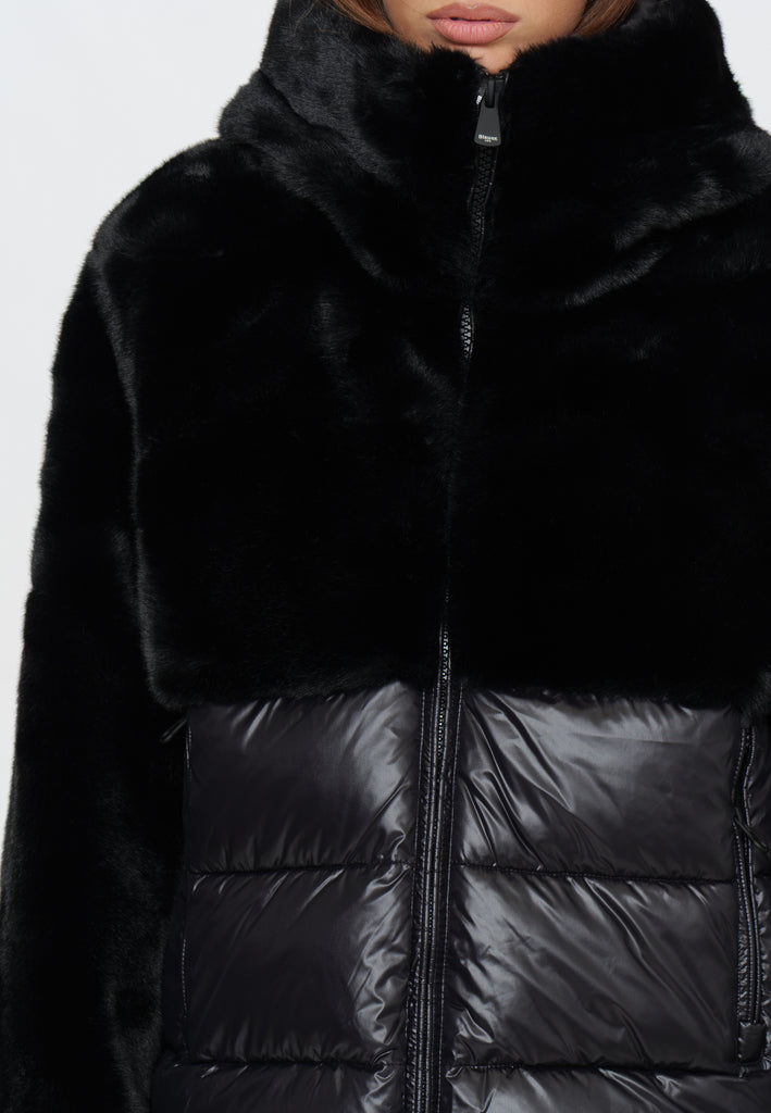 Giubbotto ibrido che combina ecopelliccia nella parte superiore e nylon lucido nella parte inferiore, progettato per affrontare gli inverni più rigidi mantenendo un'estetica ricercata. Il cappuccio fisso in pelliccia ecologica con coulisse e l'imbottitura in ovatta Sorona® Aura garantiscono calore e protezione dal freddo. Realizzato in nylon e eco pelliccia, foderato internamente in nylon lucido, presenta una chiusura con zip, tasche laterali e interne con velcro, fondo manica doppio con elastico e coulisse sul fondo per una vestibilità ottimale.Giubbotto ibrido che combina ecopelliccia nella parte superiore e nylon lucido nella parte inferiore, progettato per affrontare gli inverni più rigidi mantenendo un'estetica raffinata. Il cappuccio fisso in pelliccia ecologica con coulisse e l'imbottitura in ovatta Sorona® Aura garantiscono calore ottimale, mentre le cuciture orizzontali aggiungono carattere visivo. Dotato di chiusura zip, tasche con zip e copri cursore, fondo manica doppio con elastico interno e tasche interne con velcro per praticità. La fodera in nylon lucido tono su tono assicura comfort e durabilità. Un capo versatile che non compromette lo stile anche nelle condizioni meteorologiche più severe.