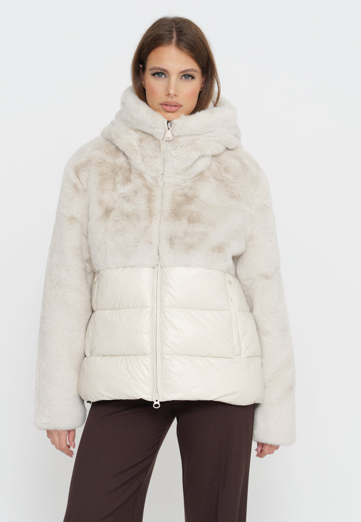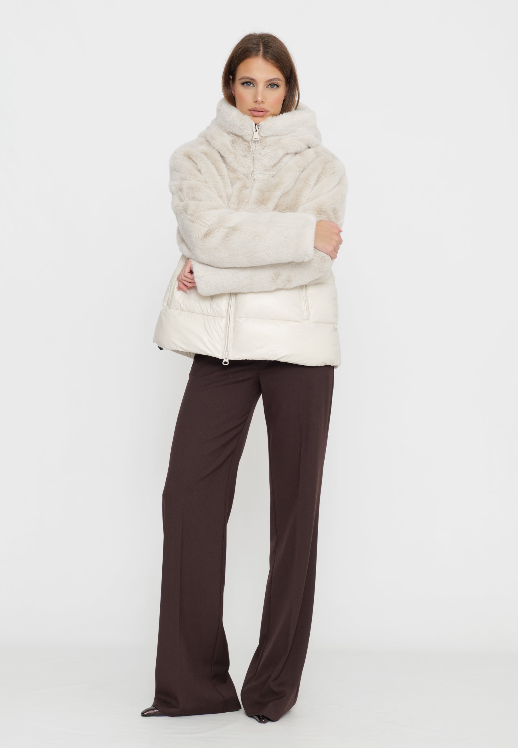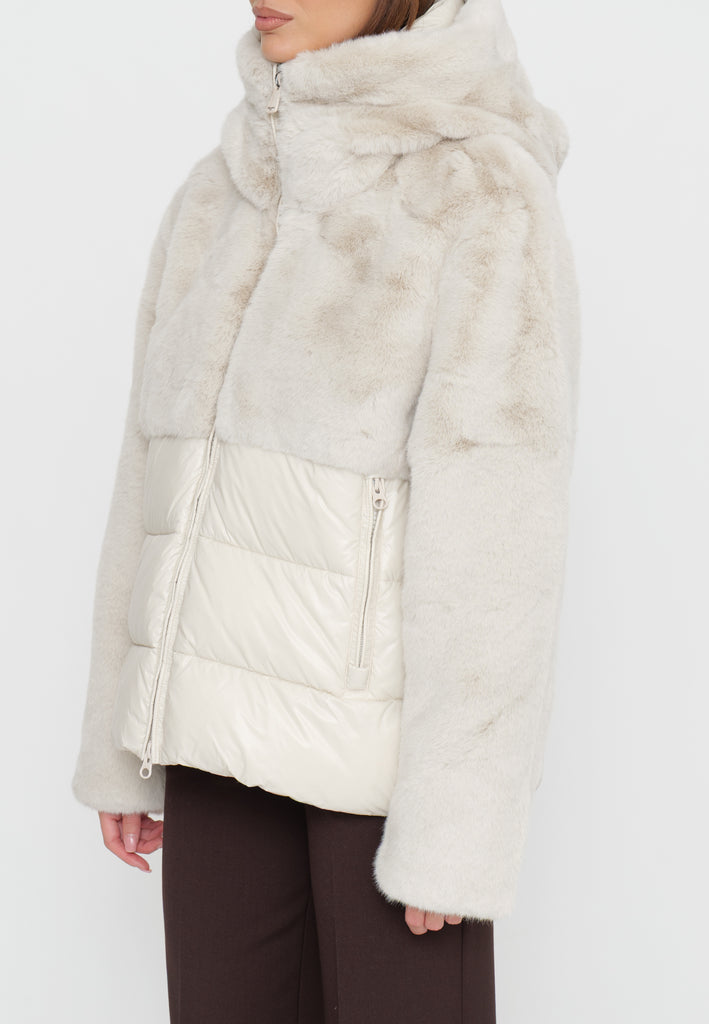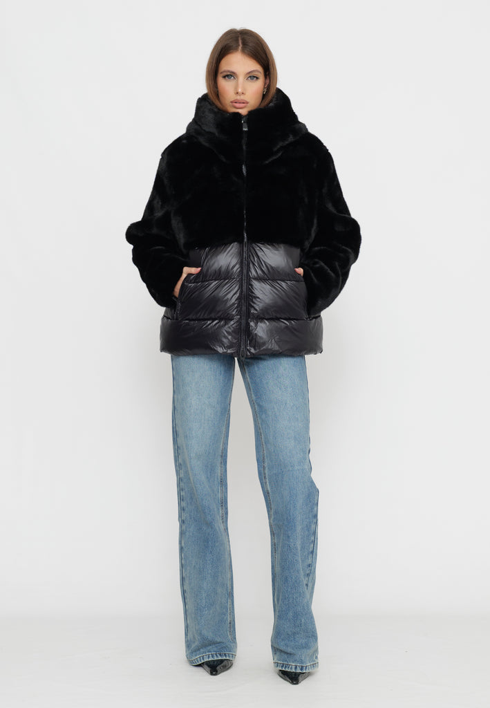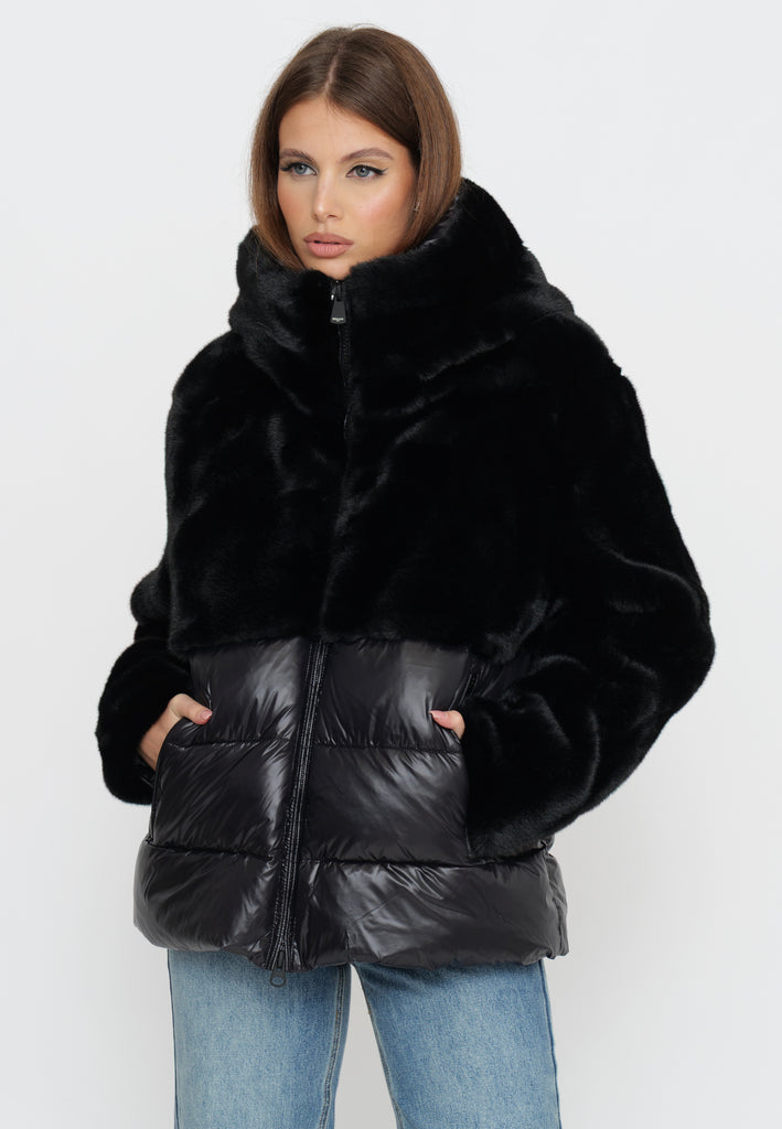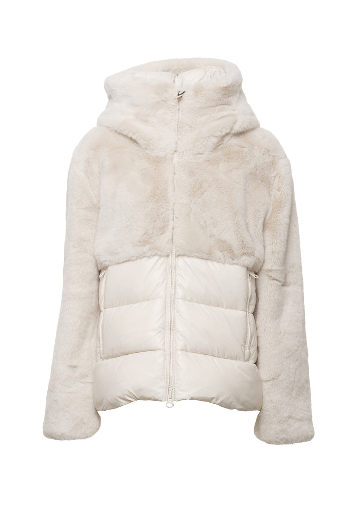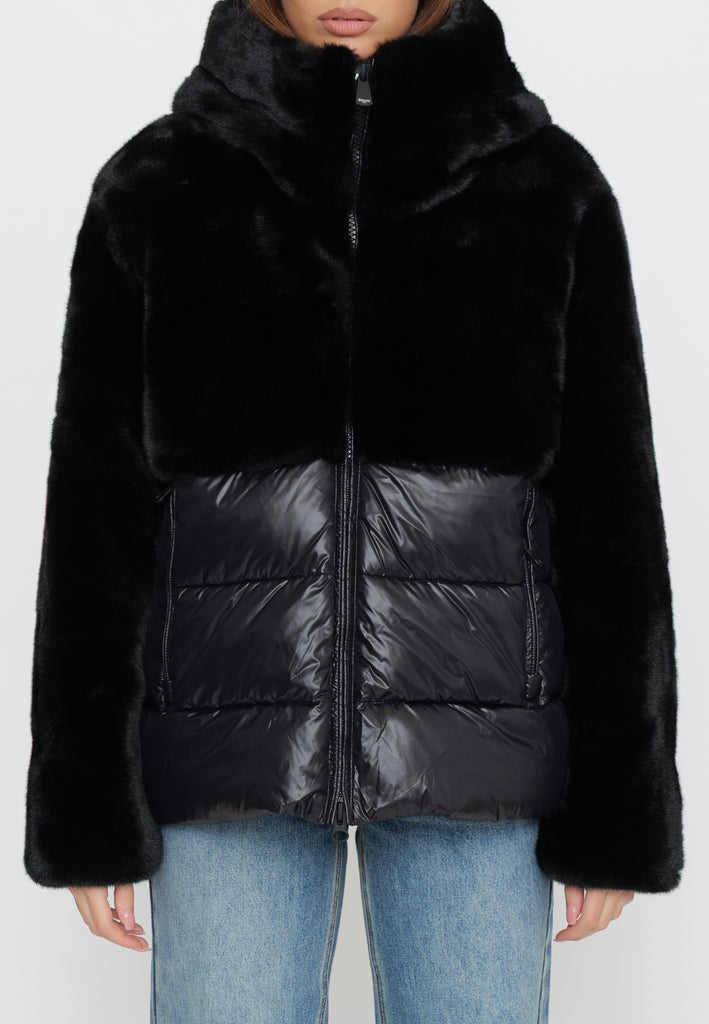Giubbotto ibrido che combina ecopelliccia nella parte superiore e nylon lucido nella parte inferiore, progettato per affrontare gli inverni più rigidi mantenendo un'estetica ricercata. Il cappuccio fisso in pelliccia ecologica con coulisse e l'imbottitura in ovatta Sorona® Aura garantiscono calore e protezione dal freddo. Realizzato in nylon e eco pelliccia, foderato internamente in nylon lucido, presenta una chiusura con zip, tasche laterali e interne con velcro, fondo manica doppio con elastico e coulisse sul fondo per una vestibilità ottimale.Giubbotto ibrido che combina ecopelliccia nella parte superiore e nylon lucido nella parte inferiore, progettato per affrontare gli inverni più rigidi mantenendo un'estetica raffinata. Il cappuccio fisso in pelliccia ecologica con coulisse e l'imbottitura in ovatta Sorona® Aura garantiscono calore ottimale, mentre le cuciture orizzontali aggiungono carattere visivo. Dotato di chiusura zip, tasche con zip e copri cursore, fondo manica doppio con elastico interno e tasche interne con velcro per praticità. La fodera in nylon lucido tono su tono assicura comfort e durabilità. Un capo versatile che non compromette lo stile anche nelle condizioni meteorologiche più severe.