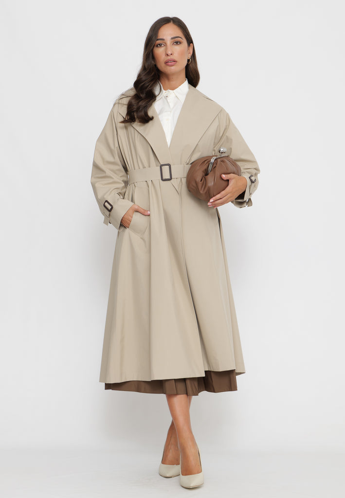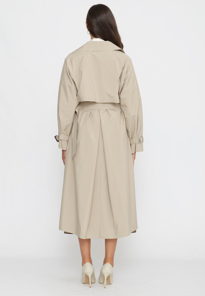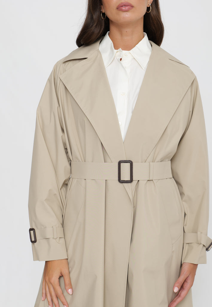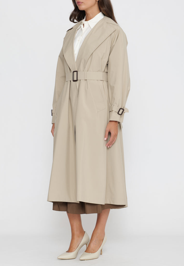Trench lungo dalla linea morbida con mantellina e spacco centrale sul retro. Realizzato in tela antigoccia, ideale per proteggersi dalle intemperie senza rinunciare allo stile.