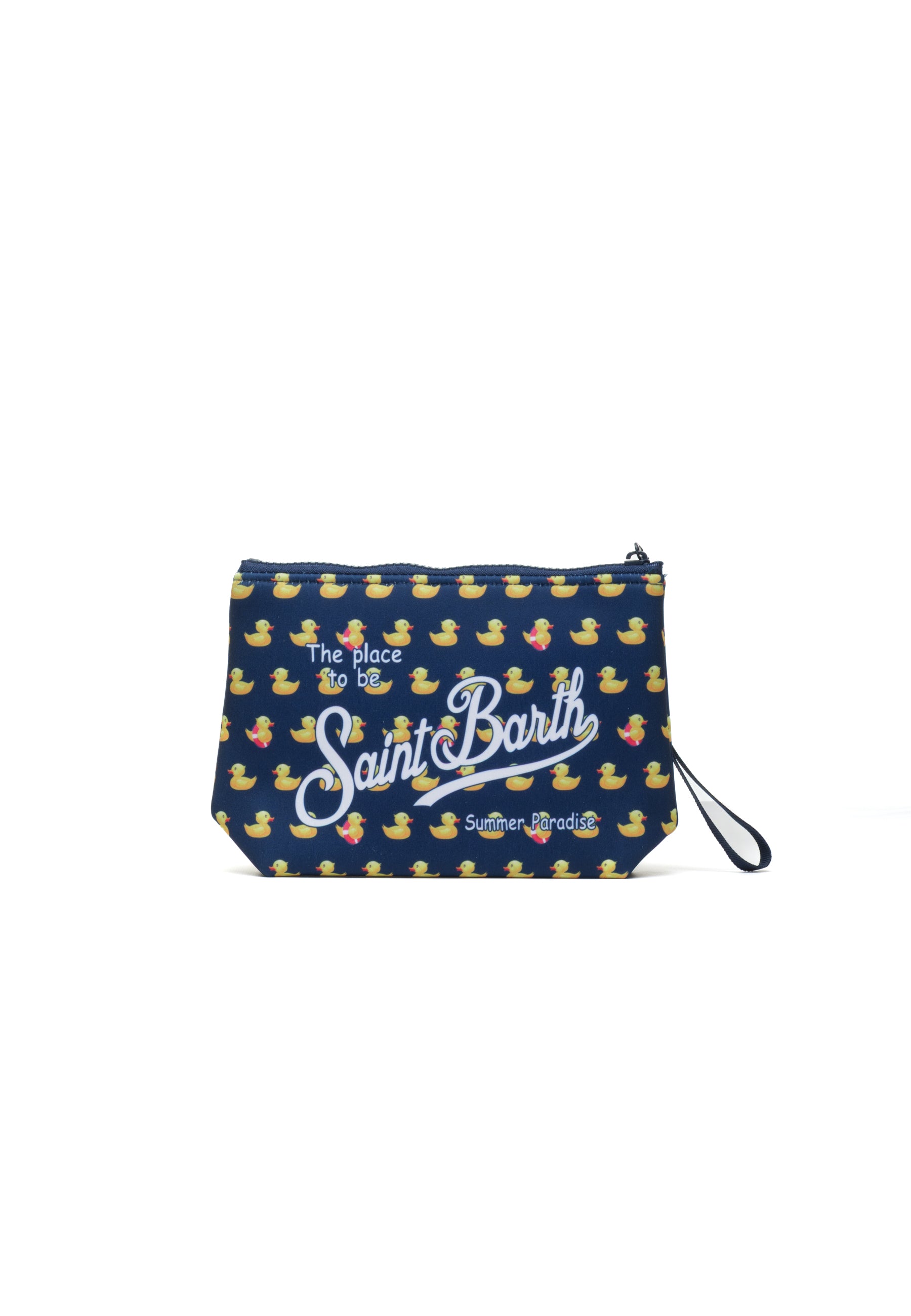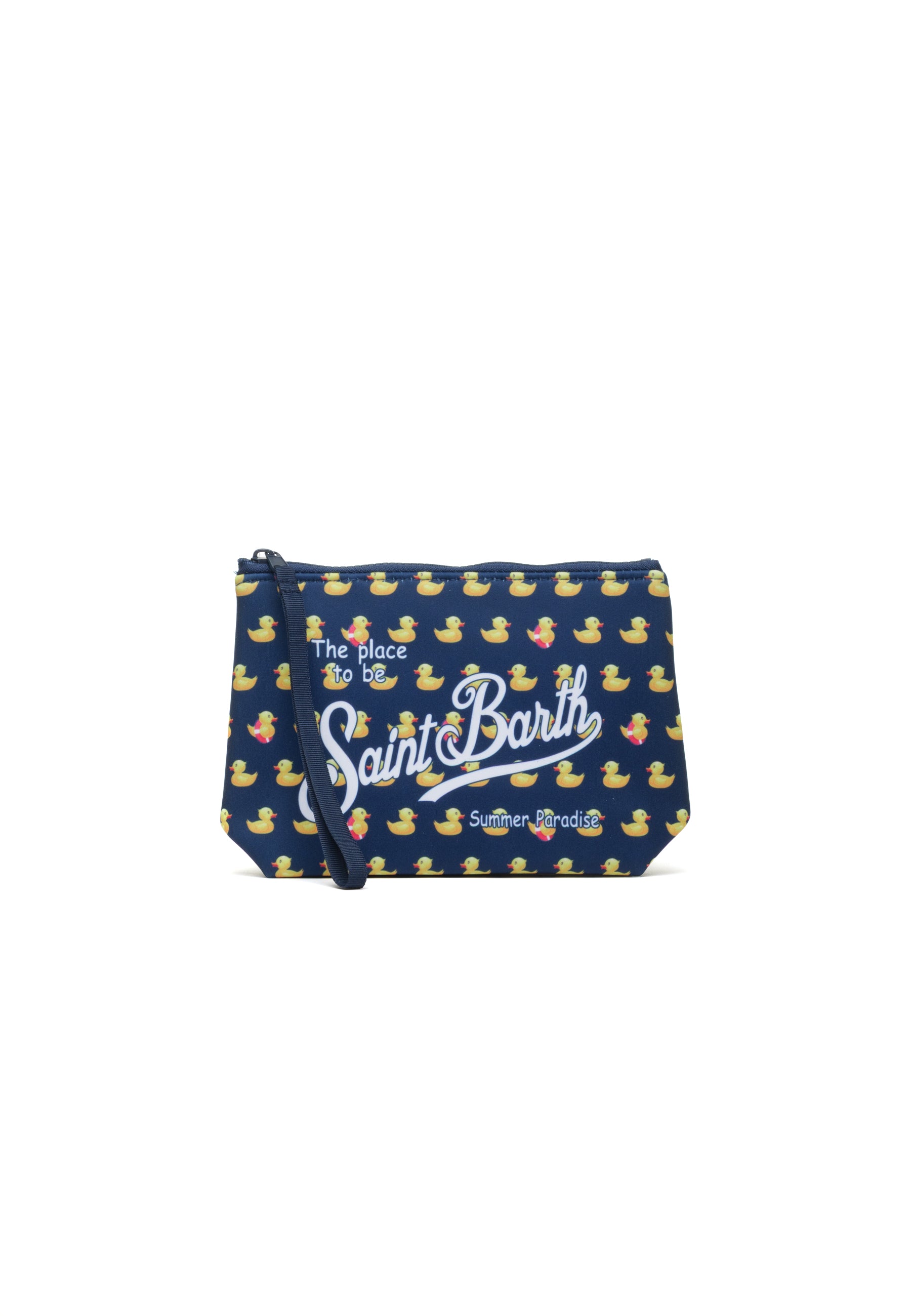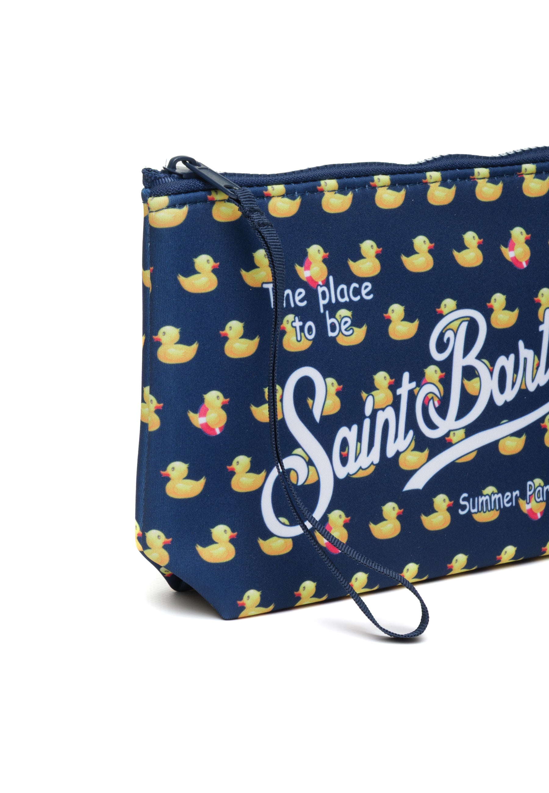 La pochette Aline è pratica e versatile dal design contemporaneo. Realizzata in tessuto scuba, presenta una stampa all-over con paperelle che dona un tocco giocoso e ironico. Dotata di chiusura con zip e laccetto laterale in gros grain, è perfetta per organizzare l'essenziale con stile, facile da abbinare e utilizzare in ogni occasione.