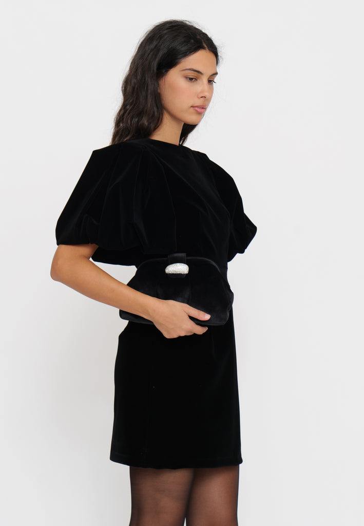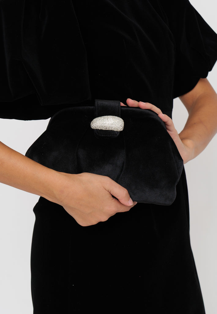 La clutch Aludra unisce eleganza e praticità, realizzata in velluto nero morbido per un tocco raffinato. La patta è impreziosita da una fibbia gioiello che dona un dettaglio distintivo, mentre la chiusura calamitata garantisce sicurezza e facilità d'uso. Dotata di tracolla interna, consente un utilizzo versatile, da mano o a spalla, ideale per occasioni speciali.