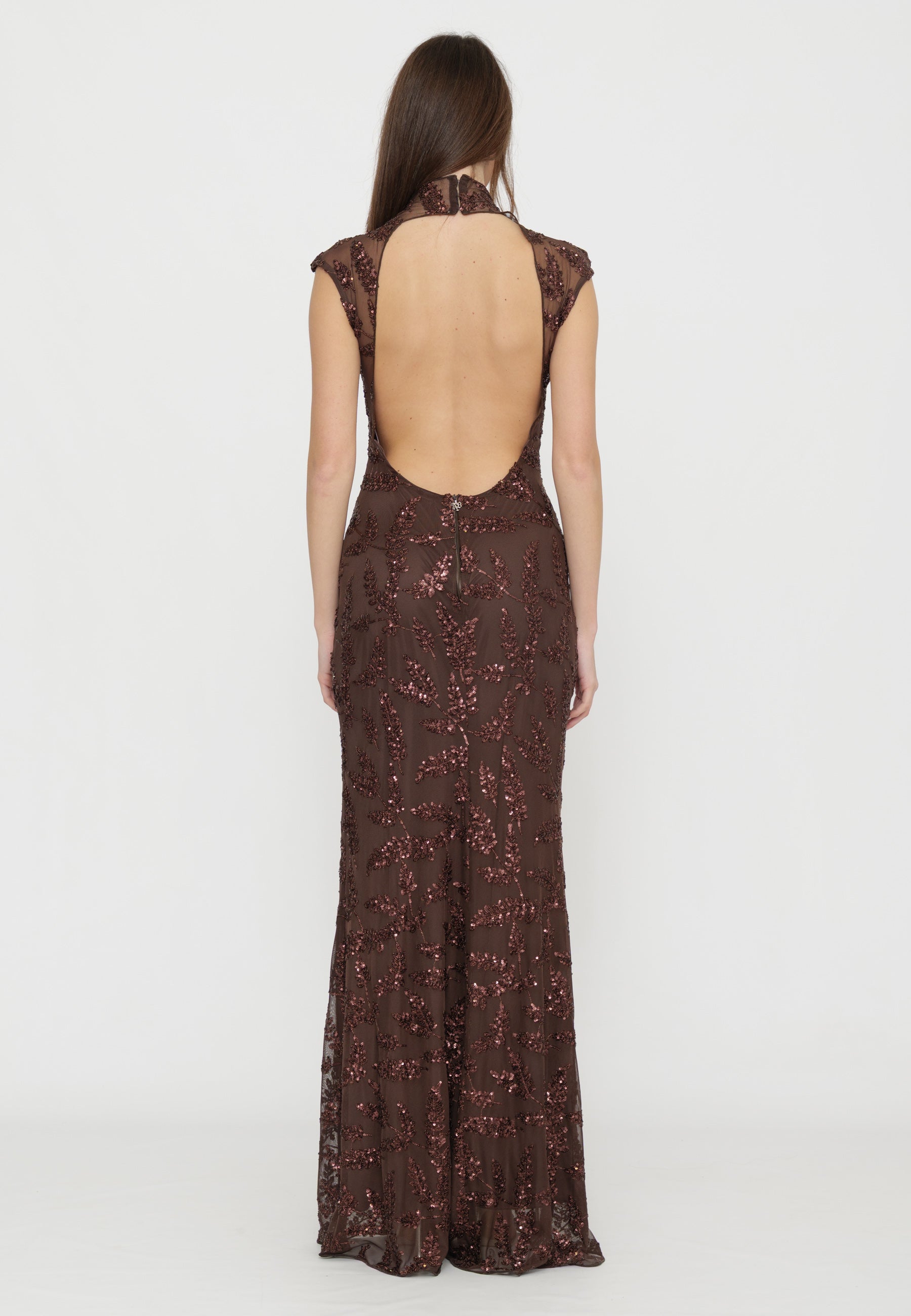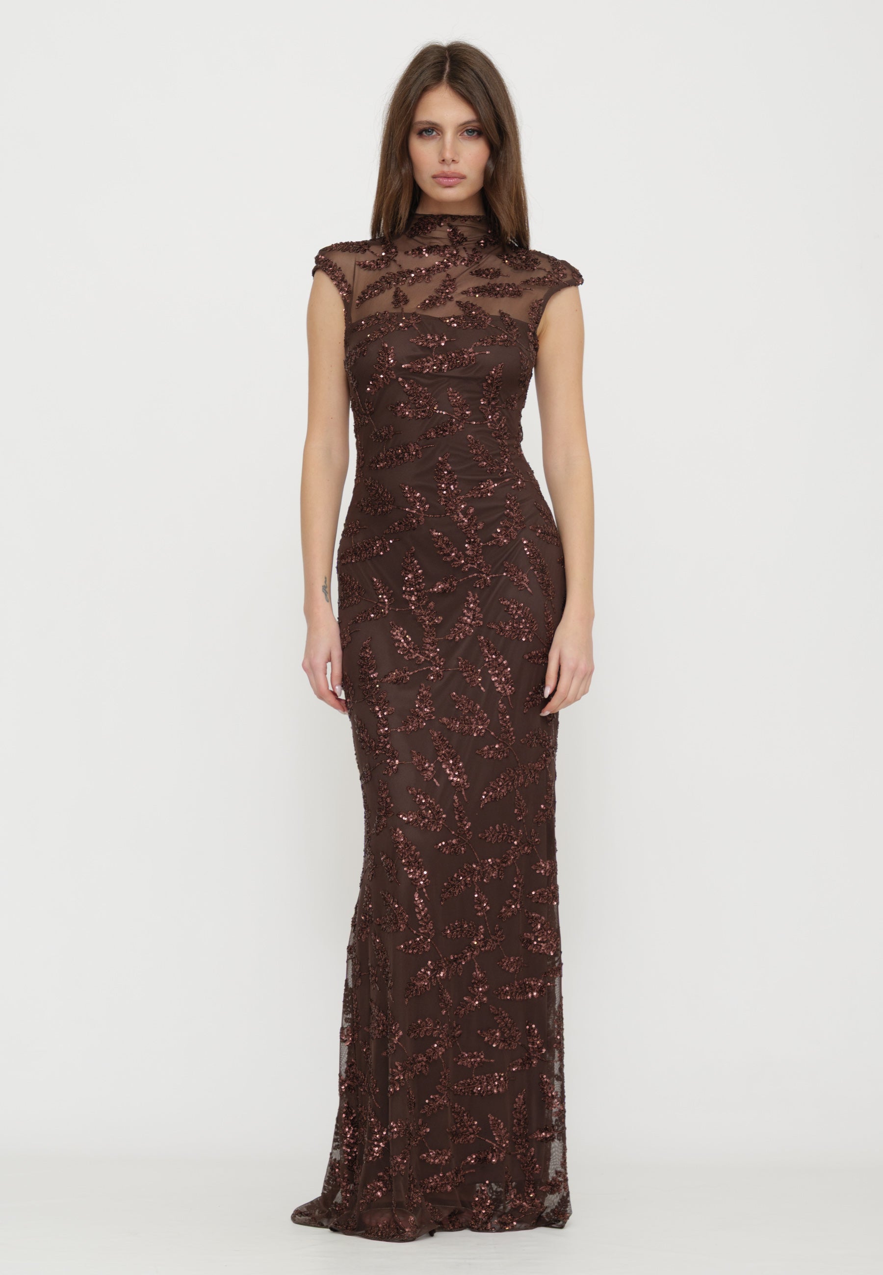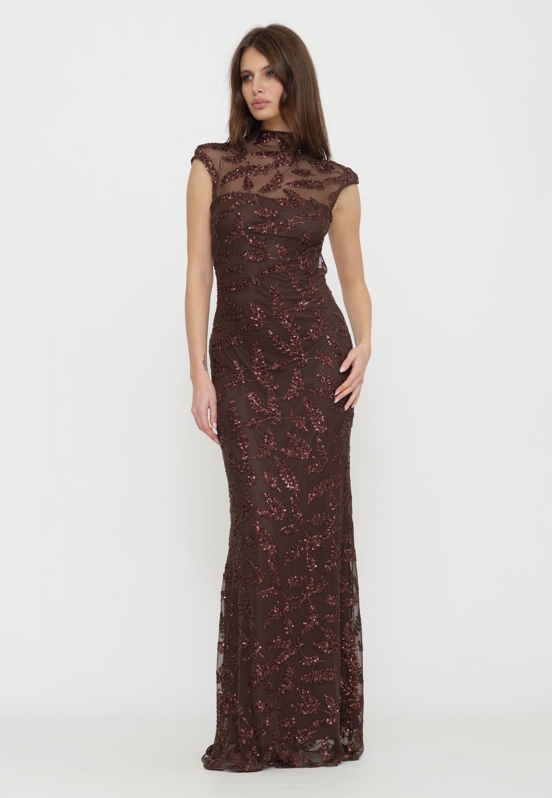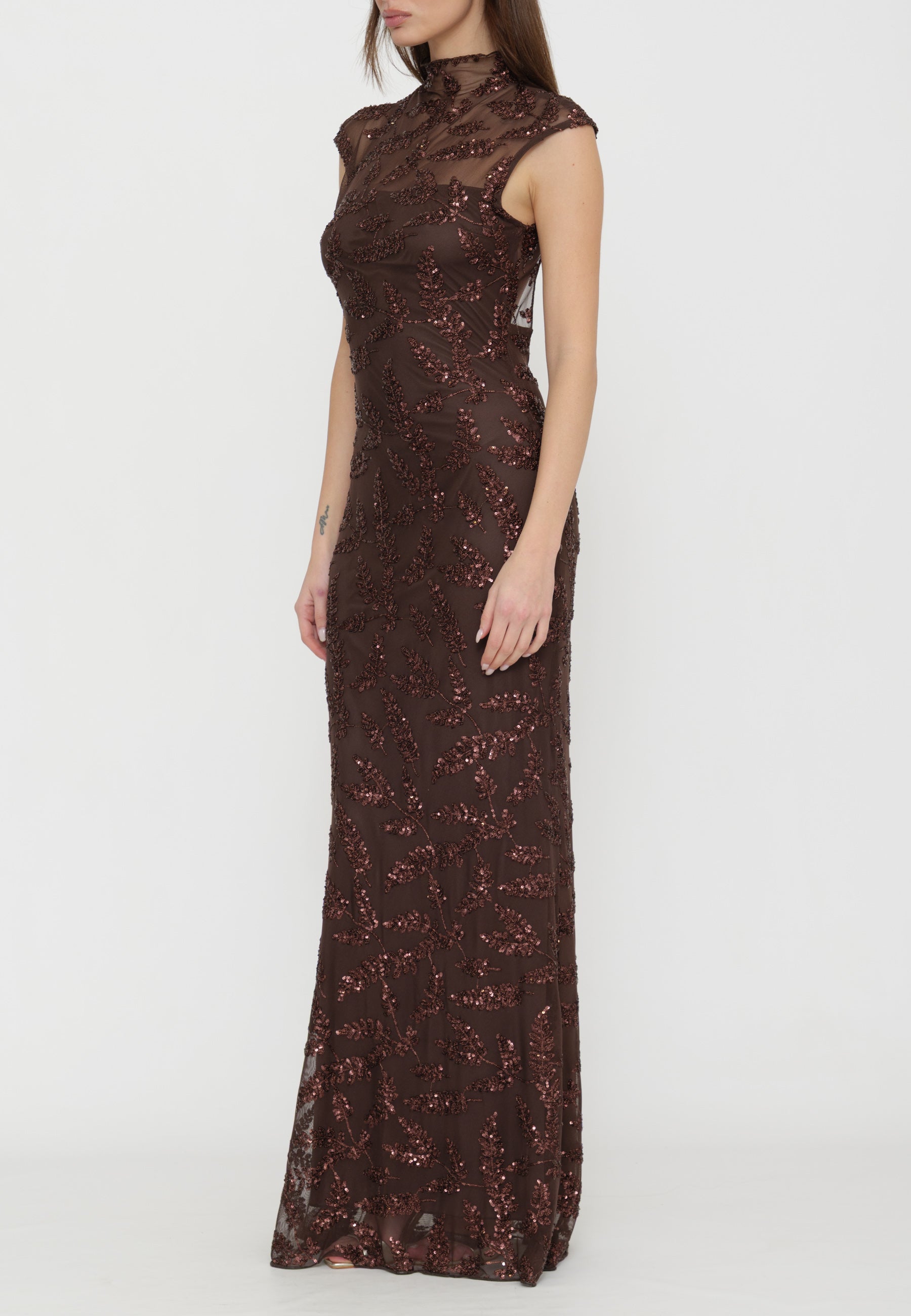 Abito lungo aderente in tulle ricamato con paillettes all over che cattura la luce ad ogni movimento. La sottoveste integrata assicura una vestibilità perfetta e comfort durante tutta la serata. Un capo sofisticato e affascinante, ideale per occasioni speciali e momenti indimenticabili.