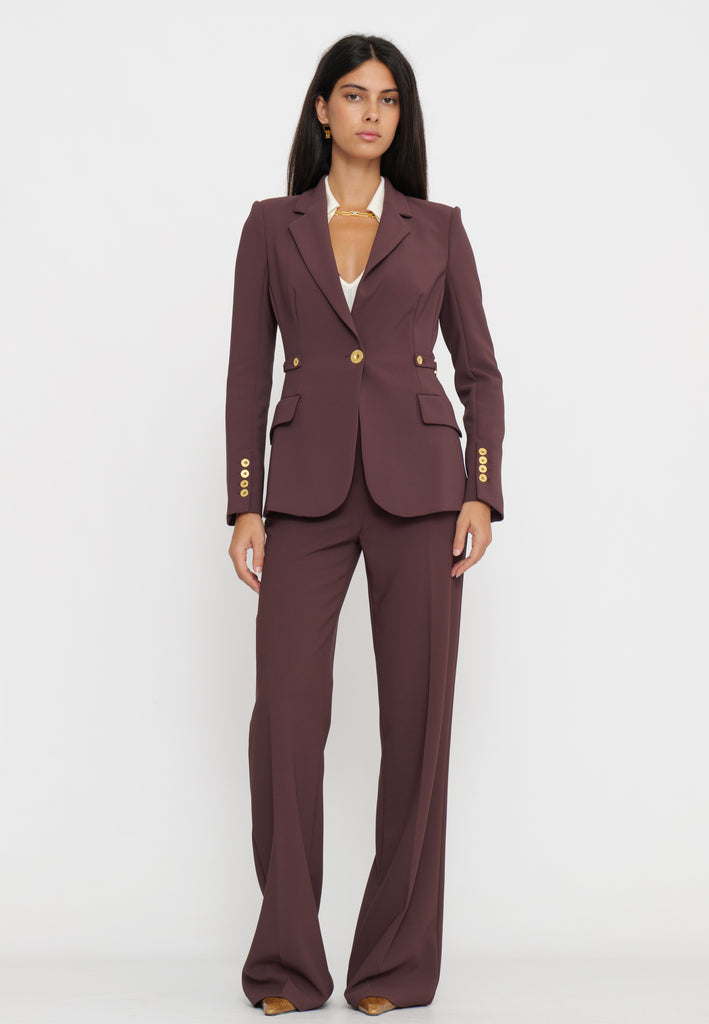 Questi pantaloni in crêpe offrono una vestibilità regular ideale per garantire comfort e stile. La piega centrale valorizza la silhouette, mentre le tasche alla francese assicurano praticità senza rinunciare all’eleganza. I dettagli in metallo dorato sui fianchi e sul retro della vita arricchiscono il capo, conferendogli un tocco sofisticato e distintivo. Perfetti per un look curato e contemporaneo.