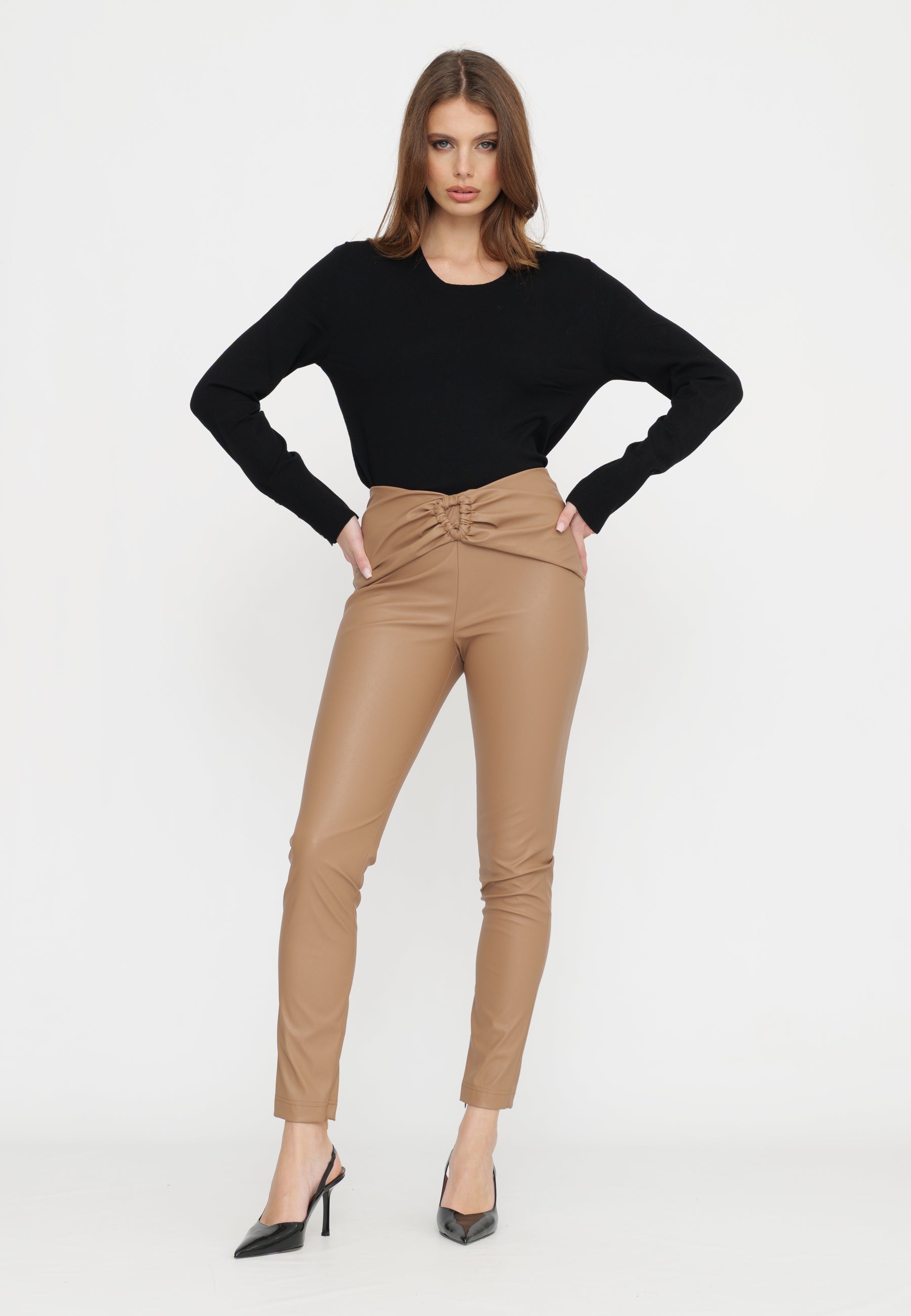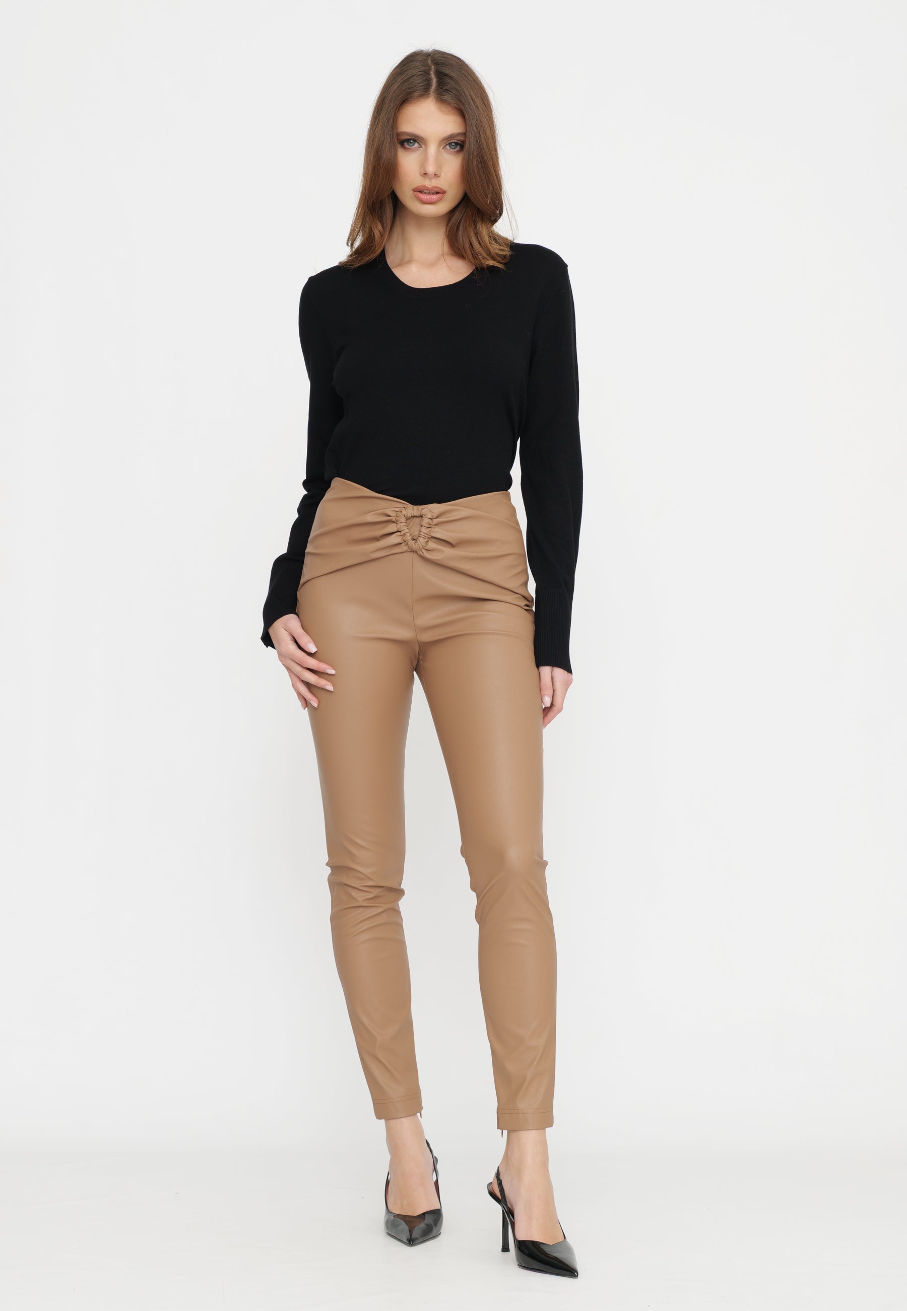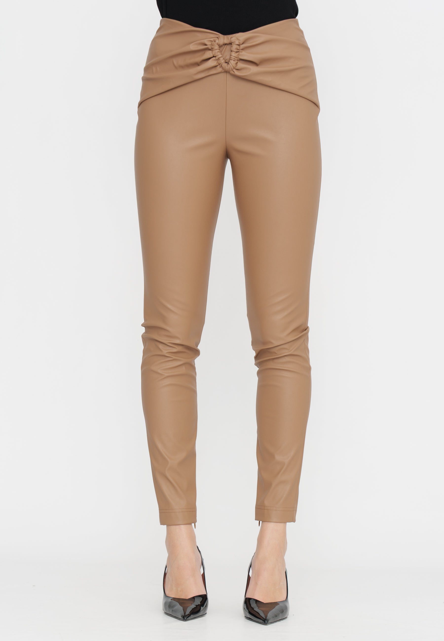 PANTALONE SKINNY CON DRAPPEGGIO IN TESSUTO ECOPELLE SUPERSTRETCH TRASPIRANTE