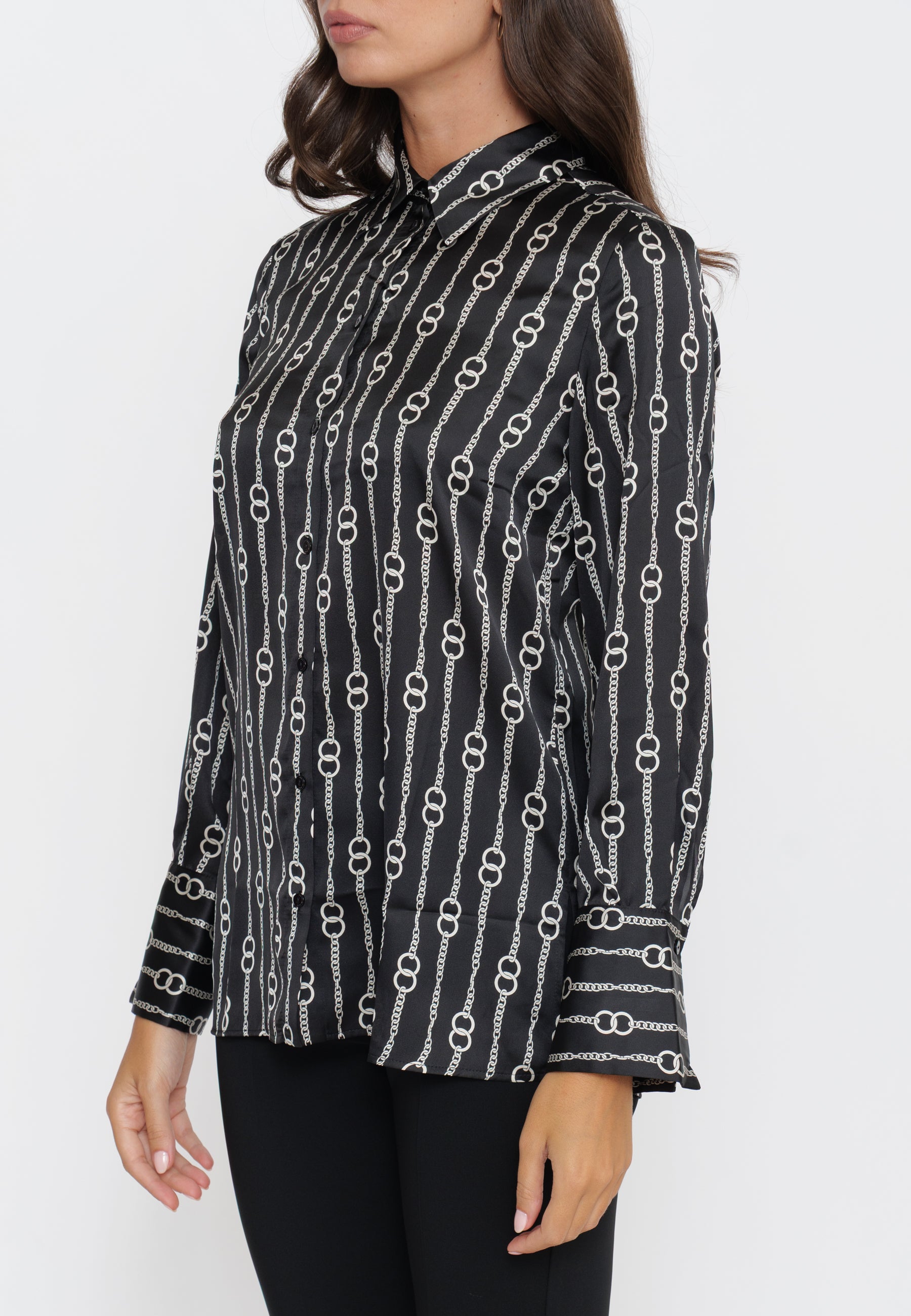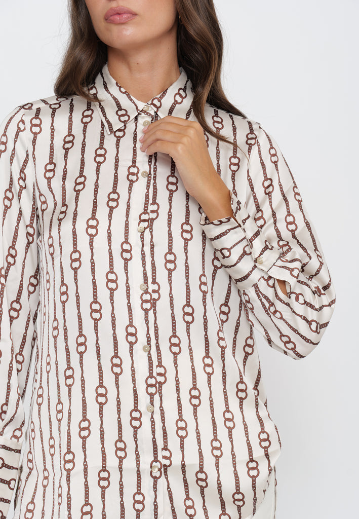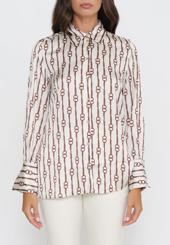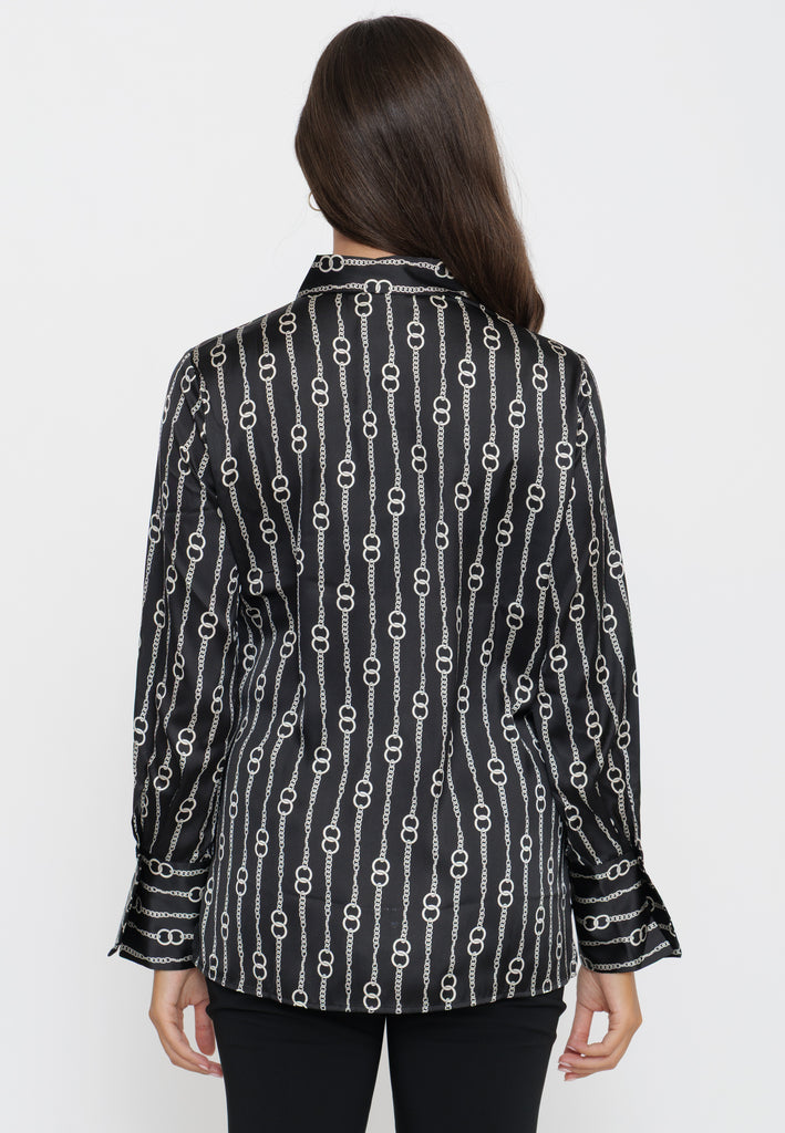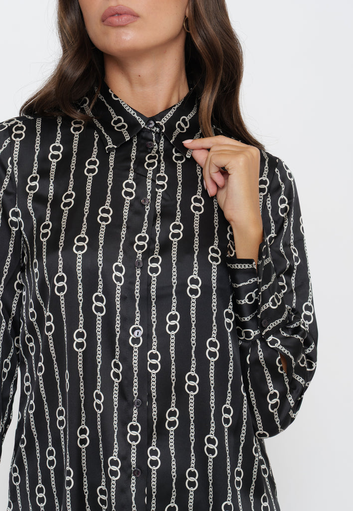 Elegante camicia in raso con fantasia ricercata. Il tessuto lucido e morbido valorizza ogni movimento. Perfetta per occasioni importanti o per aggiungere un tocco di classe a un outfit quotidiano.