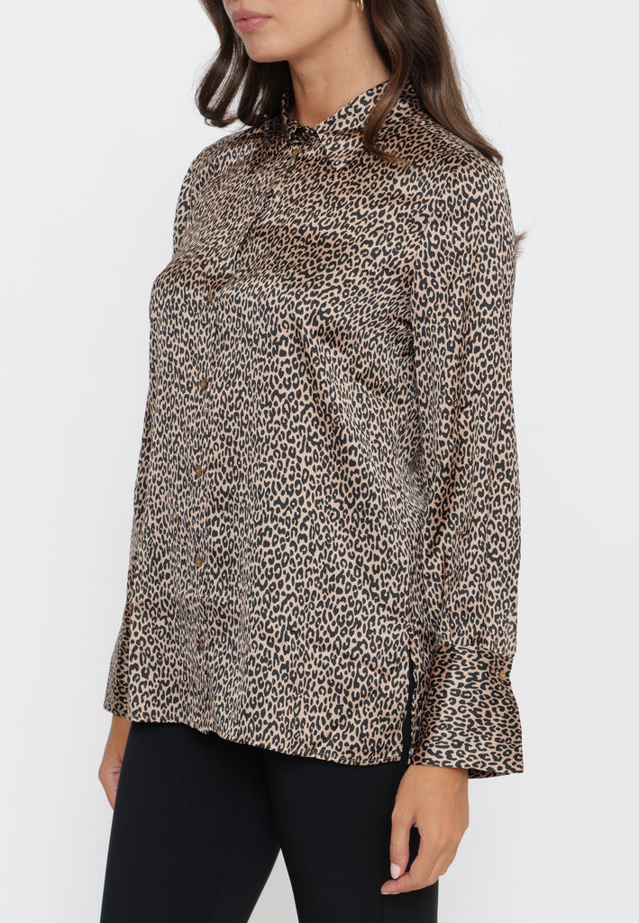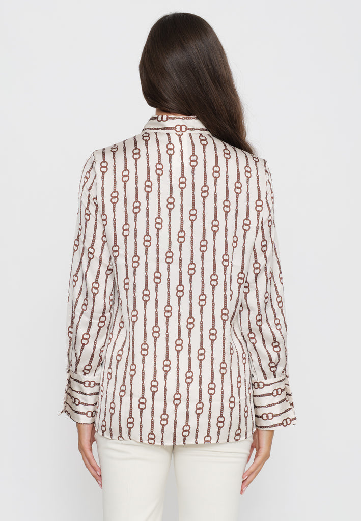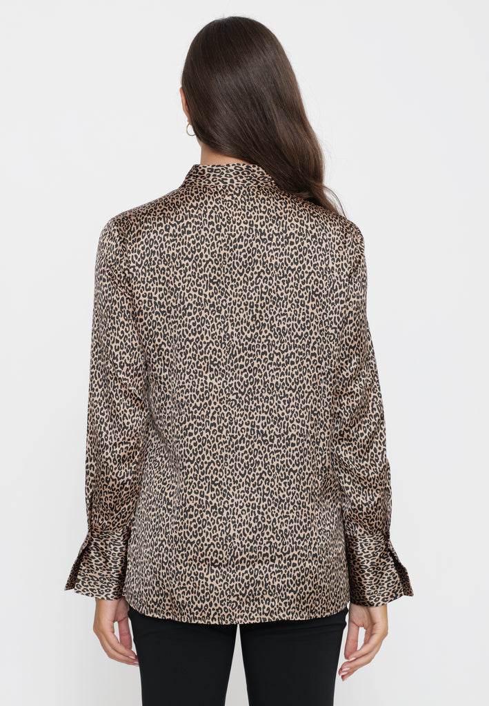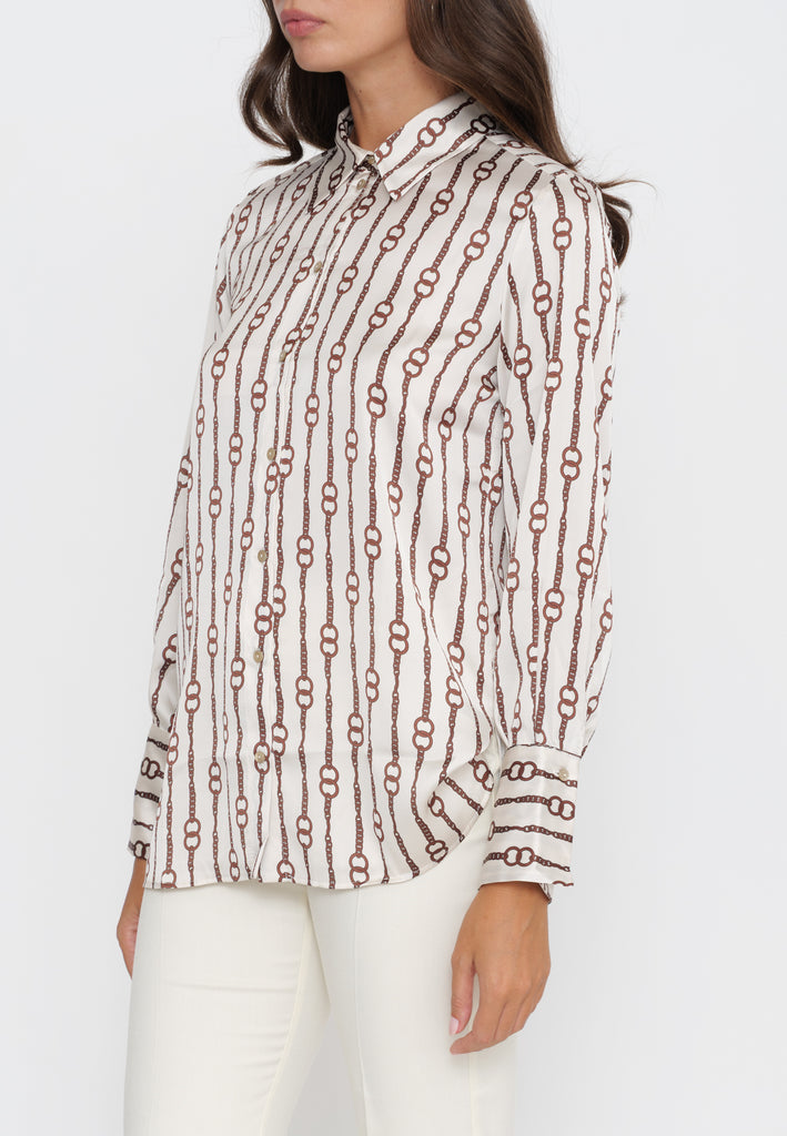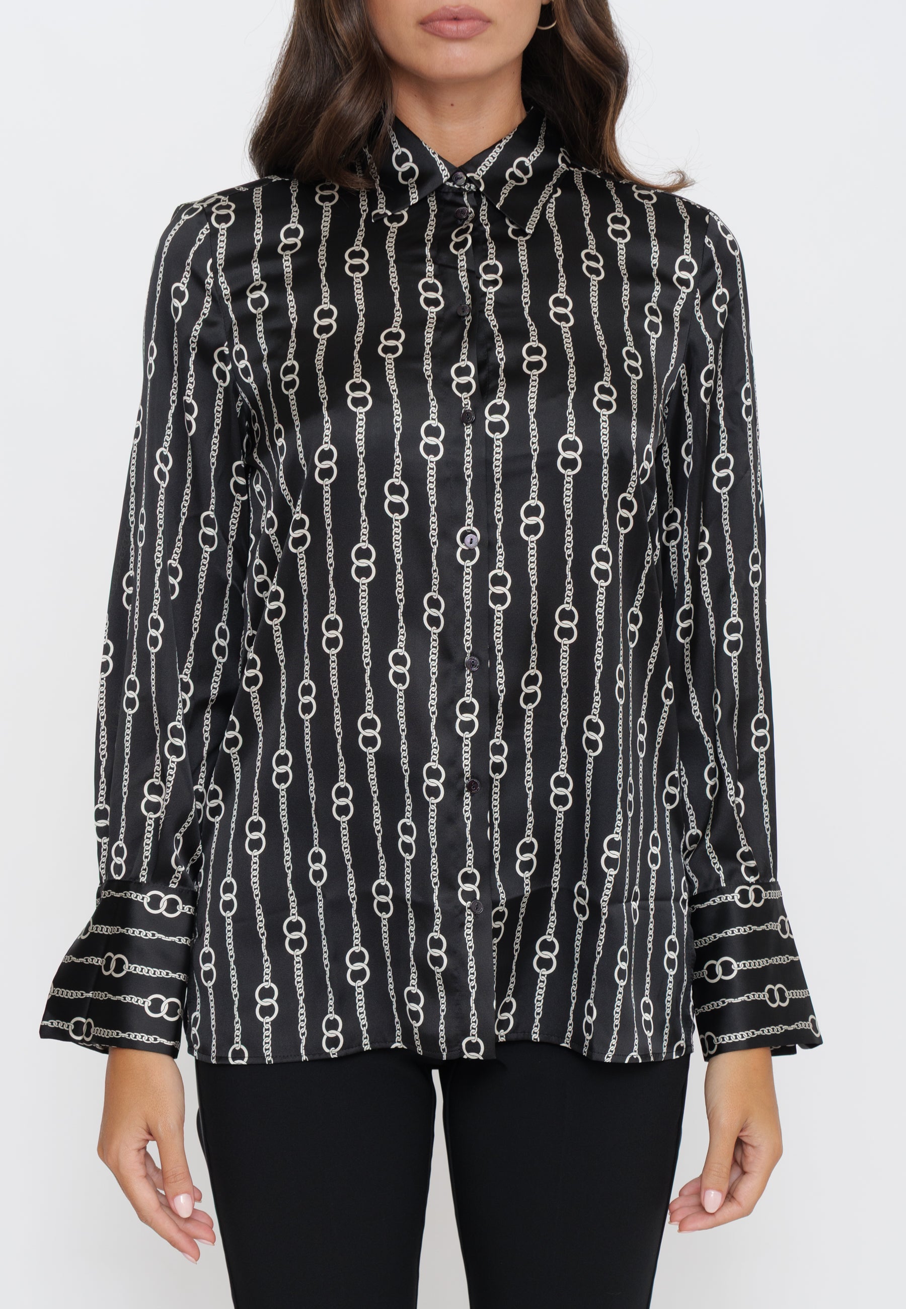 Elegante camicia in raso con fantasia ricercata. Il tessuto lucido e morbido valorizza ogni movimento. Perfetta per occasioni importanti o per aggiungere un tocco di classe a un outfit quotidiano.