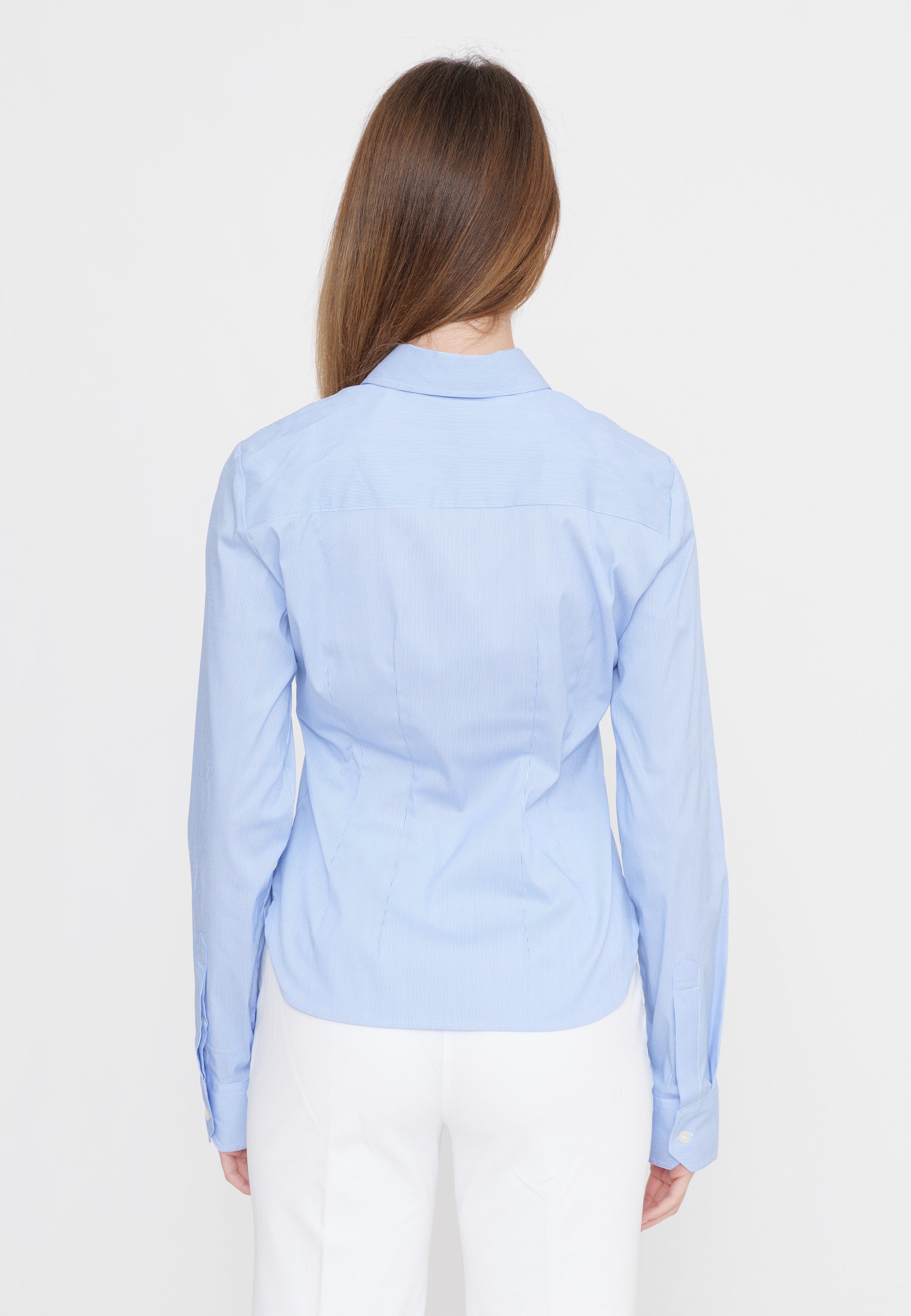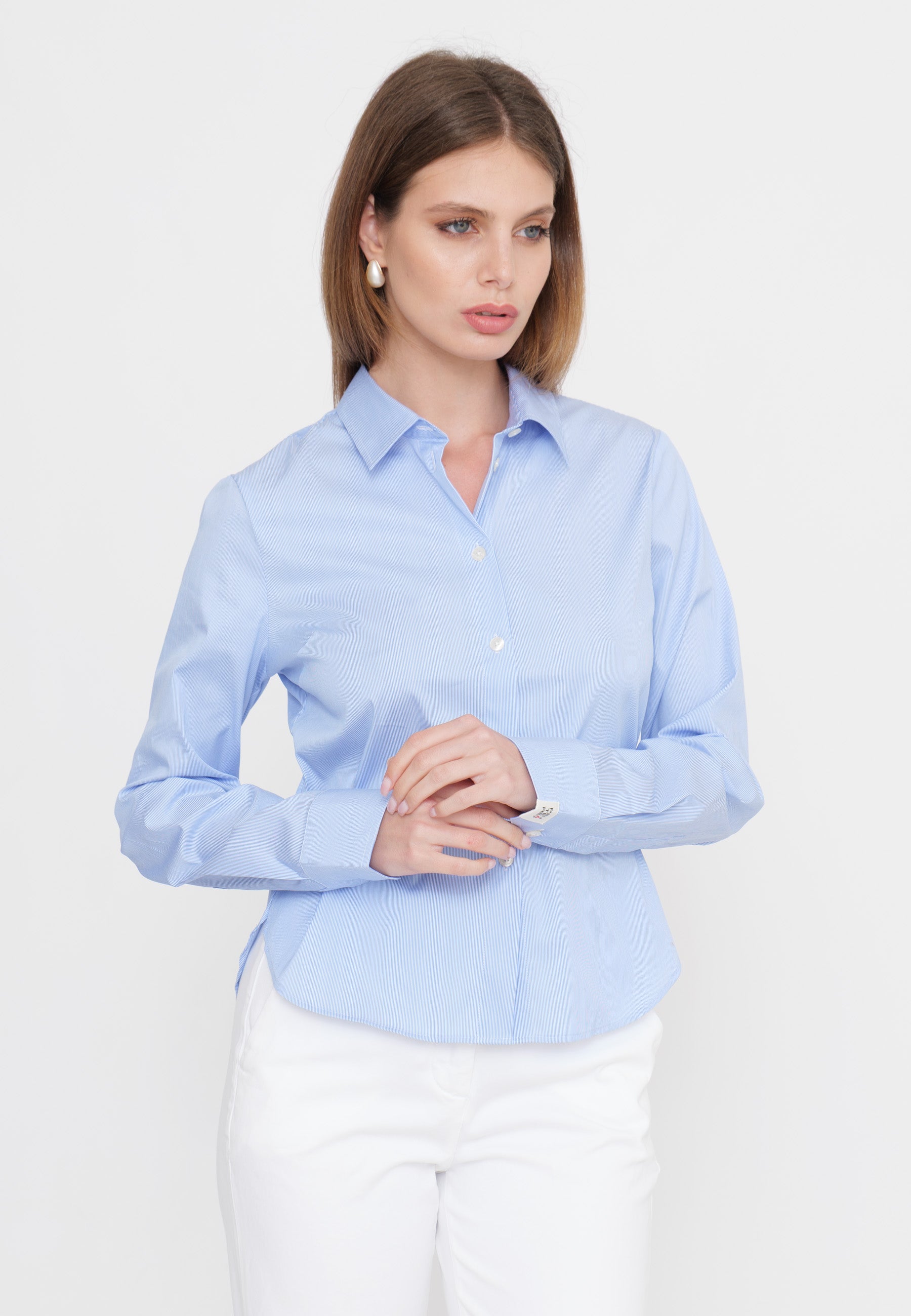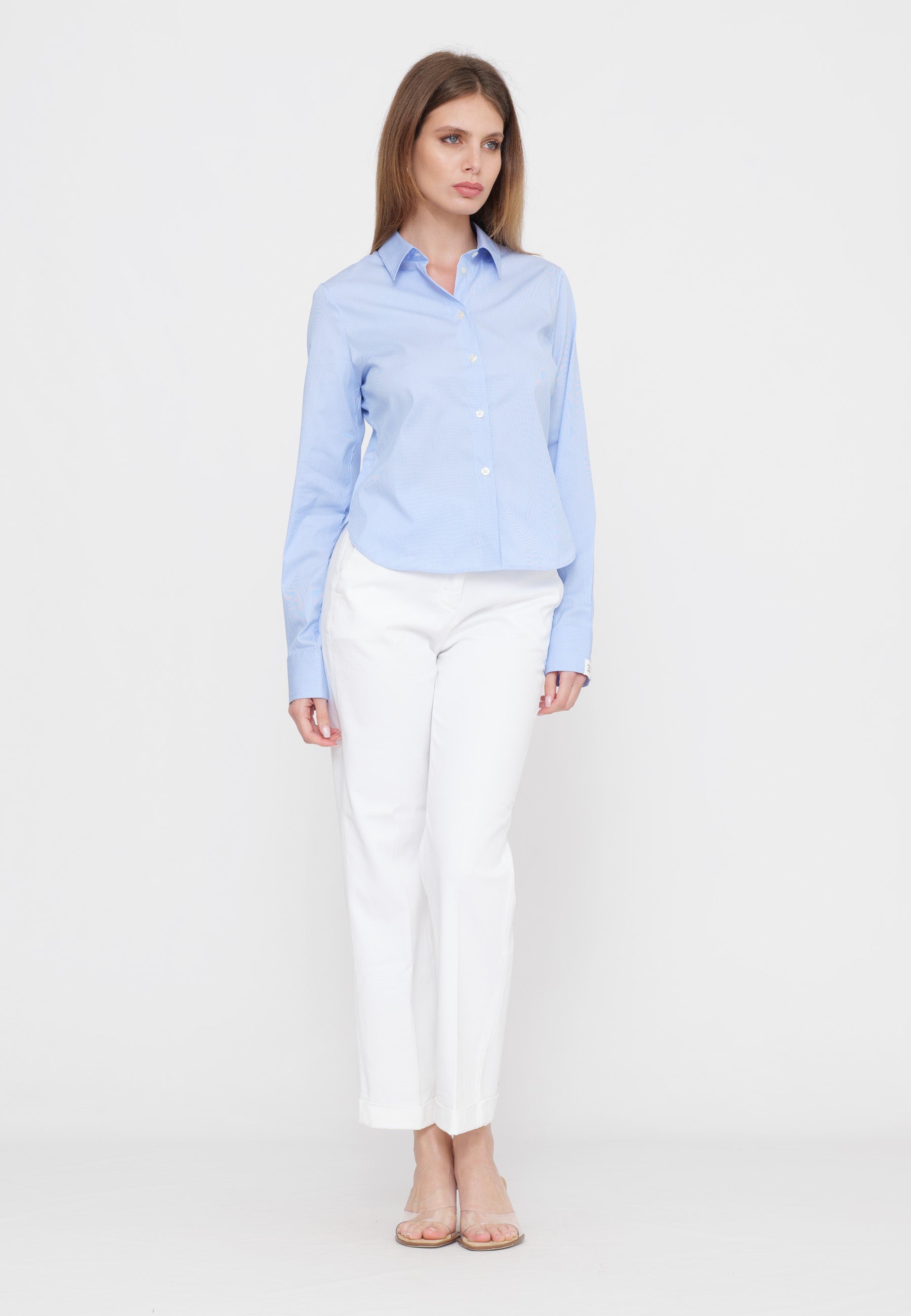 Camicia in twill fantasia a righe, colletto italiano, manica lunga e polsini con bottone, chiusura centrale con bottoni. Vestibilità regolare.