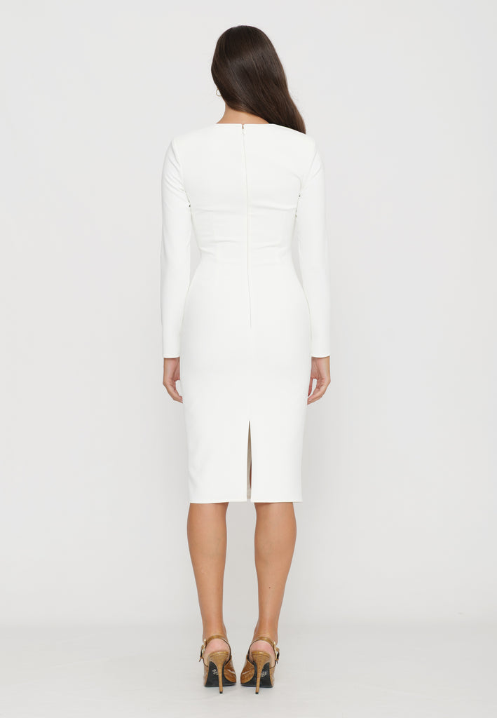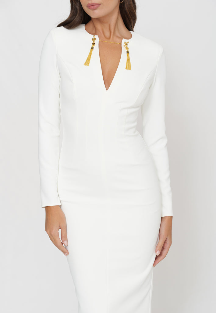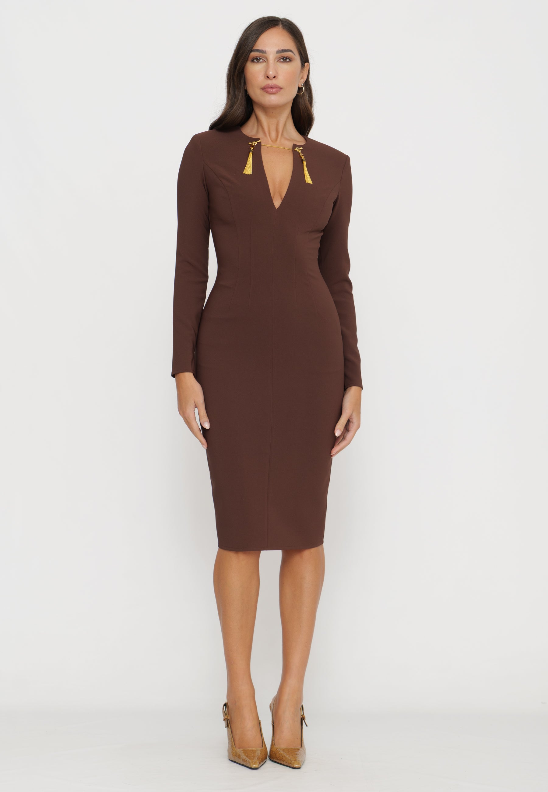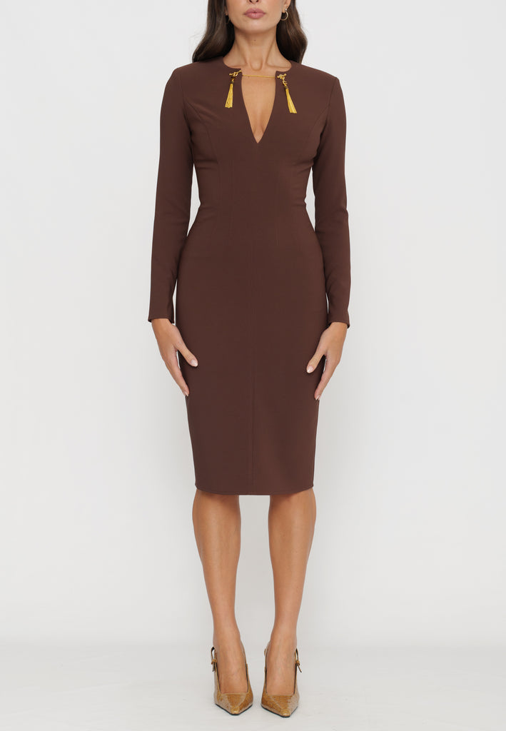 Questo abito in crêpe leggero a vestibilità slim combina eleganza e modernità. Le spalle strutturate donano definizione, mentre il girocollo con scollo a V impreziosito da gemelli a catena con nappine in trama snake, rimovibili per varie combinazioni di stile, aggiunge un tocco distintivo. La cintura con logo valorizza il punto vita, e lo spacco posteriore crea una silhouette audace e sofisticata, perfetta per chi cerca un capo raffinato e versatile.