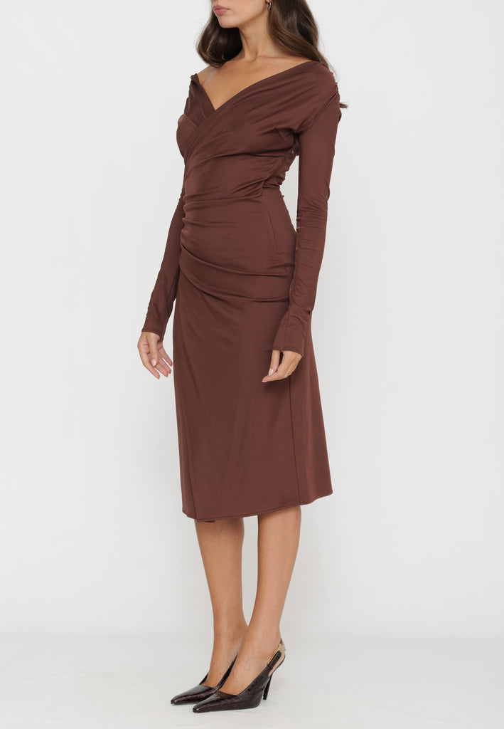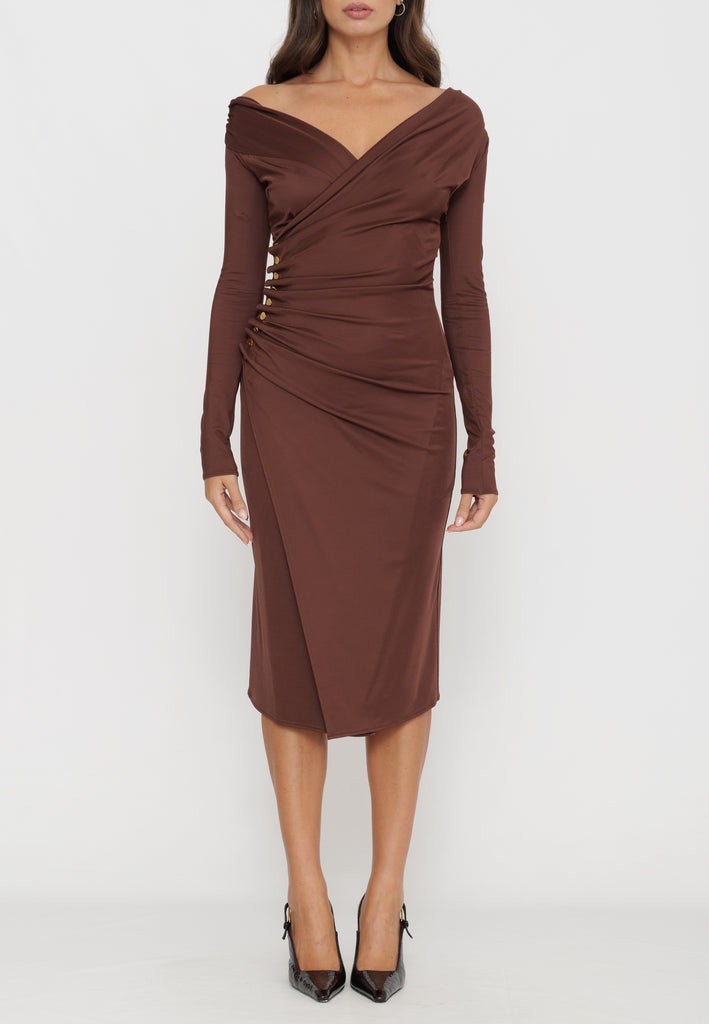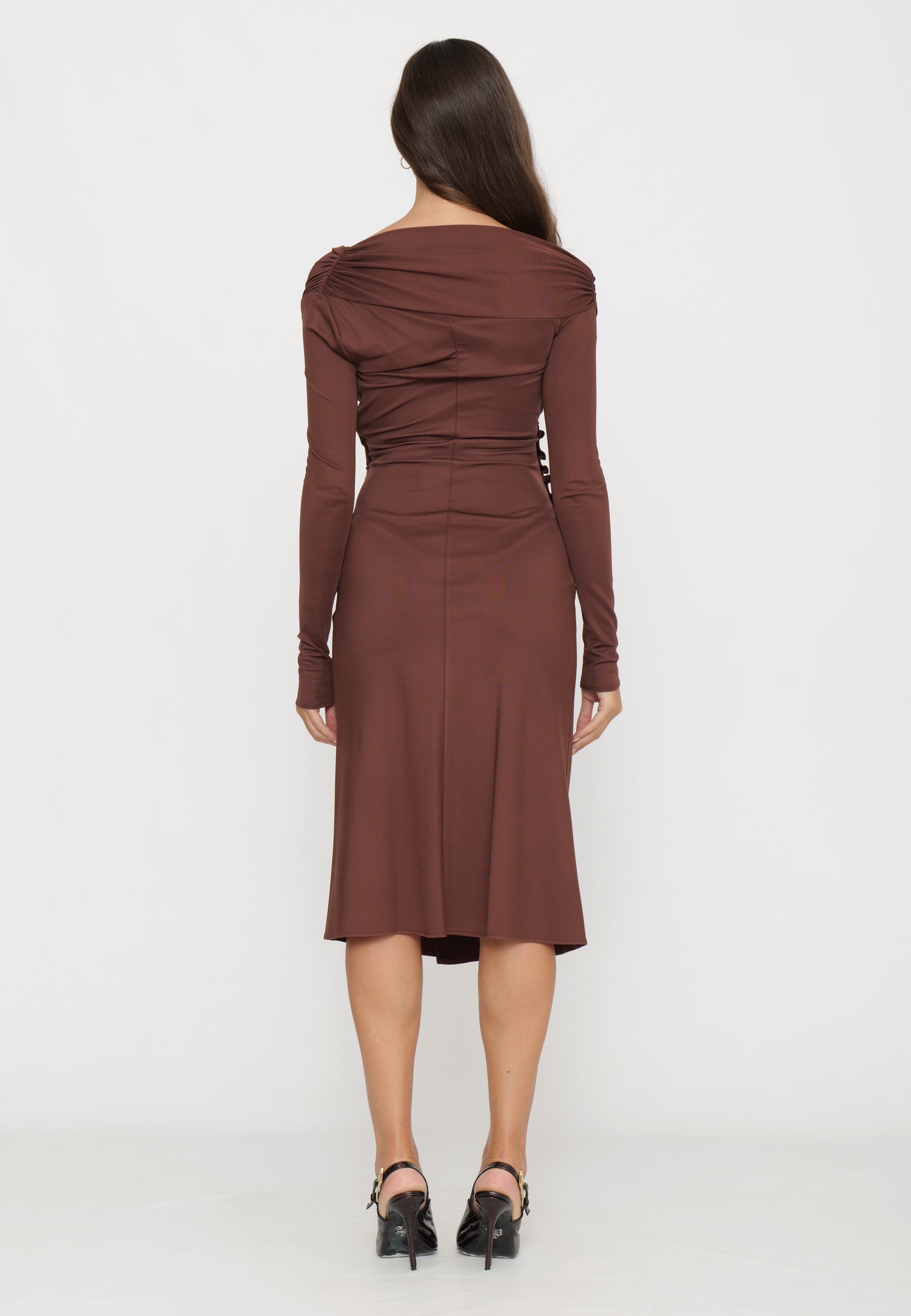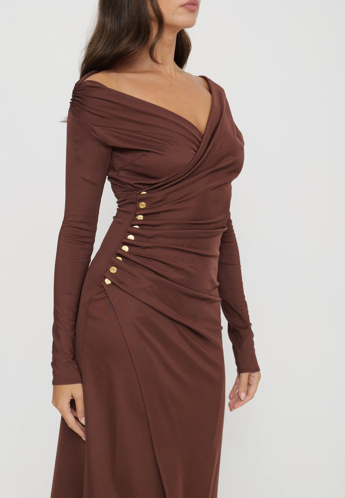 Questo abito in jersey dalla vestibilità aderente combina eleganza e modernità grazie allo scollo asimmetrico e all’elaborato drappeggio laterale, arricchito da raffinati bottoni in metallo dorato che aggiungono profondità e dettaglio. Le maniche lunghe garantiscono un comfort avvolgente, mentre lo spacco laterale enfatizza una nota di audace femminilità. Una scelta sofisticata per valorizzare la silhouette con stile e carattere.