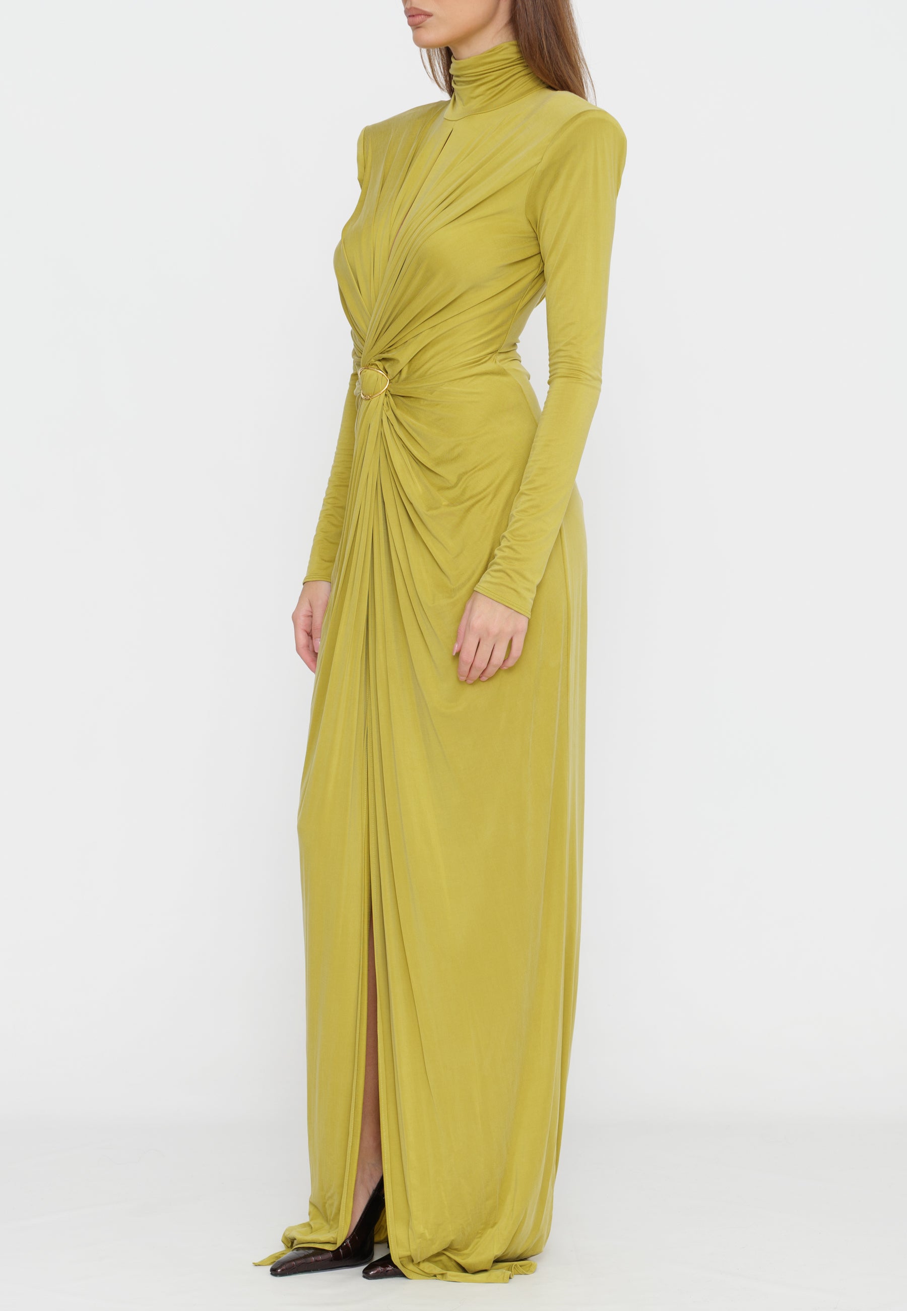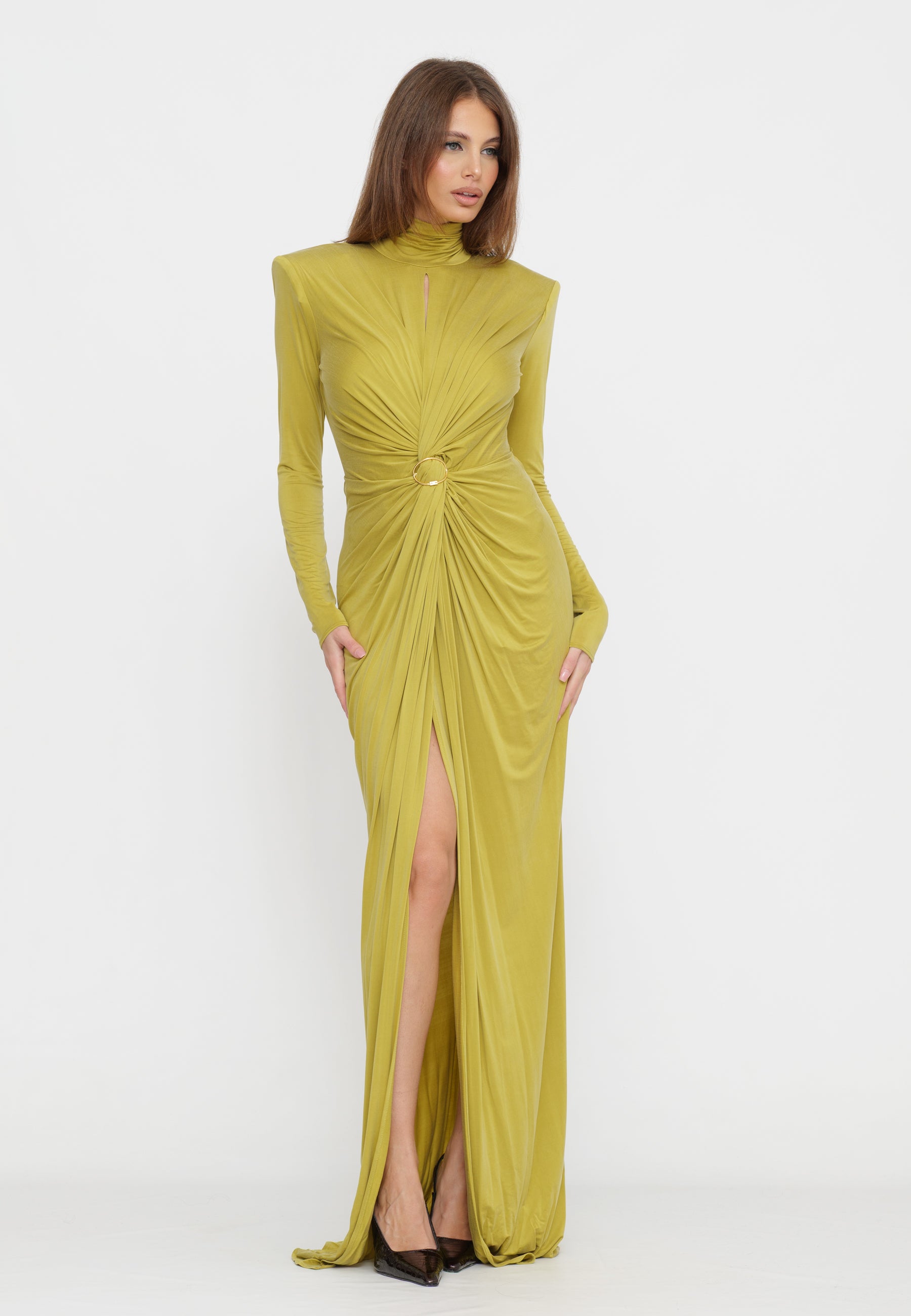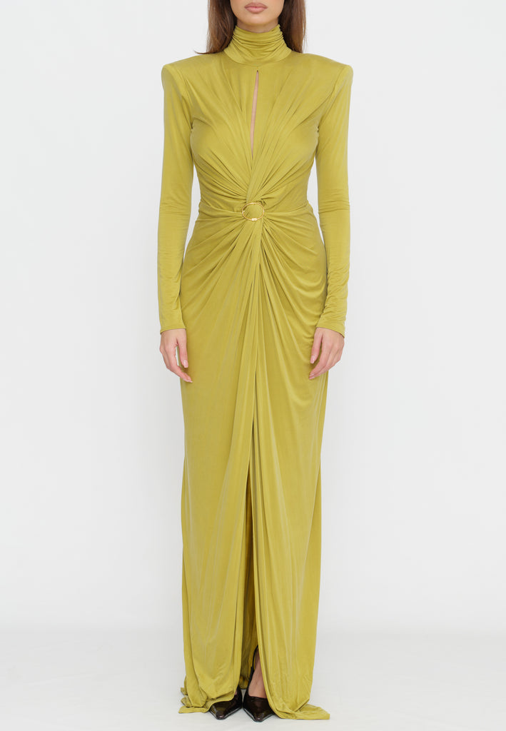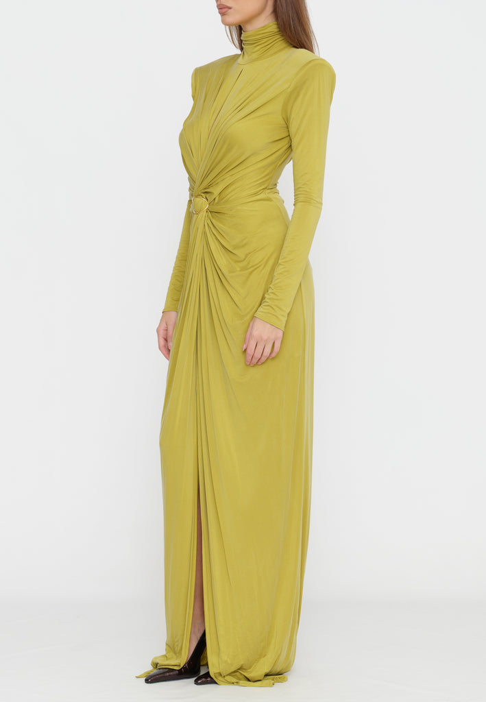 Abito da sera in jersey di cupro che abbina eleganza e movimento. La silhouette aderente è valorizzata da un collo alto e maniche lunghe, mentre i drappeggi frontali trattenuti da un accessorio in metallo dorato con logo creano un dettaglio sofisticato. Lo spacco anteriore e la goccia posteriore donano leggerezza e fluidità al capo, perfetto per occasioni speciali dove il design ricercato fa la differenza.