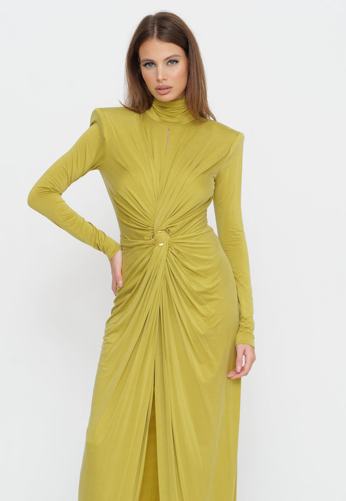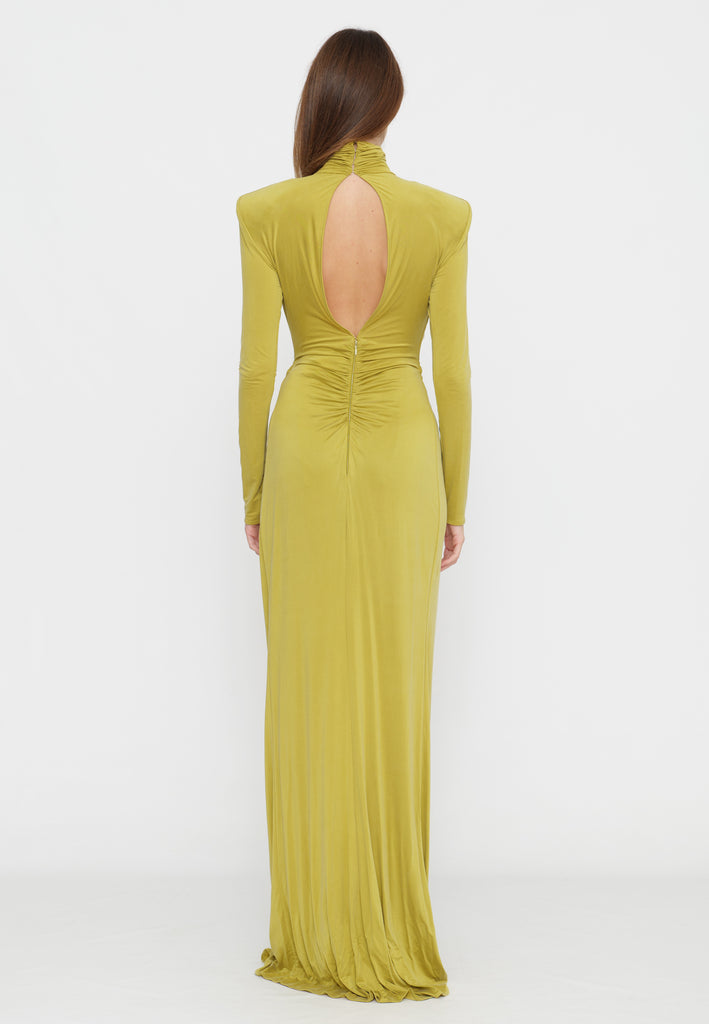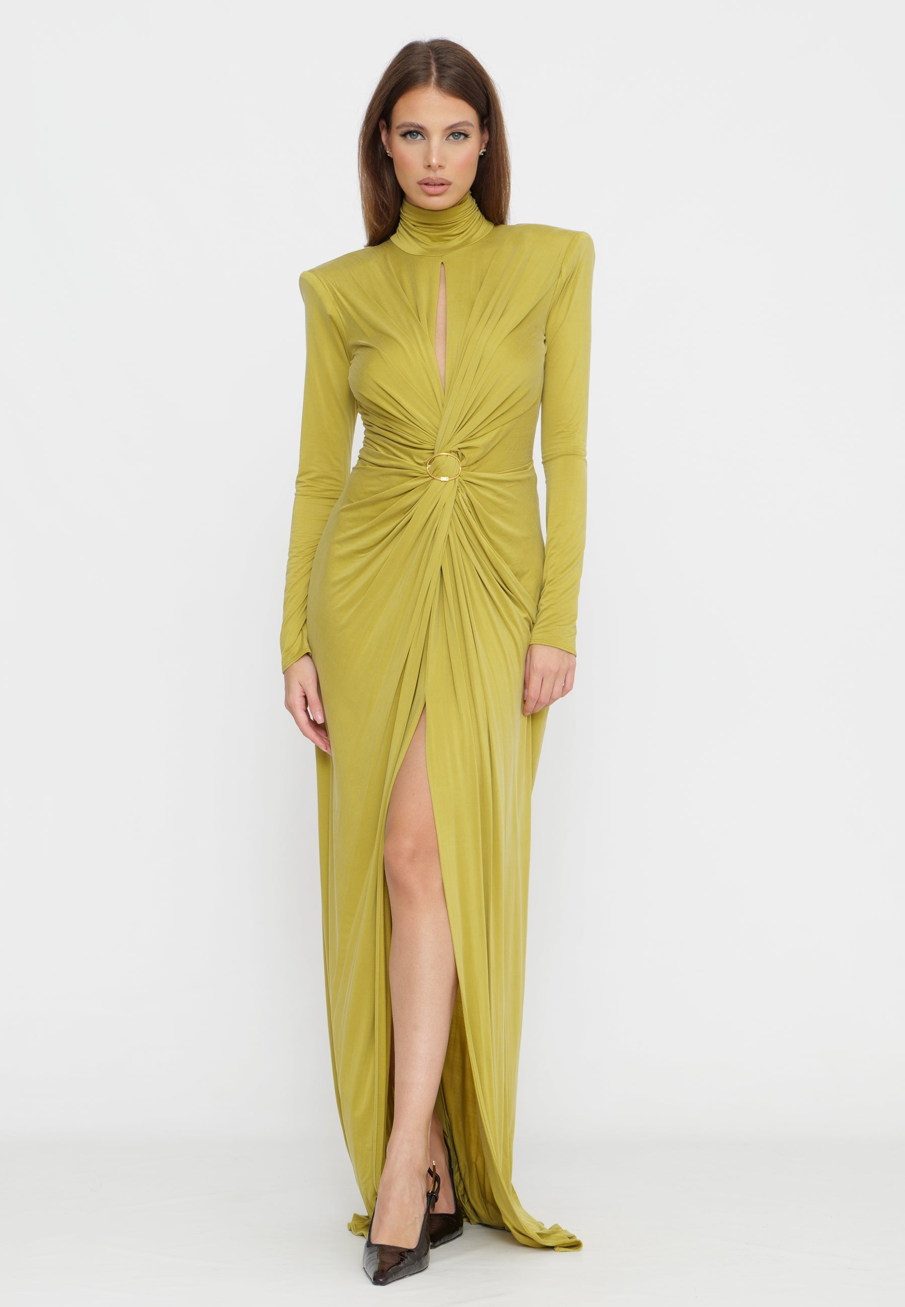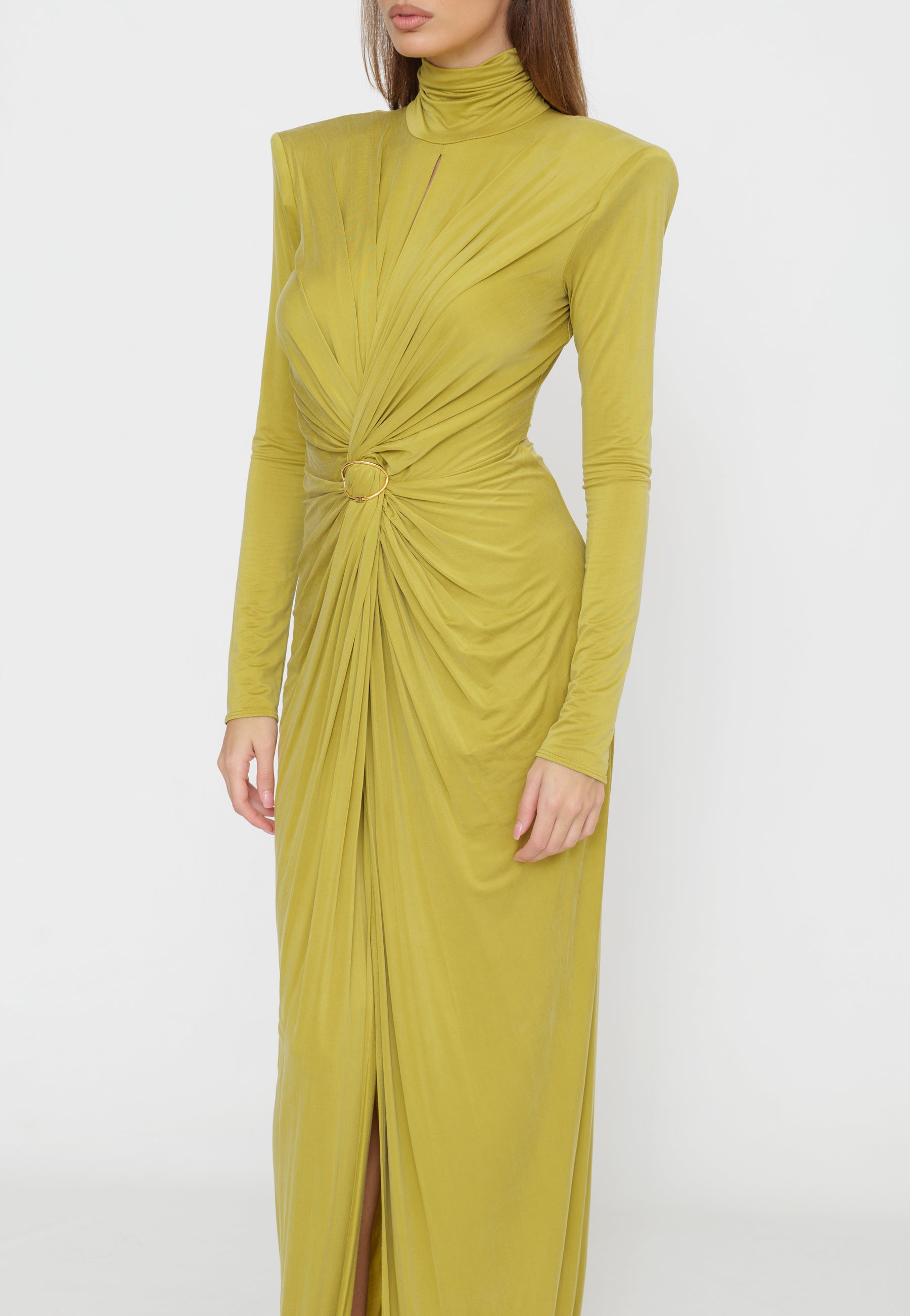 Abito da sera in jersey di cupro che abbina eleganza e movimento. La silhouette aderente è valorizzata da un collo alto e maniche lunghe, mentre i drappeggi frontali trattenuti da un accessorio in metallo dorato con logo creano un dettaglio sofisticato. Lo spacco anteriore e la goccia posteriore donano leggerezza e fluidità al capo, perfetto per occasioni speciali dove il design ricercato fa la differenza.