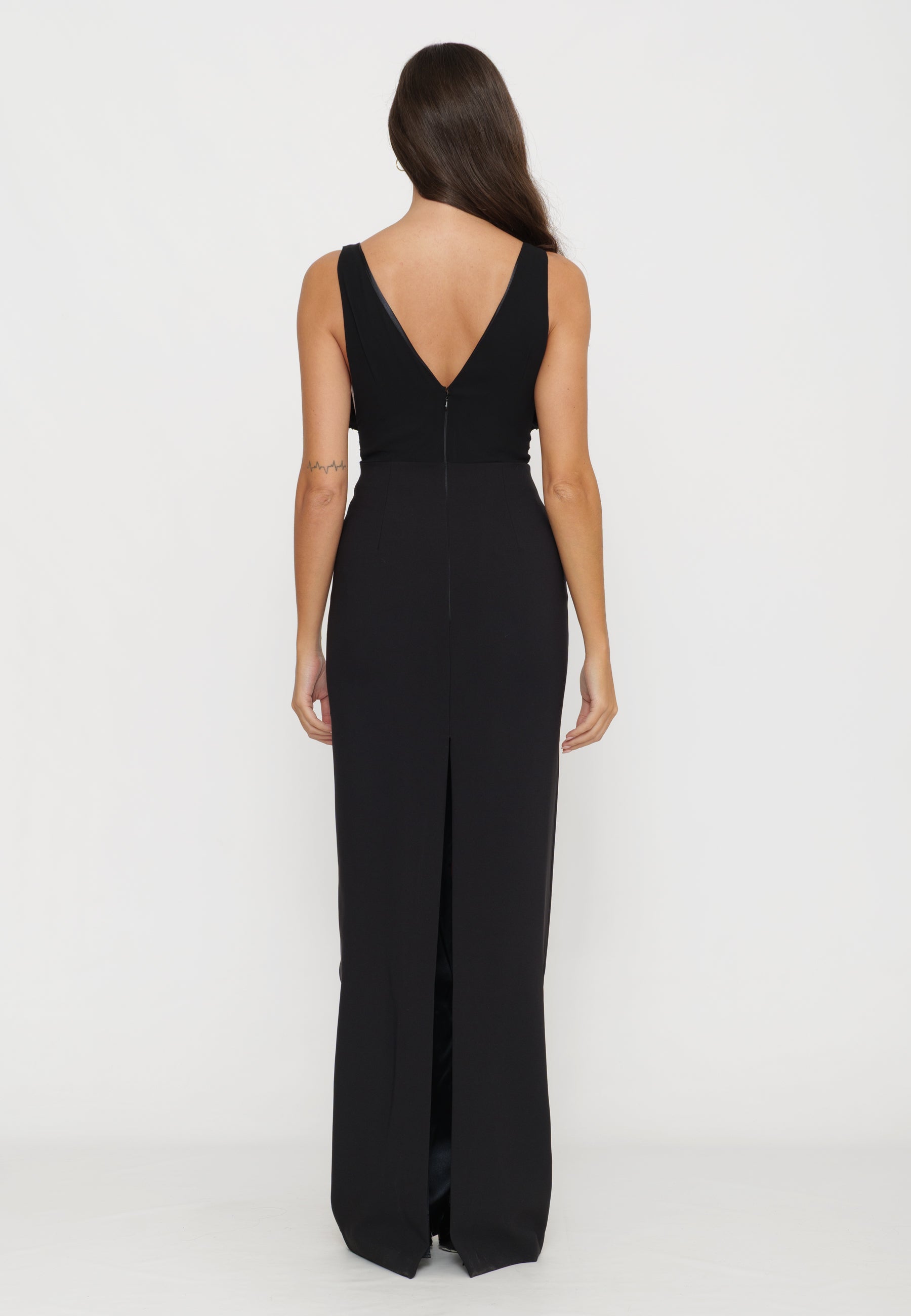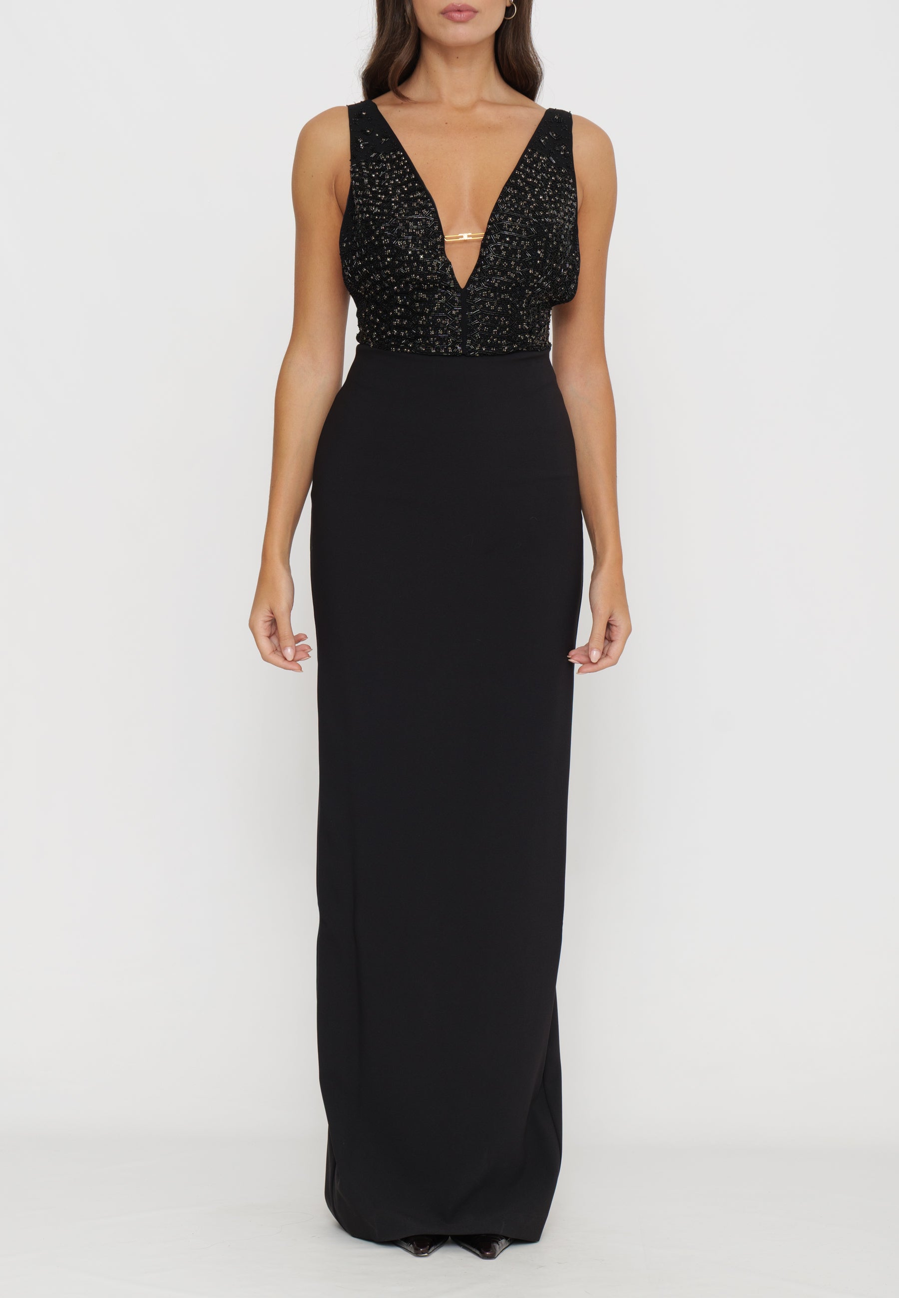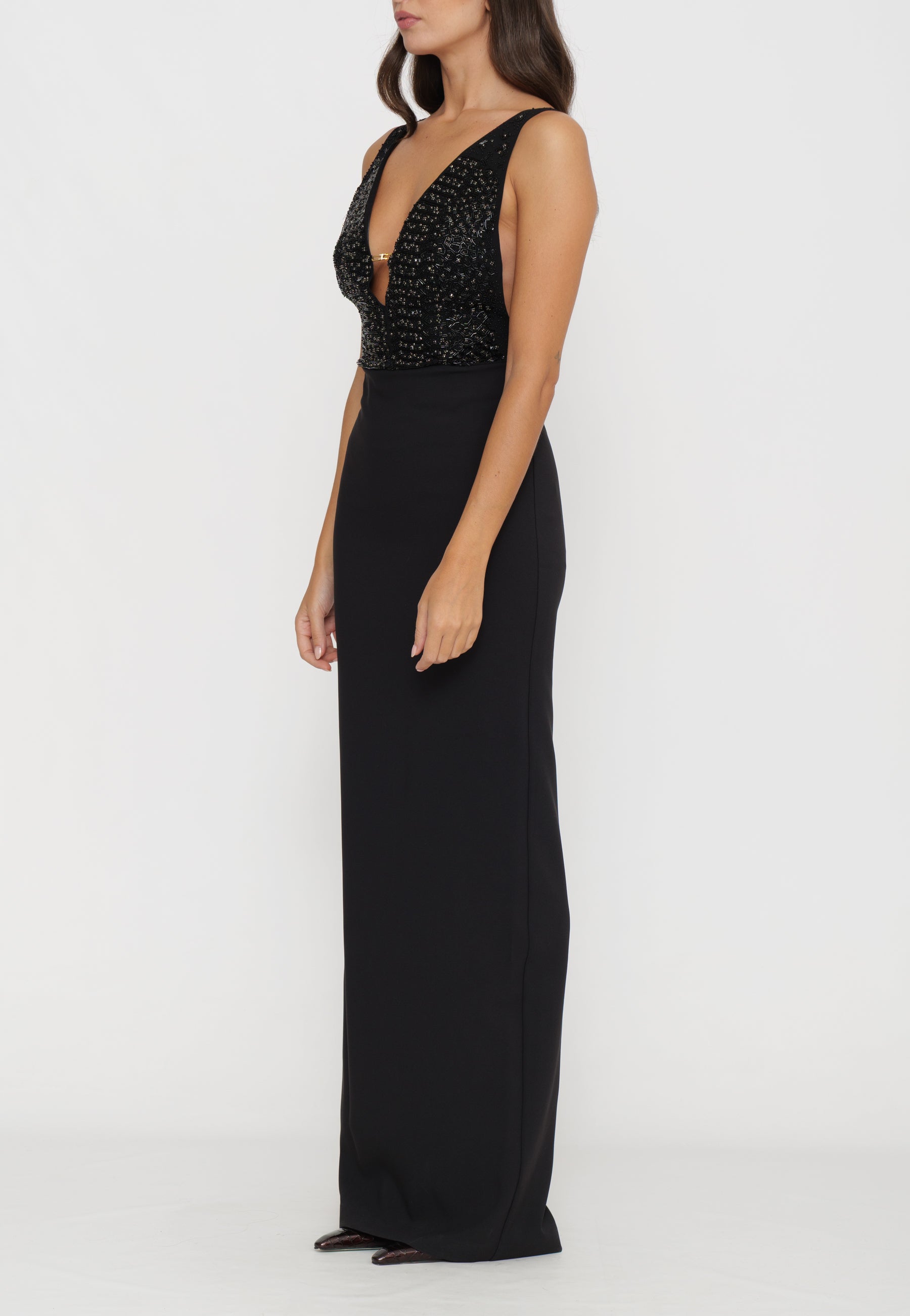 Questo abito da sera in georgette offre una silhouette slim e raffinata, perfetta per occasioni eleganti. Smanicato con scollo profondo, è impreziosito da un dettaglio gioiello con logo che conferisce un tocco esclusivo. Il top, arricchito da cristalli ricamati, cattura la luce donando brillantezza, mentre la gonna in crêpe a linea colonna, con profondo spacco laterale, aggiunge un elemento audace e dinamico al look. Un capo che coniuga eleganza e carattere con stile impeccabile.