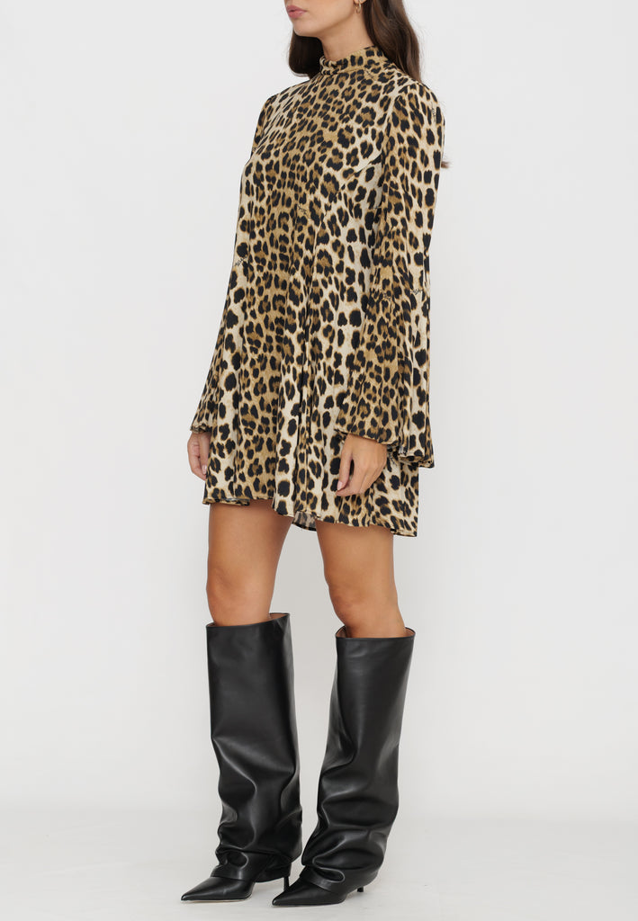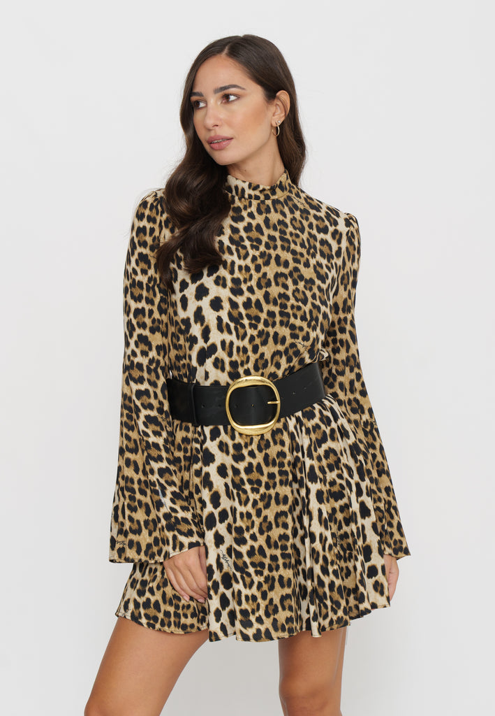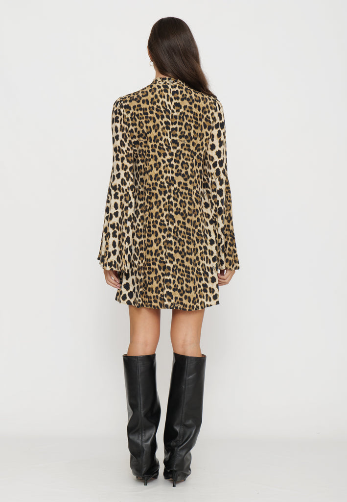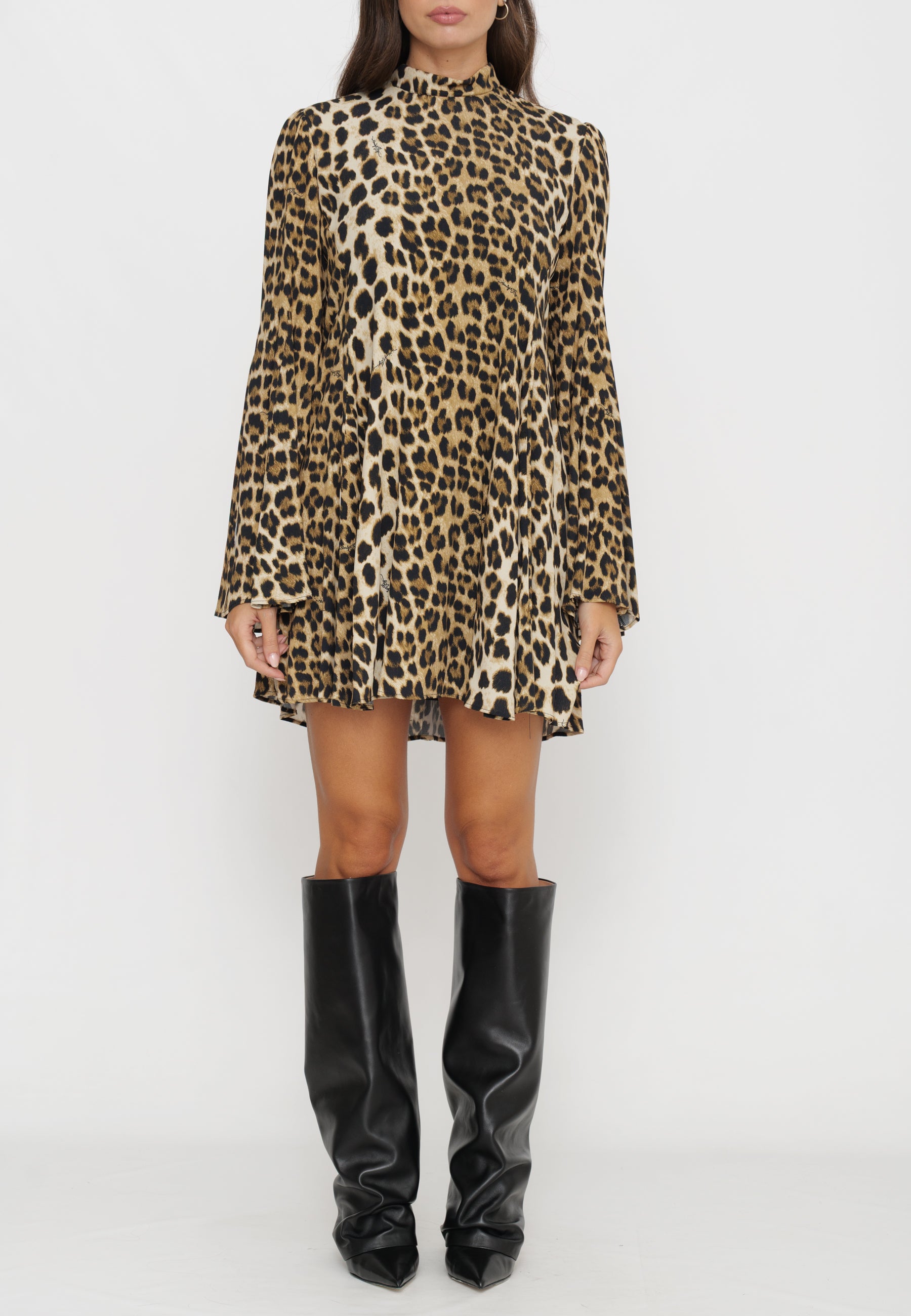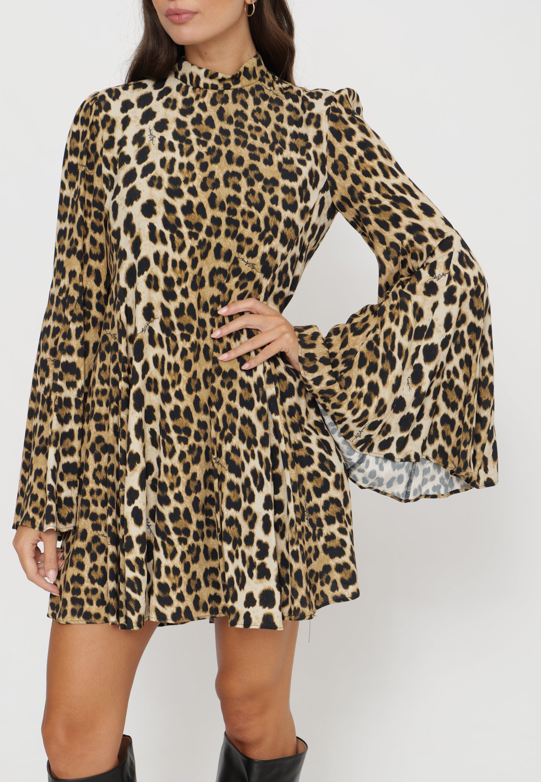 Mini abito maculato si distingue per le sue maniche a campana, che aggiungono un tocco di eleganza contemporanea al design. Combina stile audace e comfort, ideale per chi desidera un look deciso e raffinato nelle occasioni casual o serali. La vestibilità è studiata per esaltare la figura, rendendolo un capo versatile e sofisticato nel guardaroba.