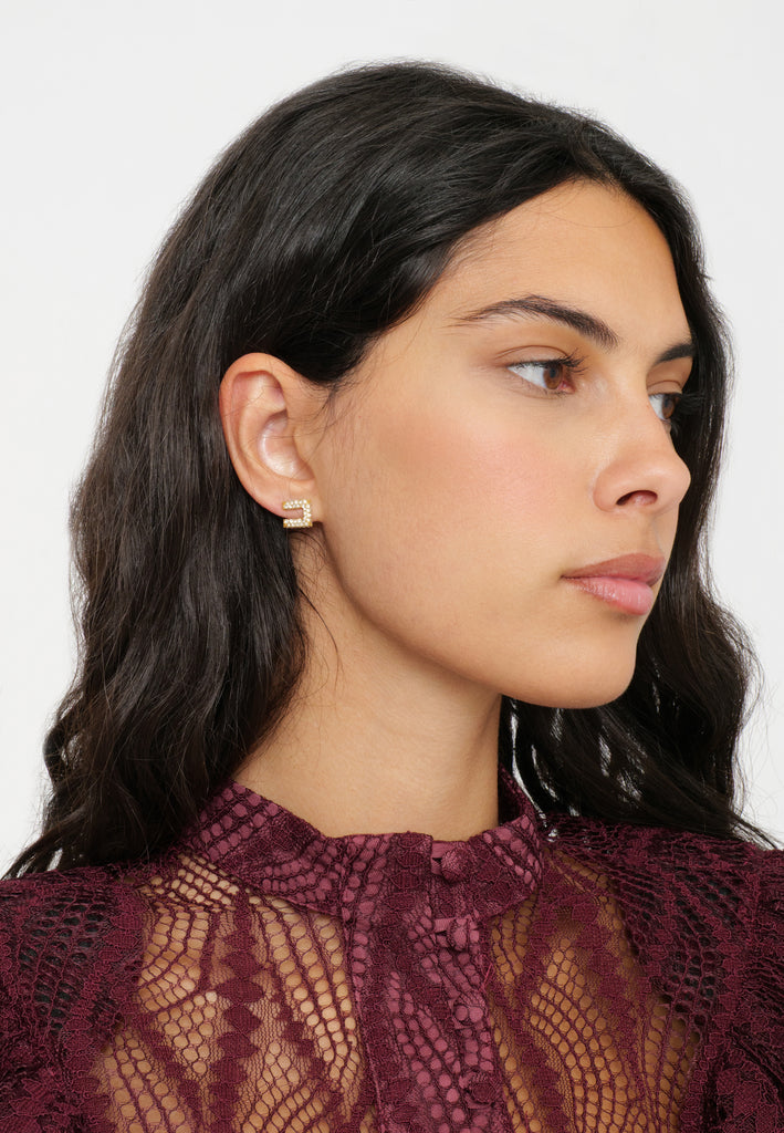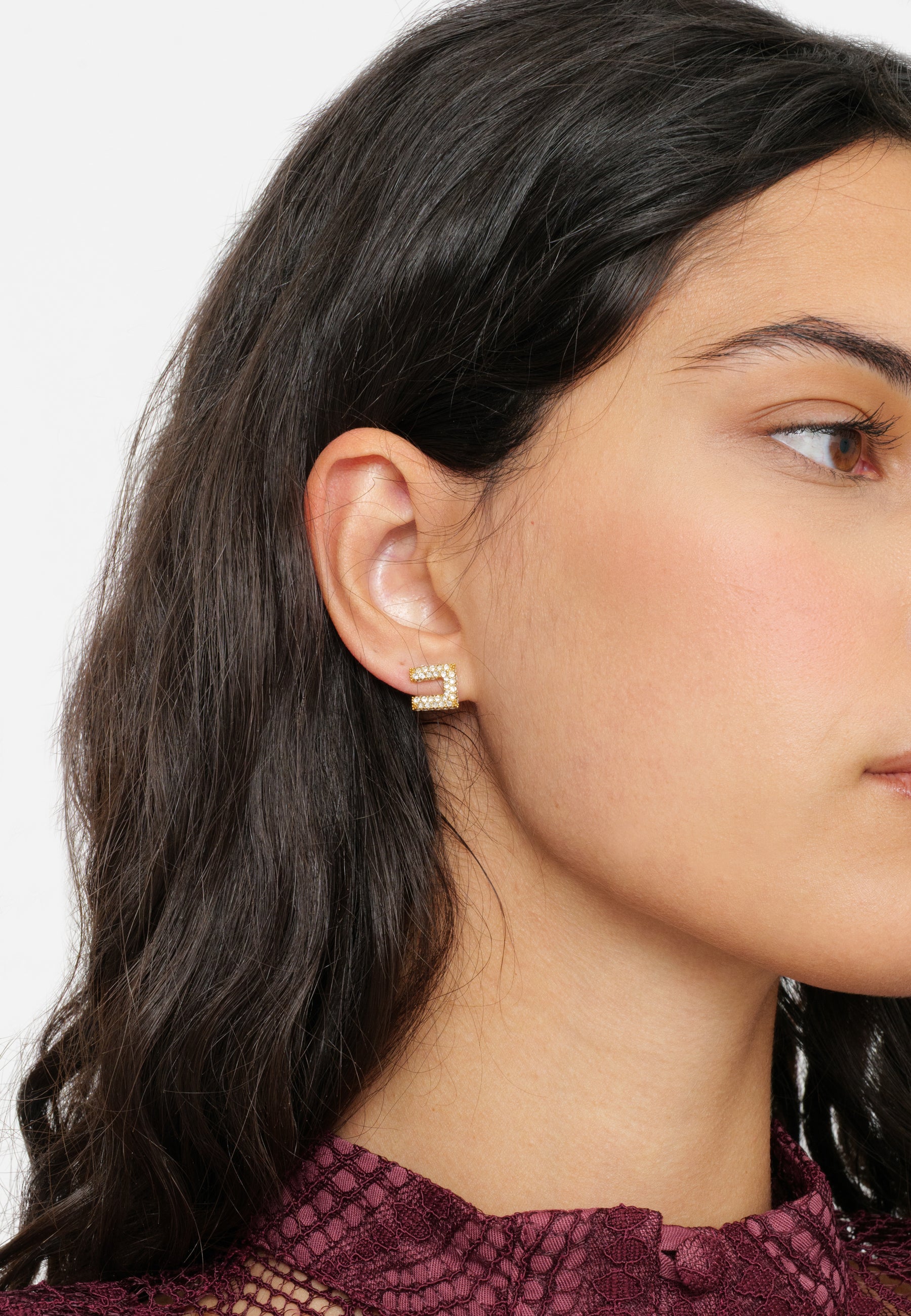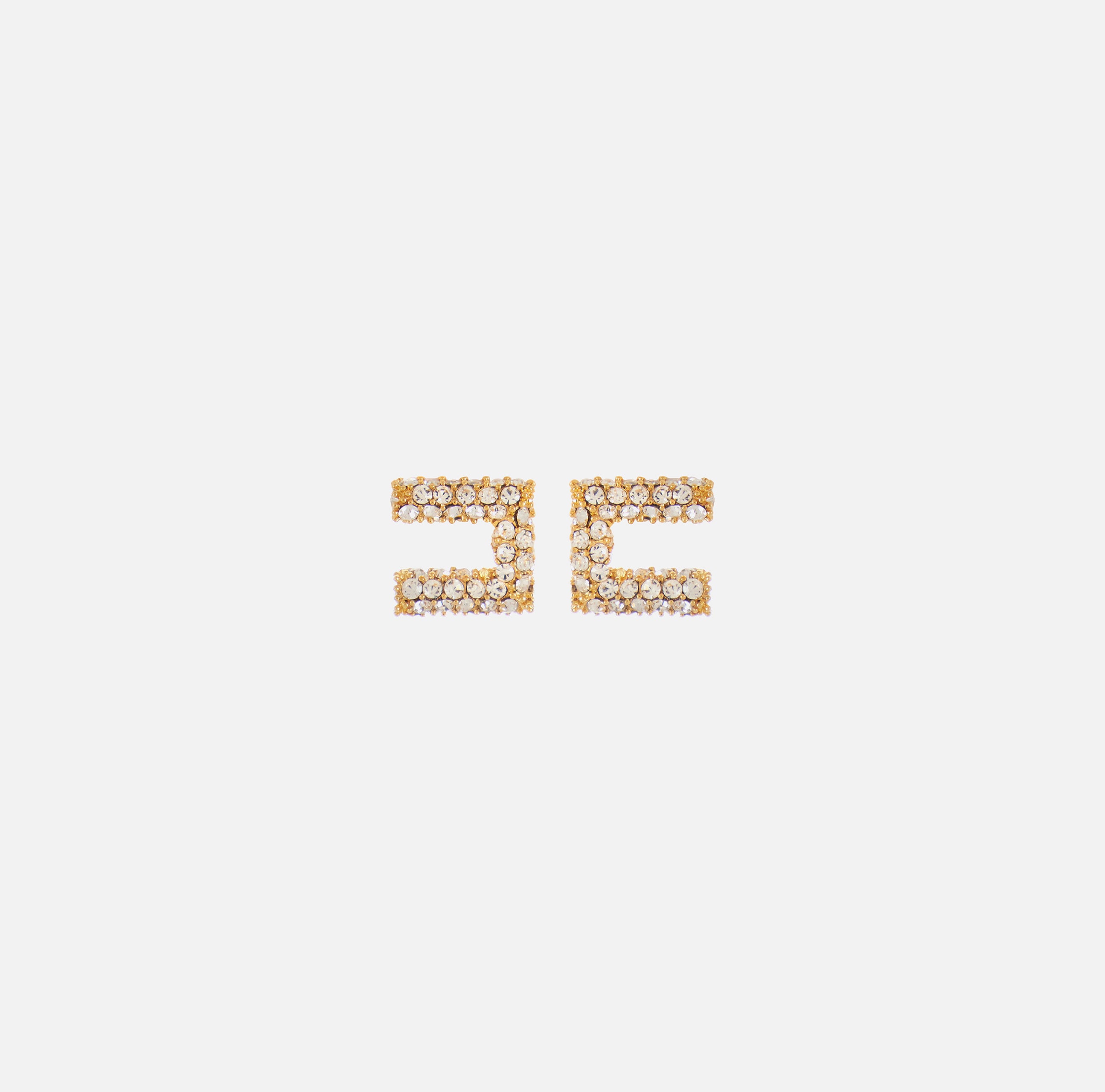 Questi orecchini firmati Elisabetta Franchi uniscono eleganza e dettaglio sofisticato grazie al logo impreziosito da strass. Ideali per valorizzare ogni look con un tocco di luce e stile distintivo, sono accessori perfetti per chi cerca raffinatezza e qualità in ogni occasione.
