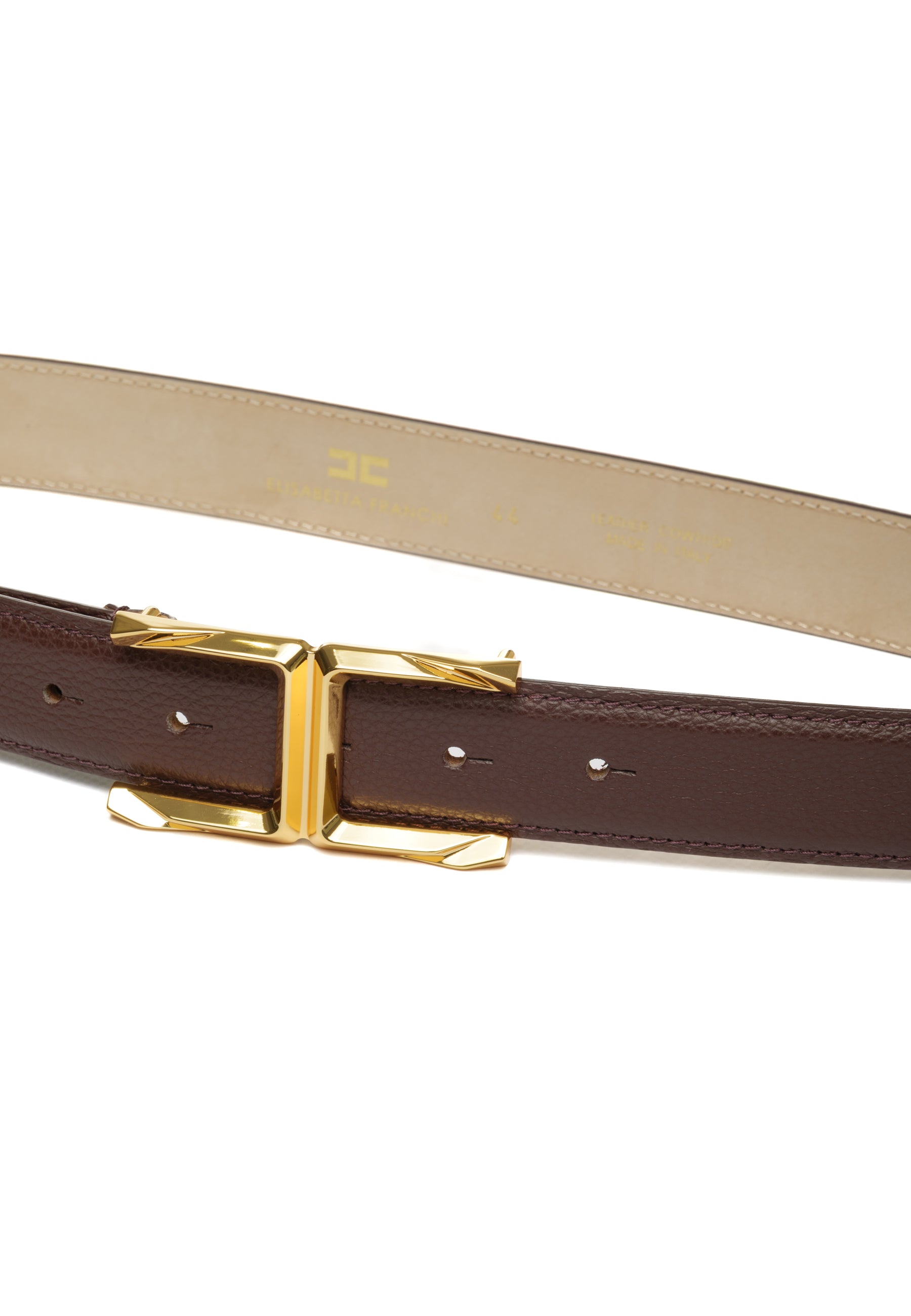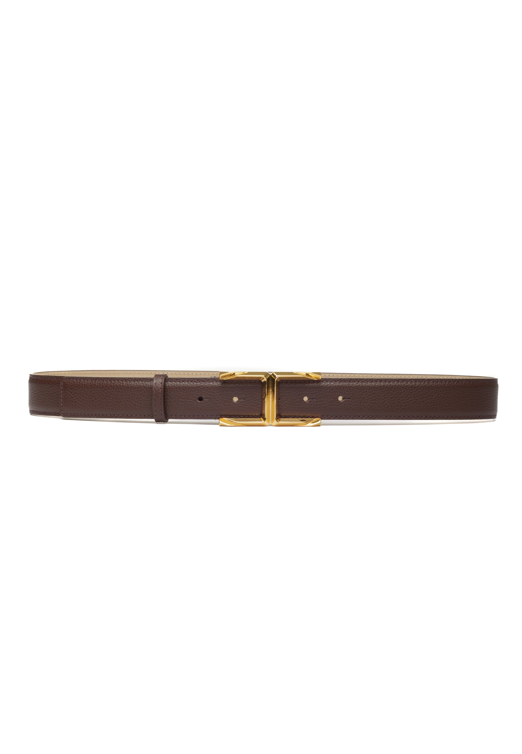 Cintura in vera pelle con design elegante e raffinato. Caratterizzata da una struttura leggermente bombata e rifinita con impunture precise che ne esaltano la qualità artigianale. La placca frontale in metallo dorato con logo aggiunge un tocco di lusso e riconoscibilità. Altezza 3 cm, perfetta per completare qualsiasi outfit con stile. Materiale: 100% pelle e metallo dorato.