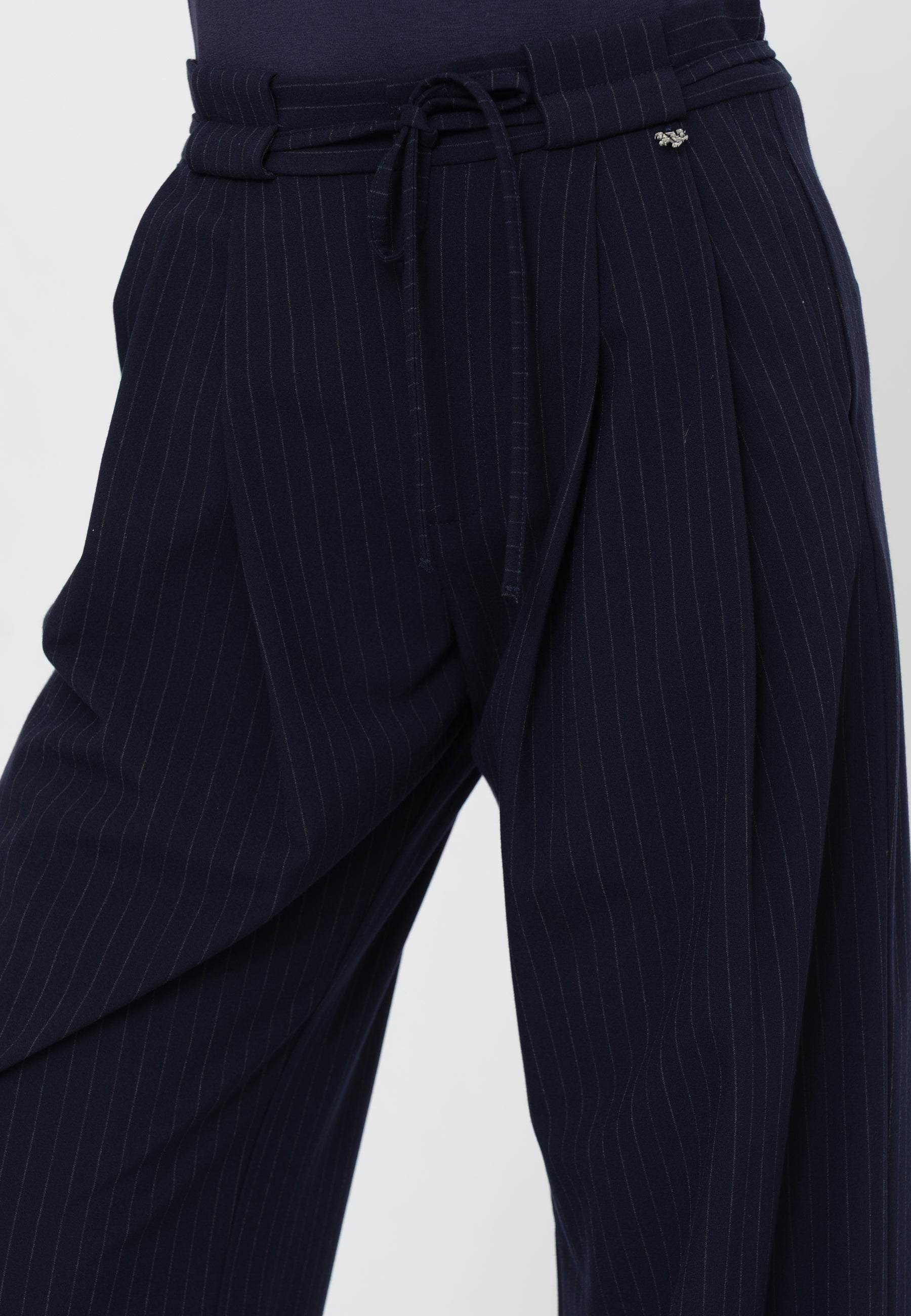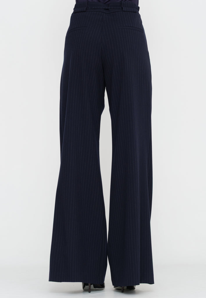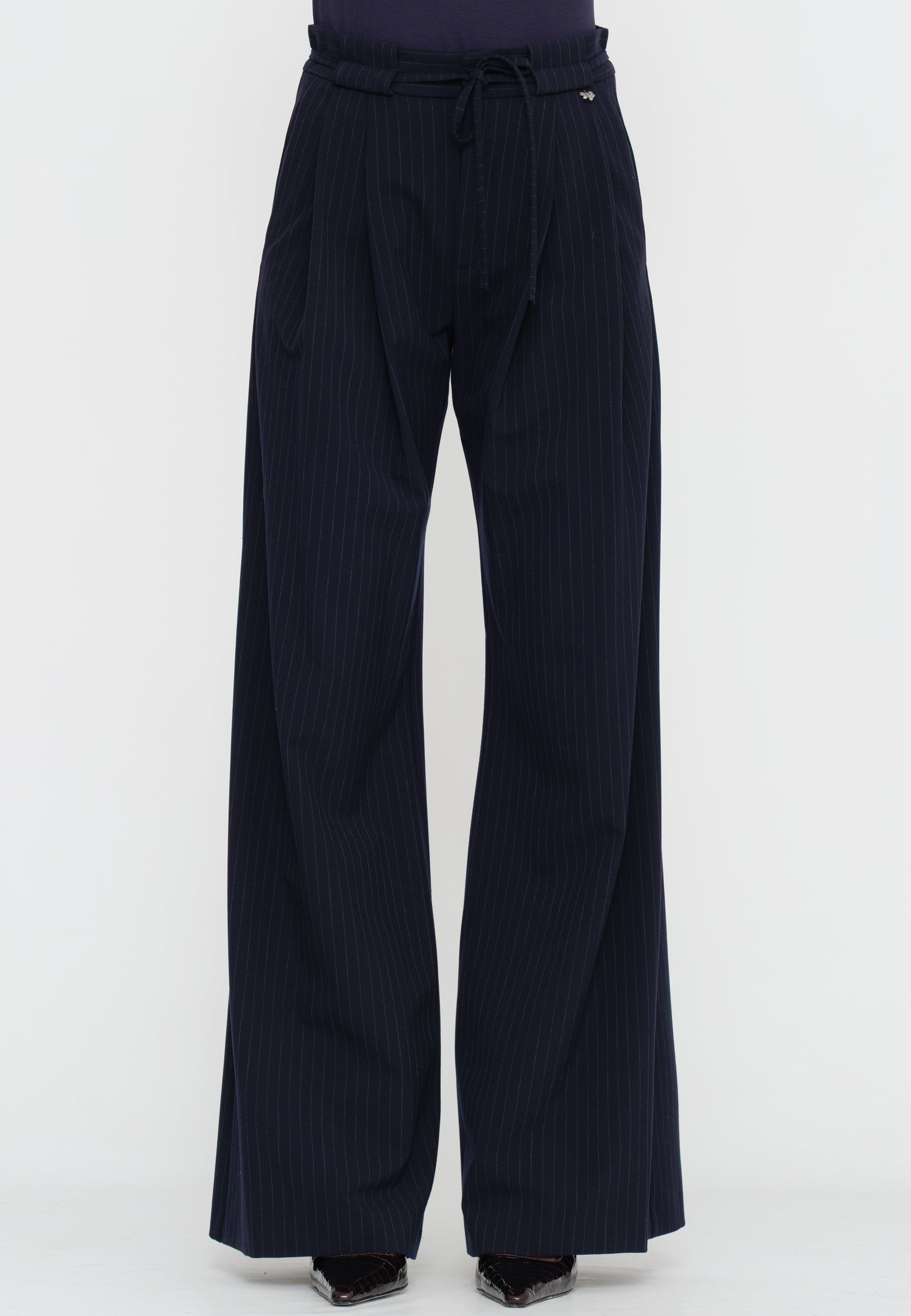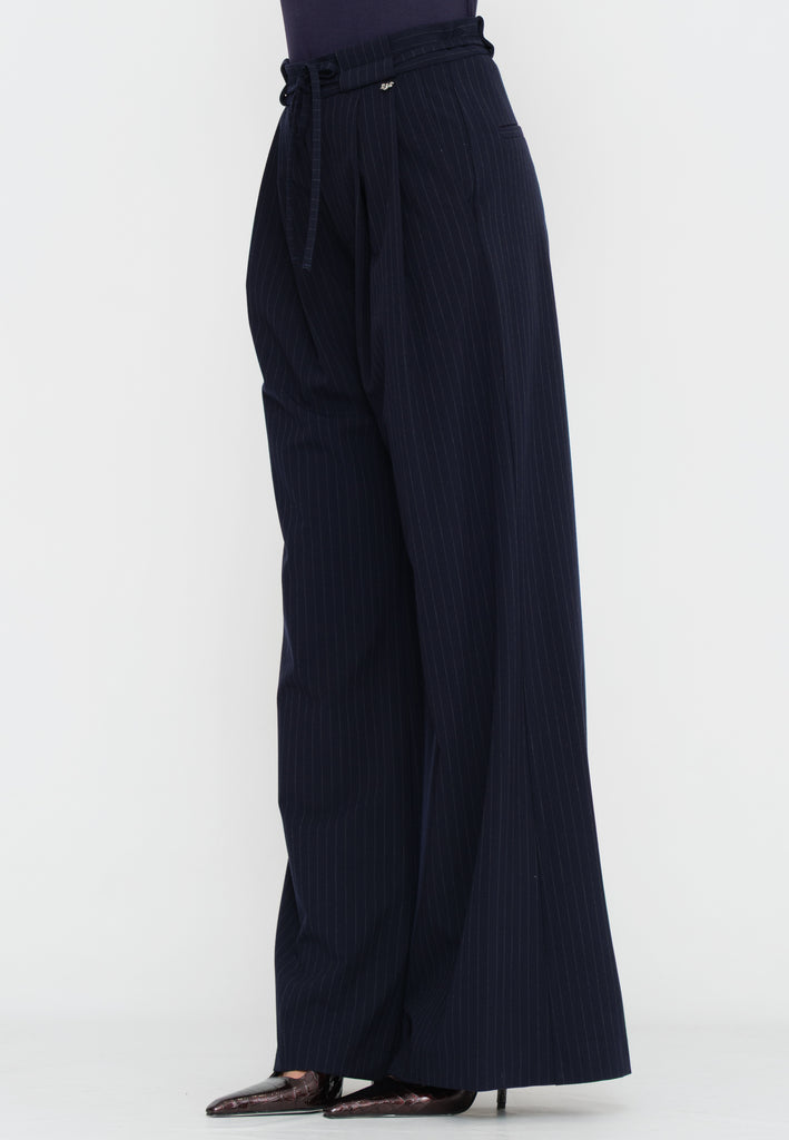 Pantaloni ampi in tessuto gessato con pinces, un capo che unisce eleganza sartoriale e comfort contemporaneo. Il taglio generoso e le pieghe frontali conferiscono movimento e sofisticazione, ideali per chi ricerca un'alternativa raffinata ai tagli slim. La fantasia a gessato garantisce versatilità negli abbinamenti, adattandosi sia a look formali che casual-chic. Perfetti per chi apprezza il dettaglio costruttivo e desidera pantaloni che valorizzino la silhouette con stile classico reinterpretato.