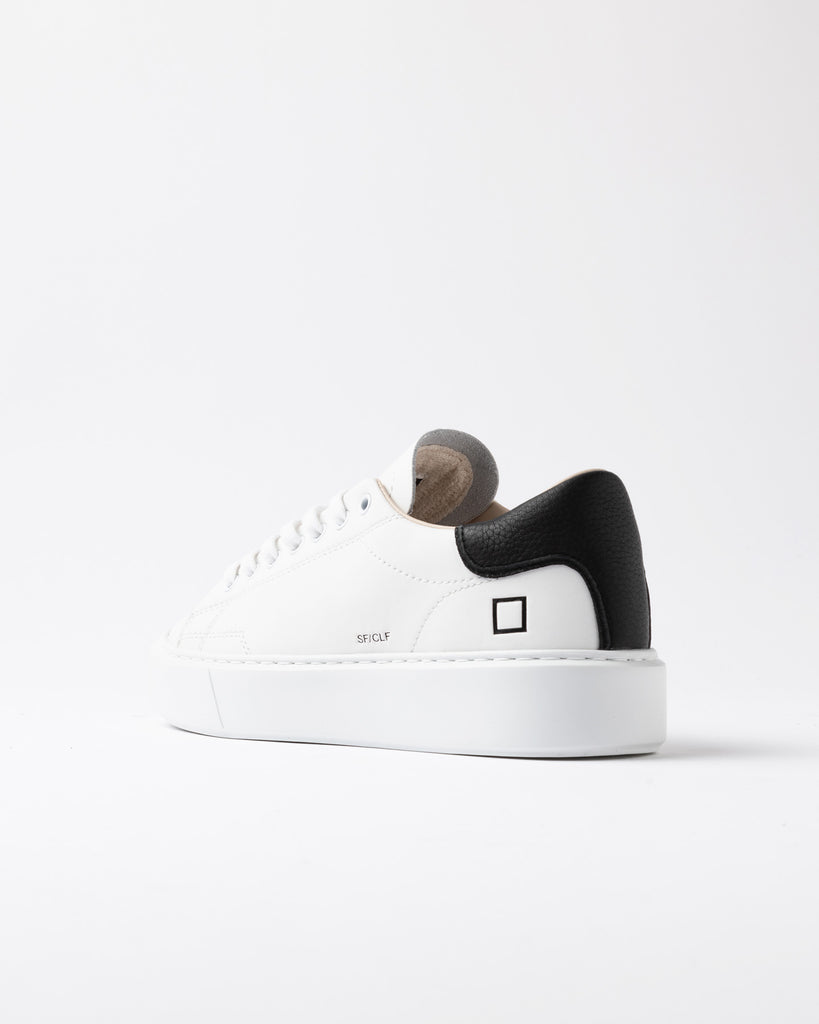 Sneakers bassa in pelle colore bianco, sulla linguetta in pelle tono su tono è impressa la scritta D.A.T.E., lacci in cotone. Il talloncino posteriore è in pelle martellata nera con inserto glitterato in tono. La soletta interna è rialzata di 2.5 cm per un miglior comfort, la suola in gomma cucita è alta 2.5 - 3.5 cm.