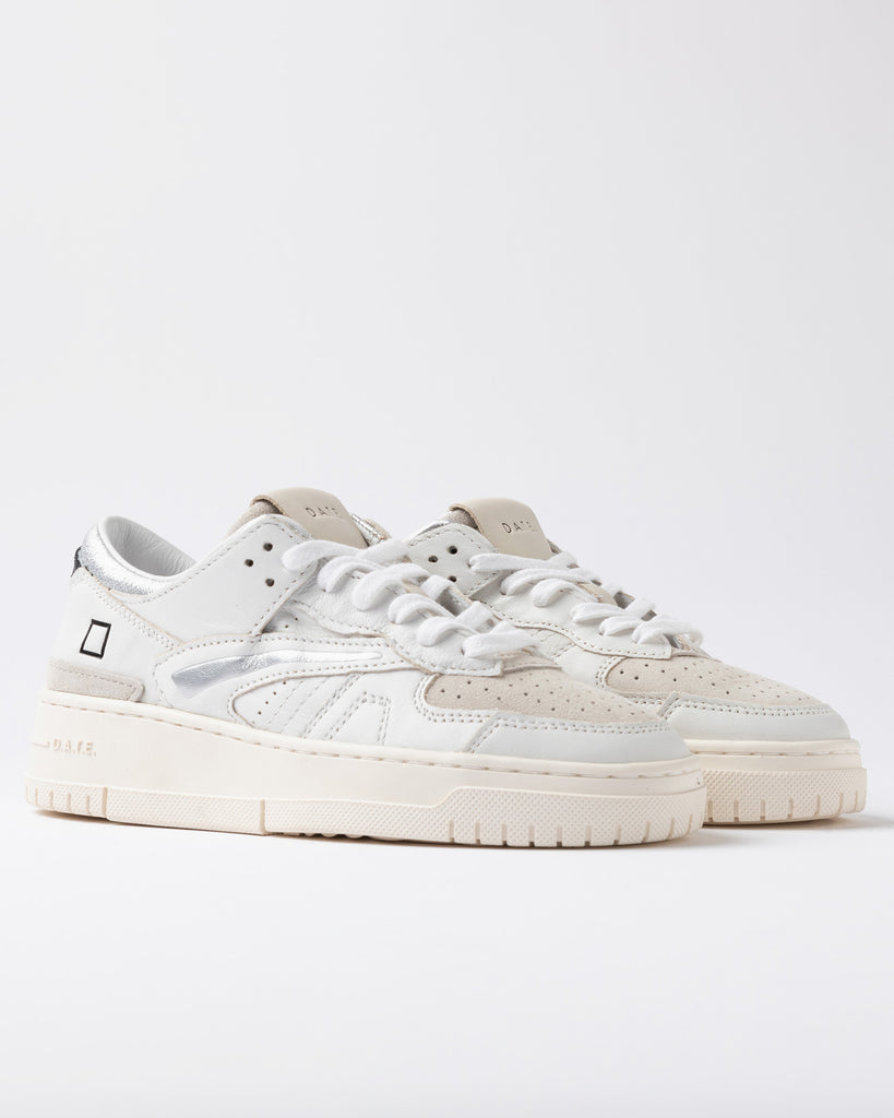 Sneakers bassa in pelle colore bianco con inserti in camoscio colore beige. Sulla linguetta è impressa la scritta D.A.T.E., lacci in cotone, il nome del modello è impresso sul retro. La soletta interna è rialzata di 2.5 cm per un migliore comfort, la suola in gomma, alta 2.5 - 3.5 cm, è cucita. La maggior parte del pellame utilizzato è Logic Fondo Crust, una pelle che, con l'usura, sviluppa un effetto vissuto, rivelando il colore neutro sottostante, tendente al beige.