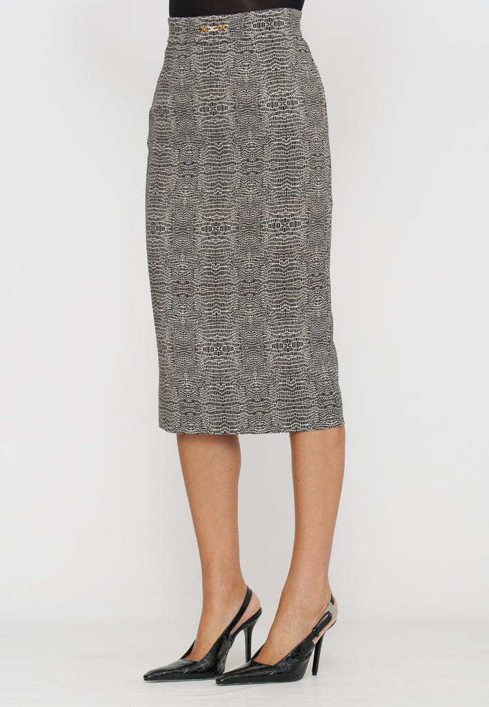 Questo tubino in viscosa dalla linea aderente si distingue per la stampa pitone a motivo all-over che dona dinamismo e modernità al capo. Il dettaglio distintivo è il morsetto gioiello con logo in strass, posizionato sul fascione in vita, che valorizza la silhouette aggiungendo un tocco di eleganza luminosa e sofisticata. Perfetto per chi cerca un abito che unisca stile contemporaneo e raffinatezza artigianale.
