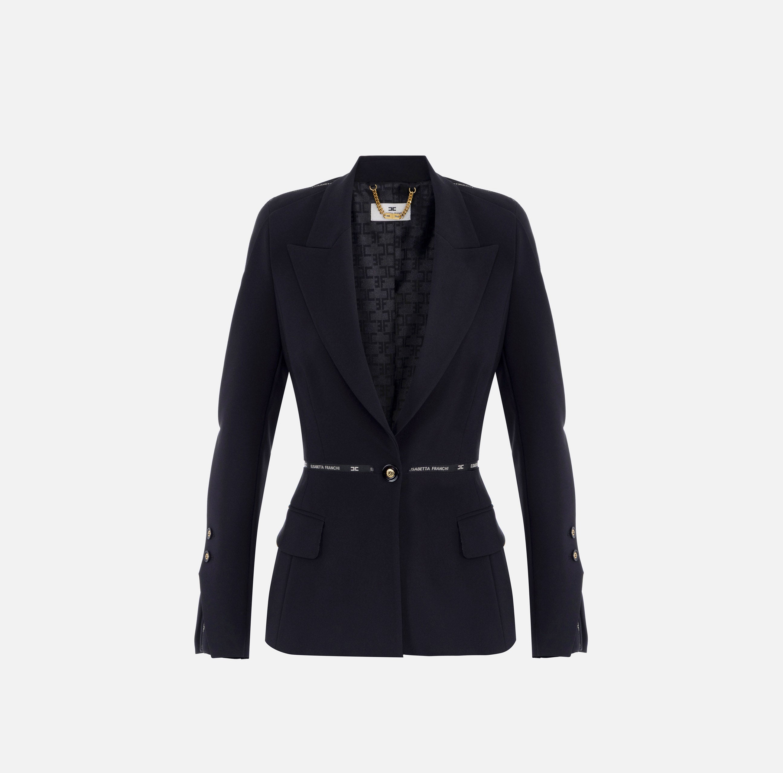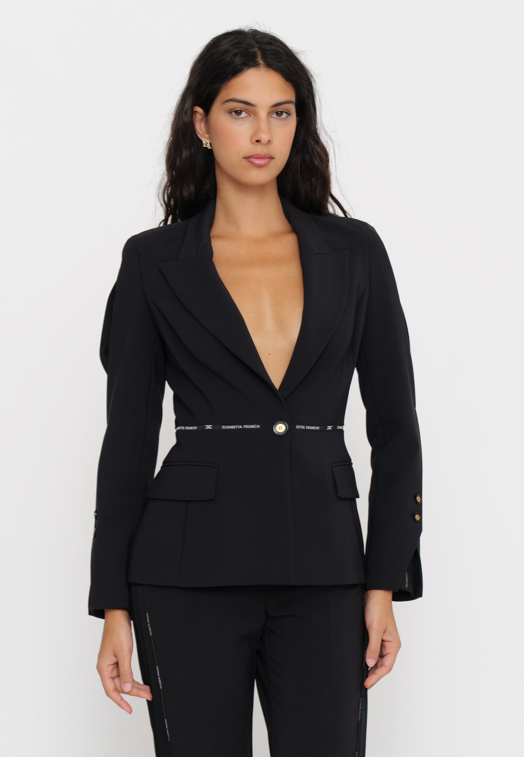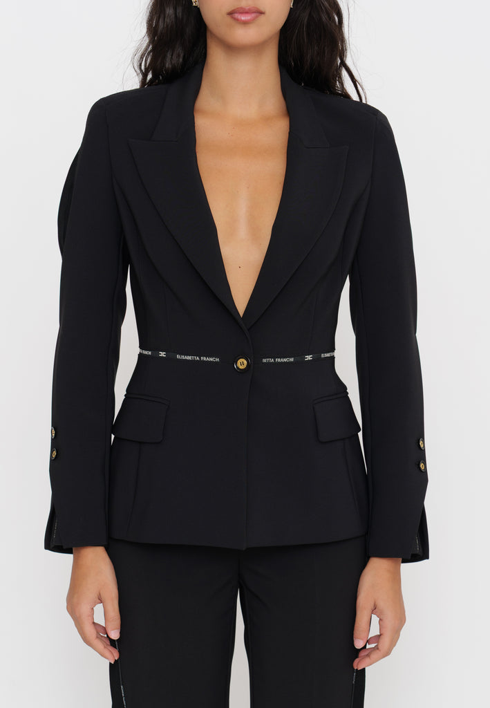 Questa giacca in crepe è impreziosita da un nastro in vita con logo distintivo, ideale per valorizzare la silhouette con un dettaglio di carattere. Realizzata con materiali eleganti e dalla vestibilità curata, offre un equilibrio perfetto tra stile sofisticato e comfort quotidiano. Un capo versatile per un guardaroba raffinato, capace di aggiungere un tocco di personalità a ogni look.