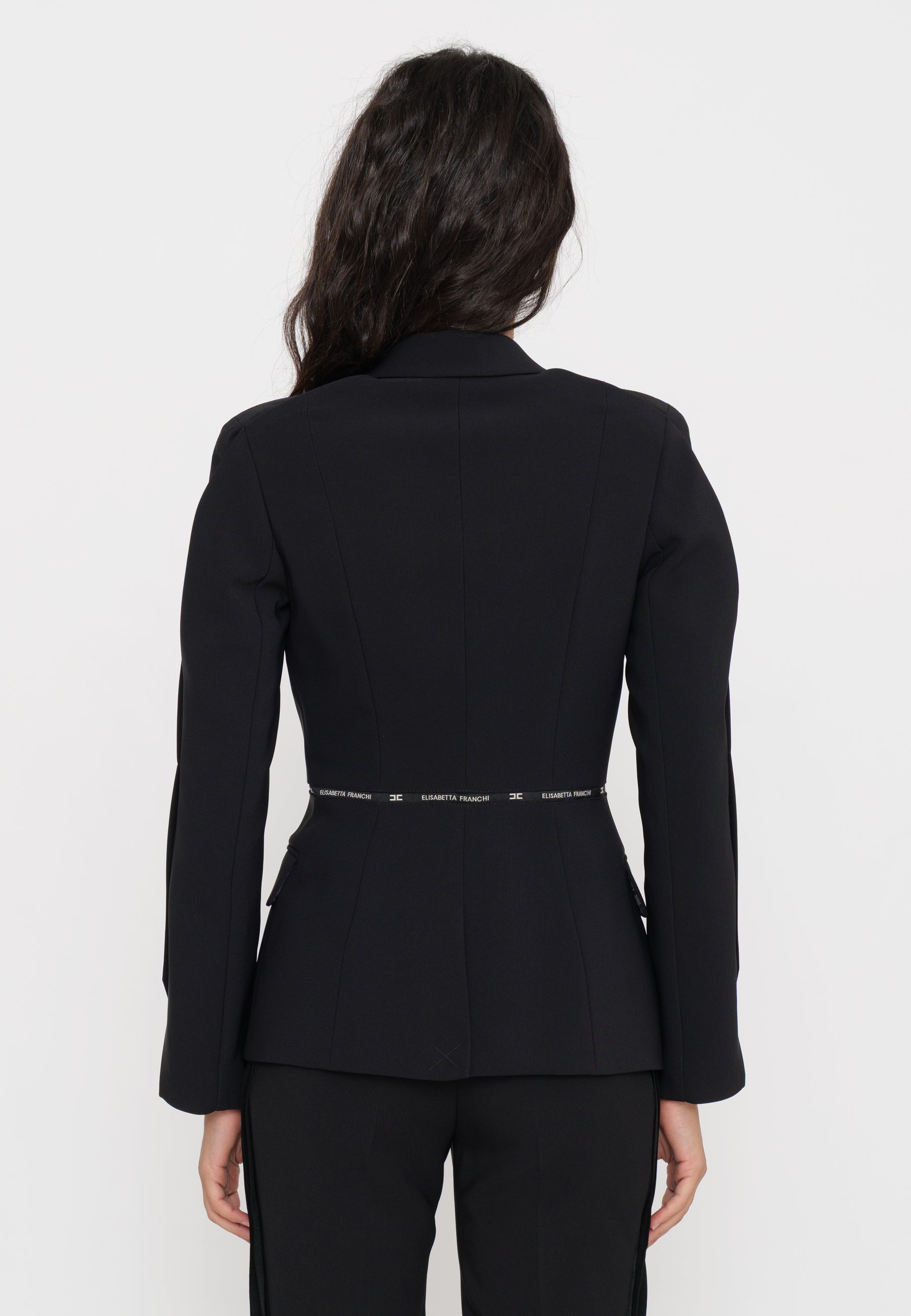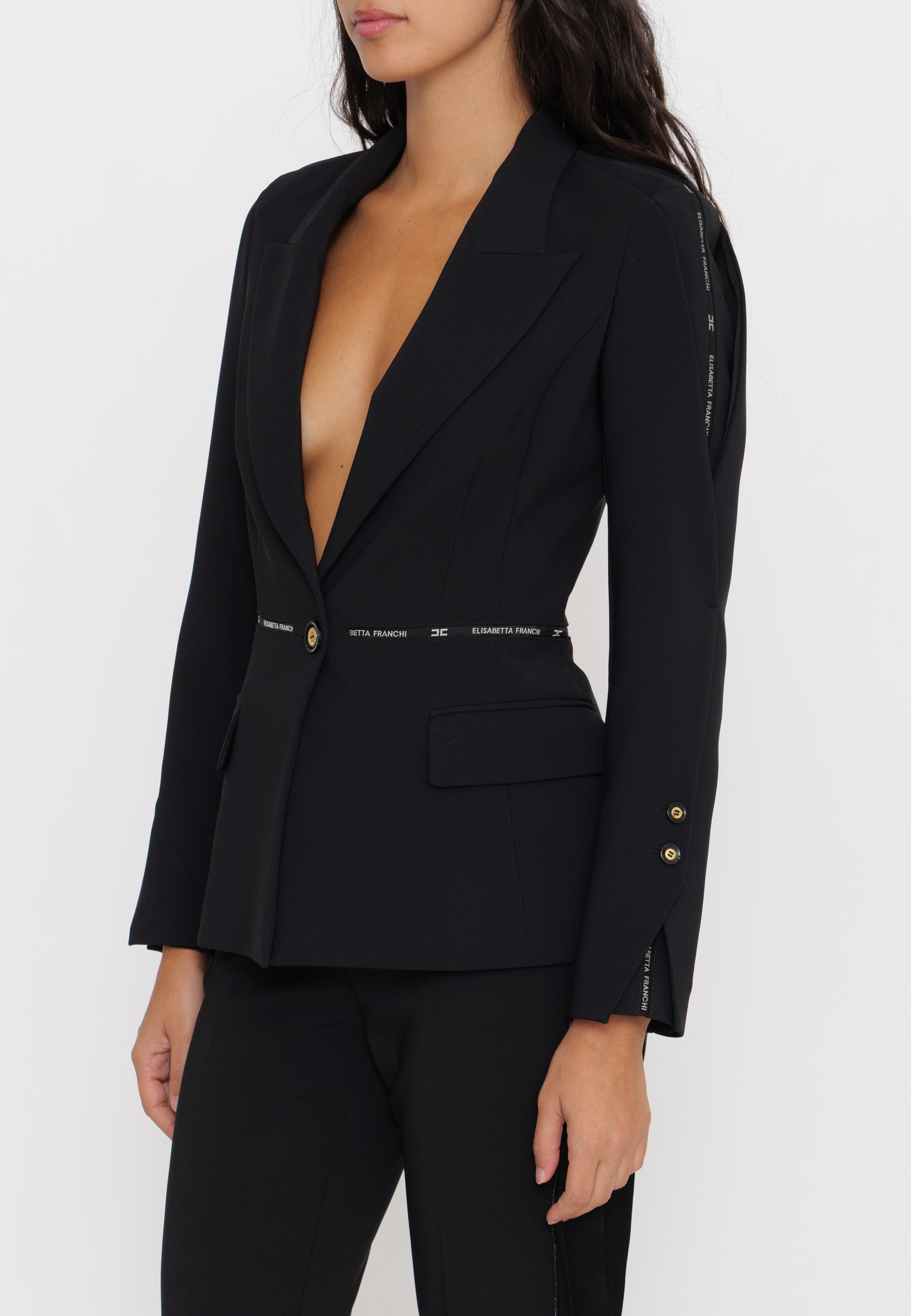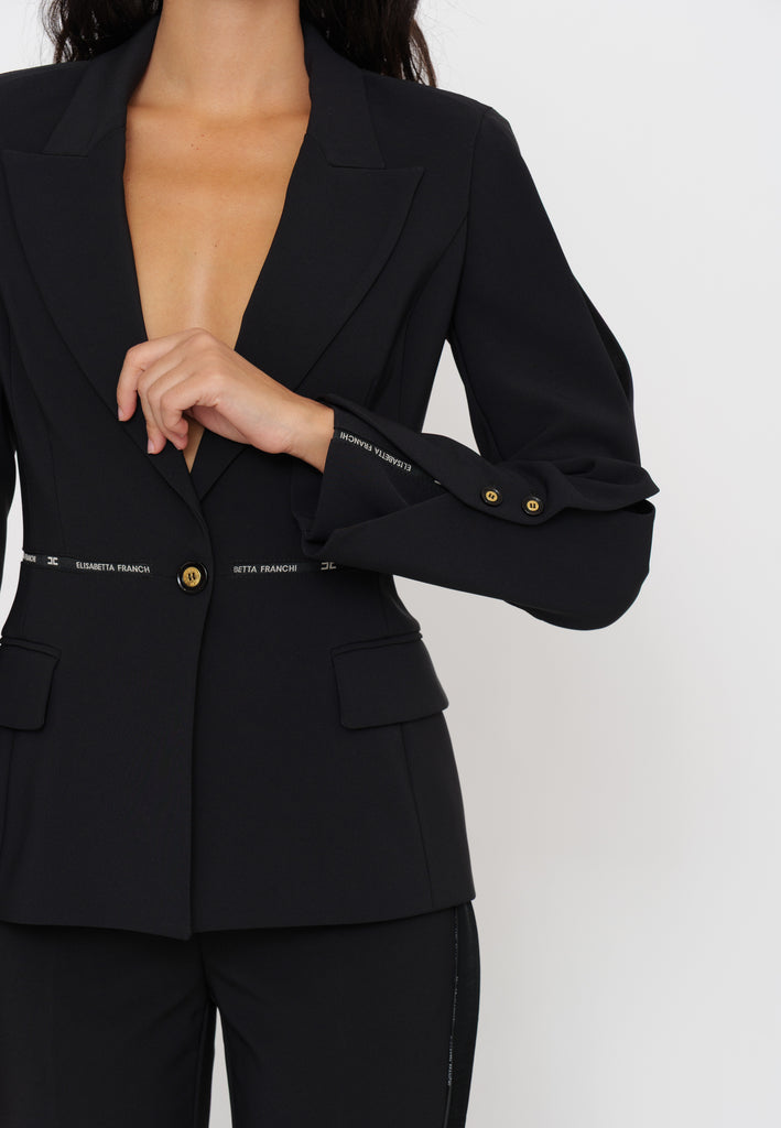 Questa giacca in crepe è impreziosita da un nastro in vita con logo distintivo, ideale per valorizzare la silhouette con un dettaglio di carattere. Realizzata con materiali eleganti e dalla vestibilità curata, offre un equilibrio perfetto tra stile sofisticato e comfort quotidiano. Un capo versatile per un guardaroba raffinato, capace di aggiungere un tocco di personalità a ogni look.