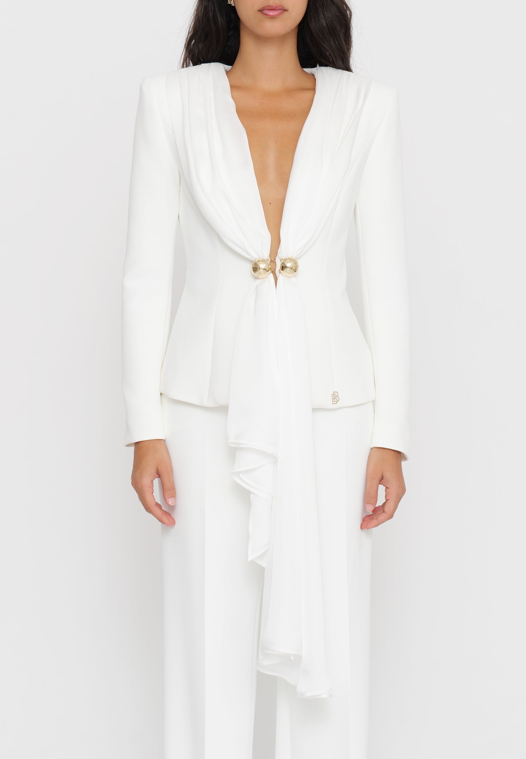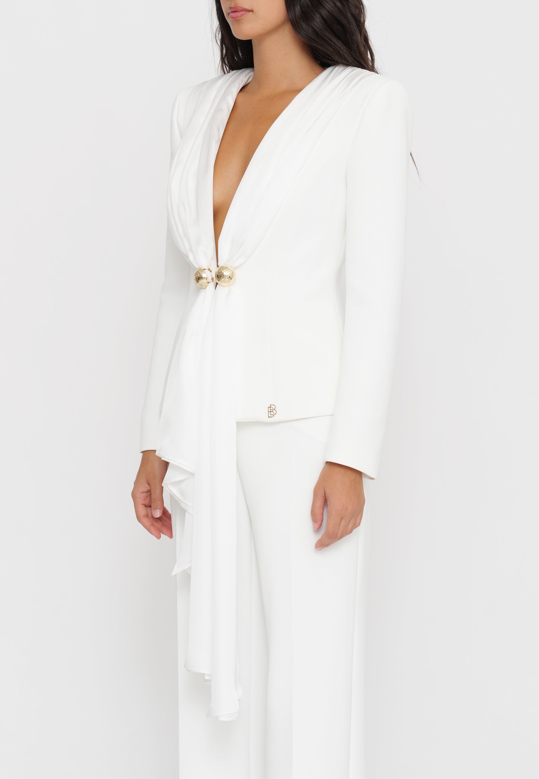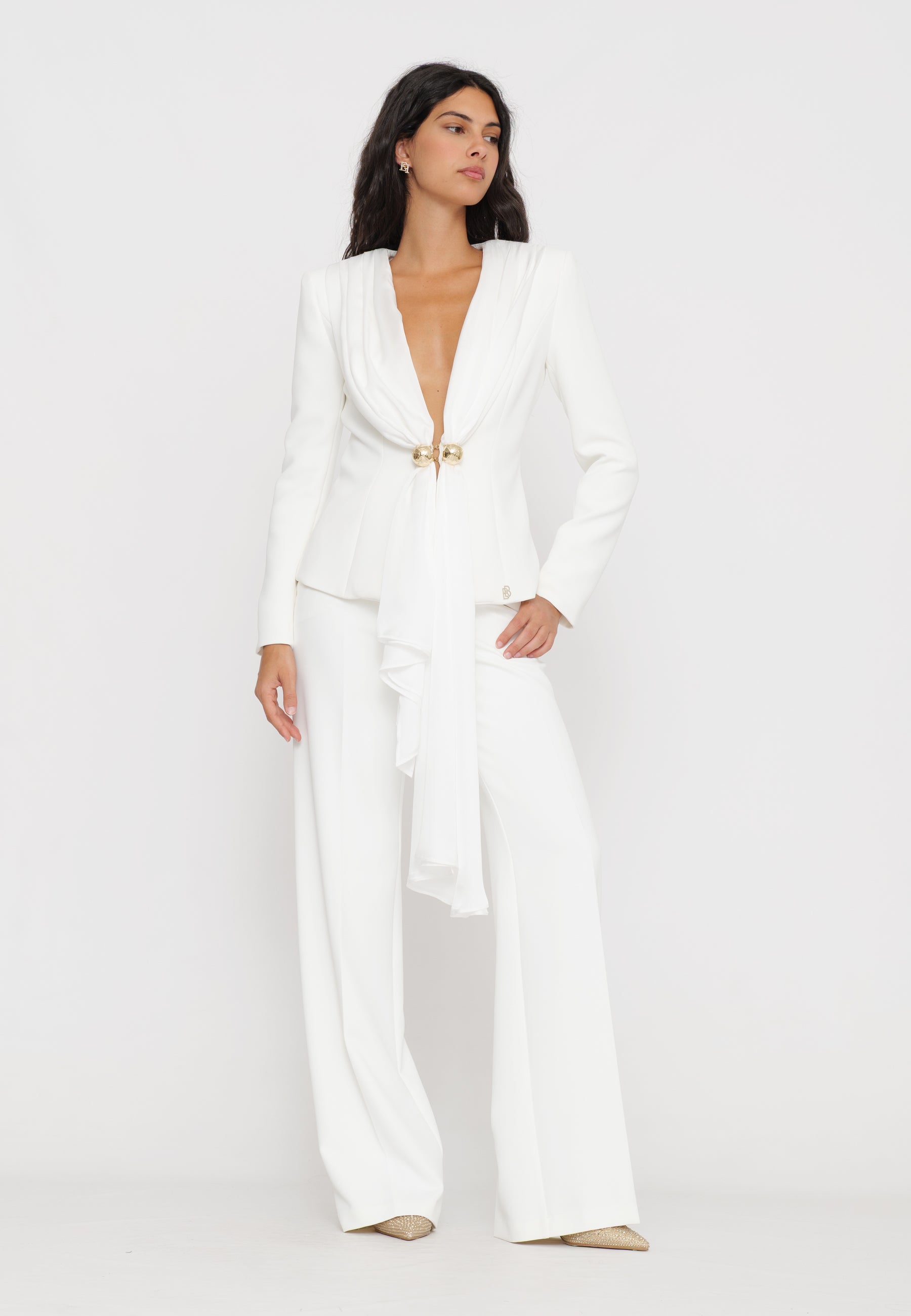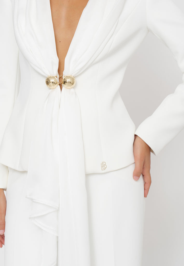 Giacca che presenta uno scollo ampio e una chiusura elegante con gancetti, combinata con una fusciacca che definisce e valorizza la vita. Questo design unisce comfort e sofisticatezza, ideale per chi cerca un capo versatile dal carattere distintivo e raffinato. Perfetta per arricchire qualsiasi outfit con stile e personalità.