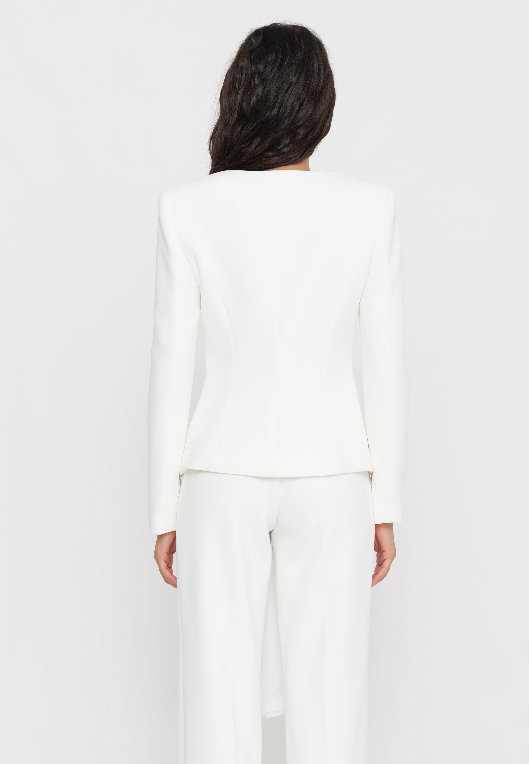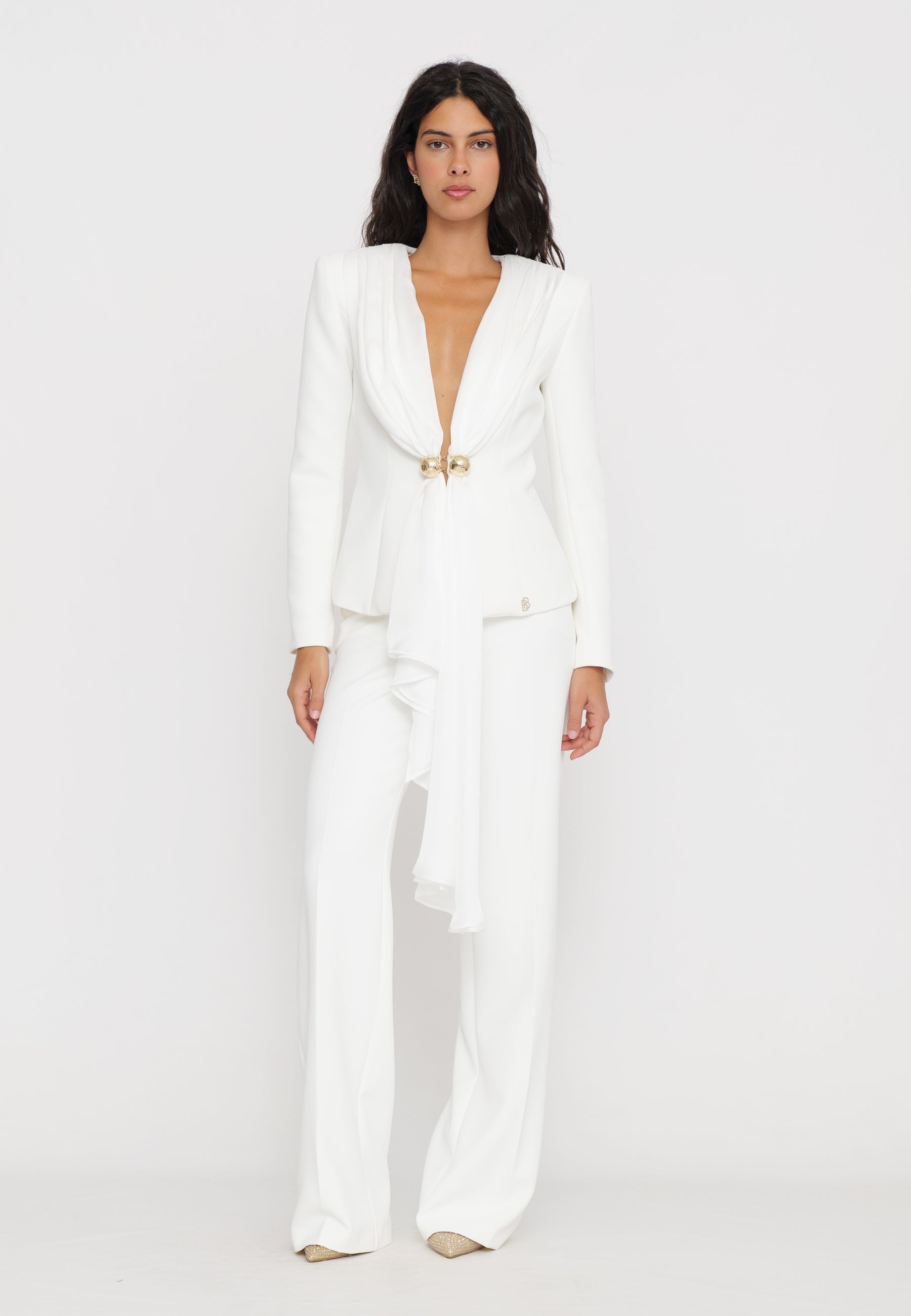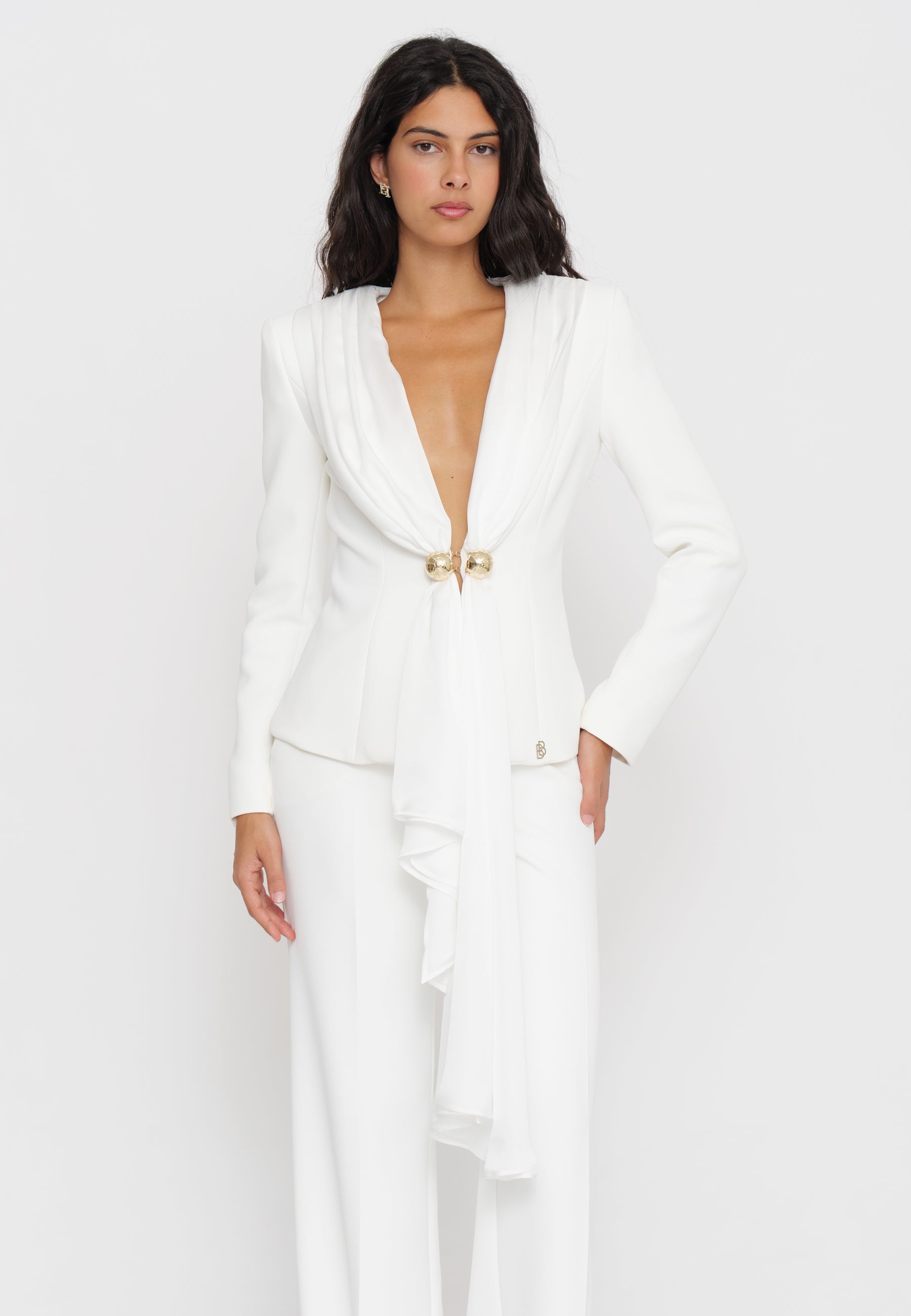 Giacca che presenta uno scollo ampio e una chiusura elegante con gancetti, combinata con una fusciacca che definisce e valorizza la vita. Questo design unisce comfort e sofisticatezza, ideale per chi cerca un capo versatile dal carattere distintivo e raffinato. Perfetta per arricchire qualsiasi outfit con stile e personalità.