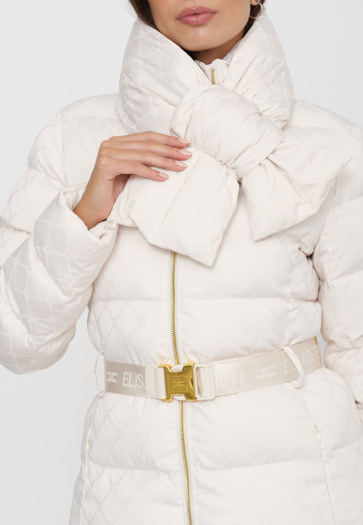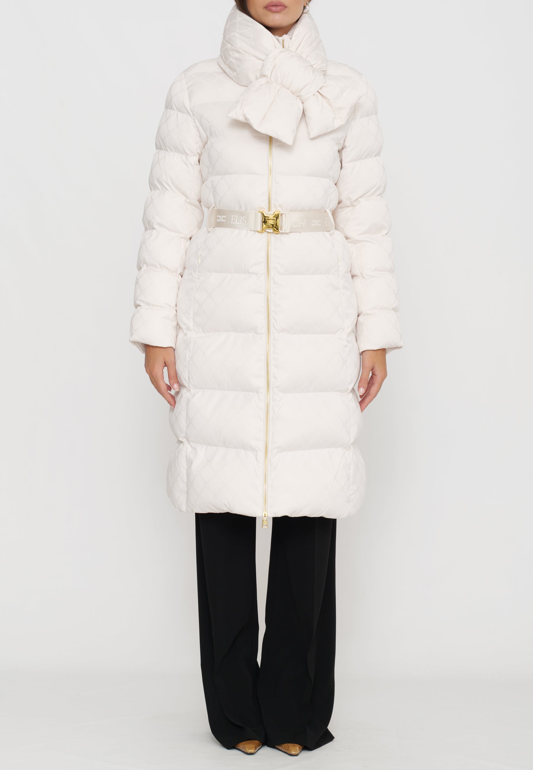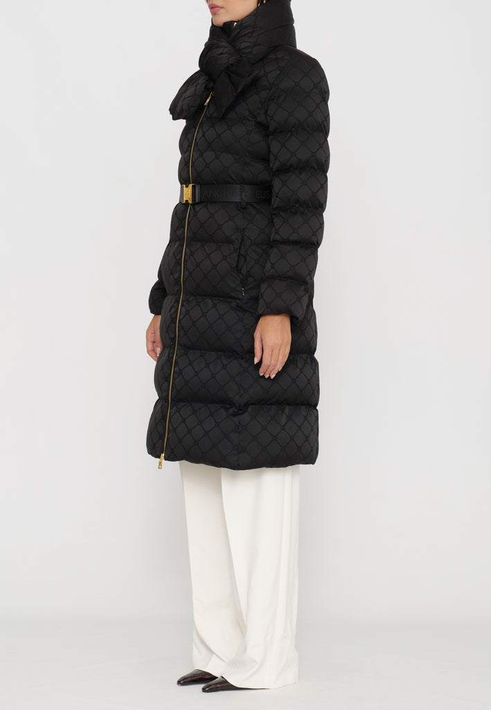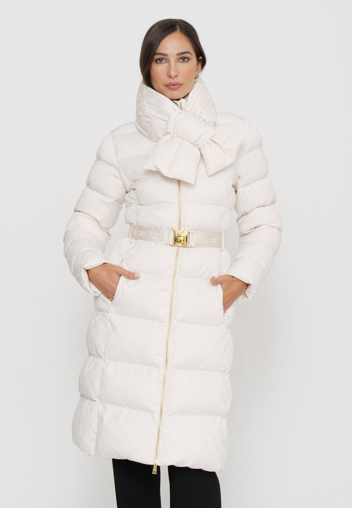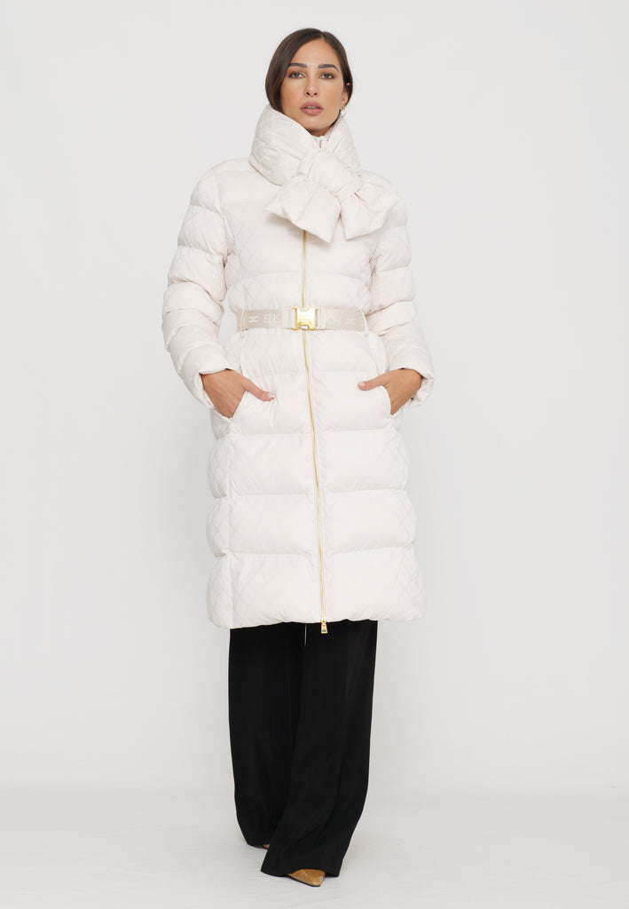 Questo piumino lungo in tessuto vela offre una vestibilità regular, ideale per chi cerca comfort e stile. Il collo è impreziosito da una sciarpa imbottita e amovibile, funzionale per adattarsi alle diverse condizioni climatiche. Le tasche con zip invisibile mantengono il design pulito, mentre il raffinato pattern jacquard a losanga dona una texture sofisticata. La cintura in vita con fibbia permette di valorizzare la silhouette, donando un tocco di eleganza e struttura al capo. Perfetto per chi desidera un look contemporaneo e ricercato durante la stagione fredda.