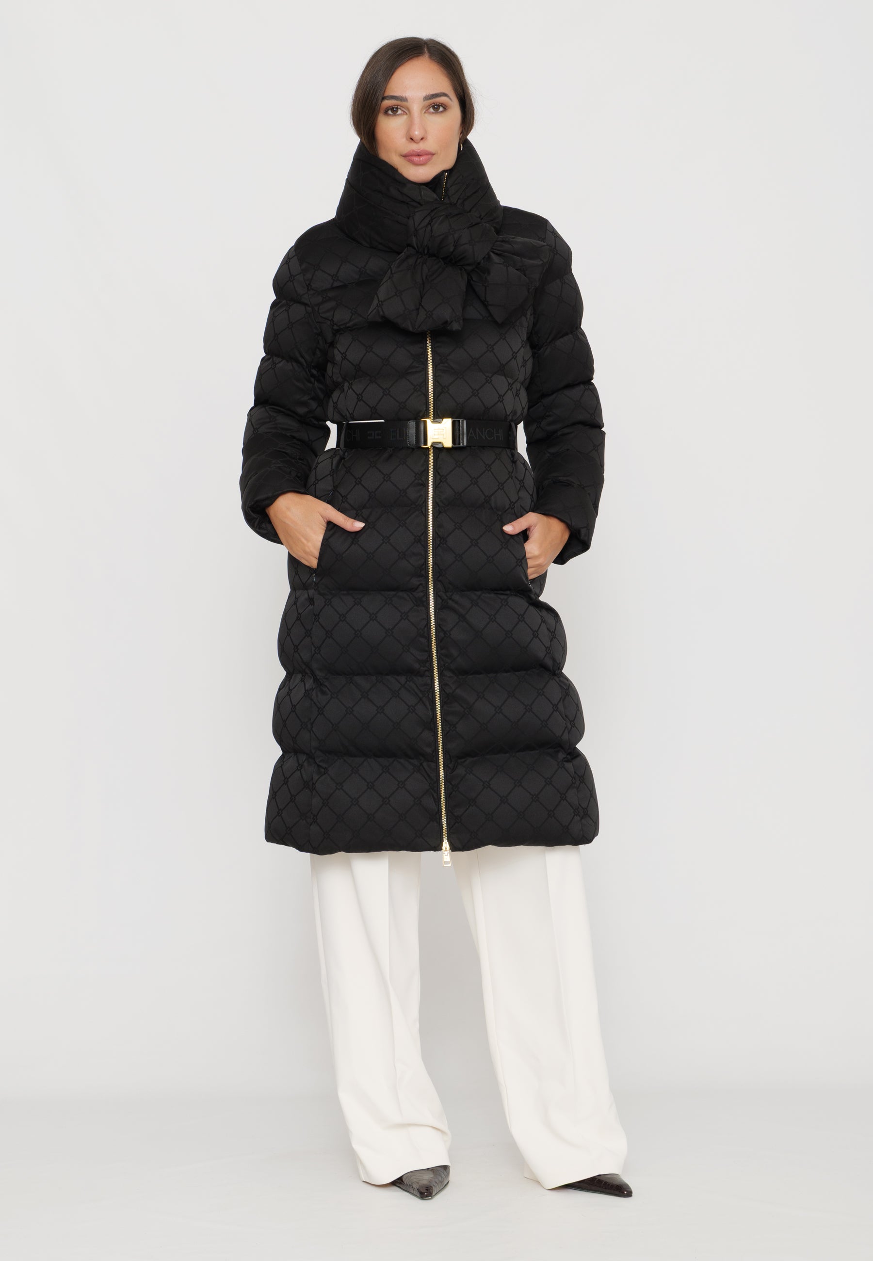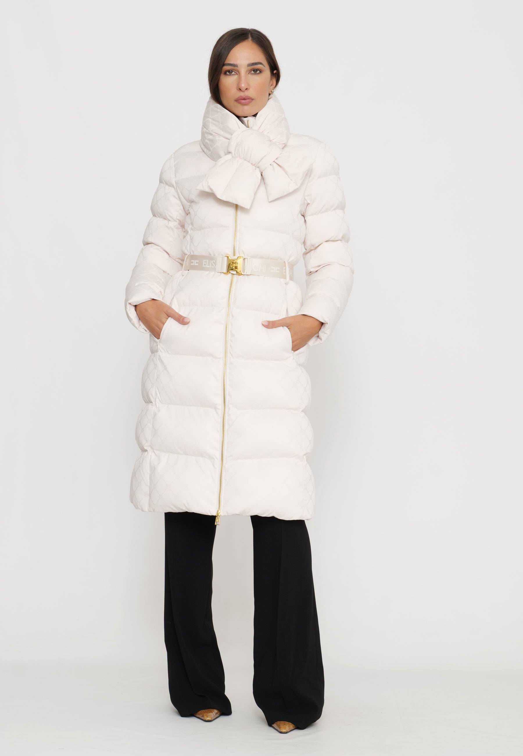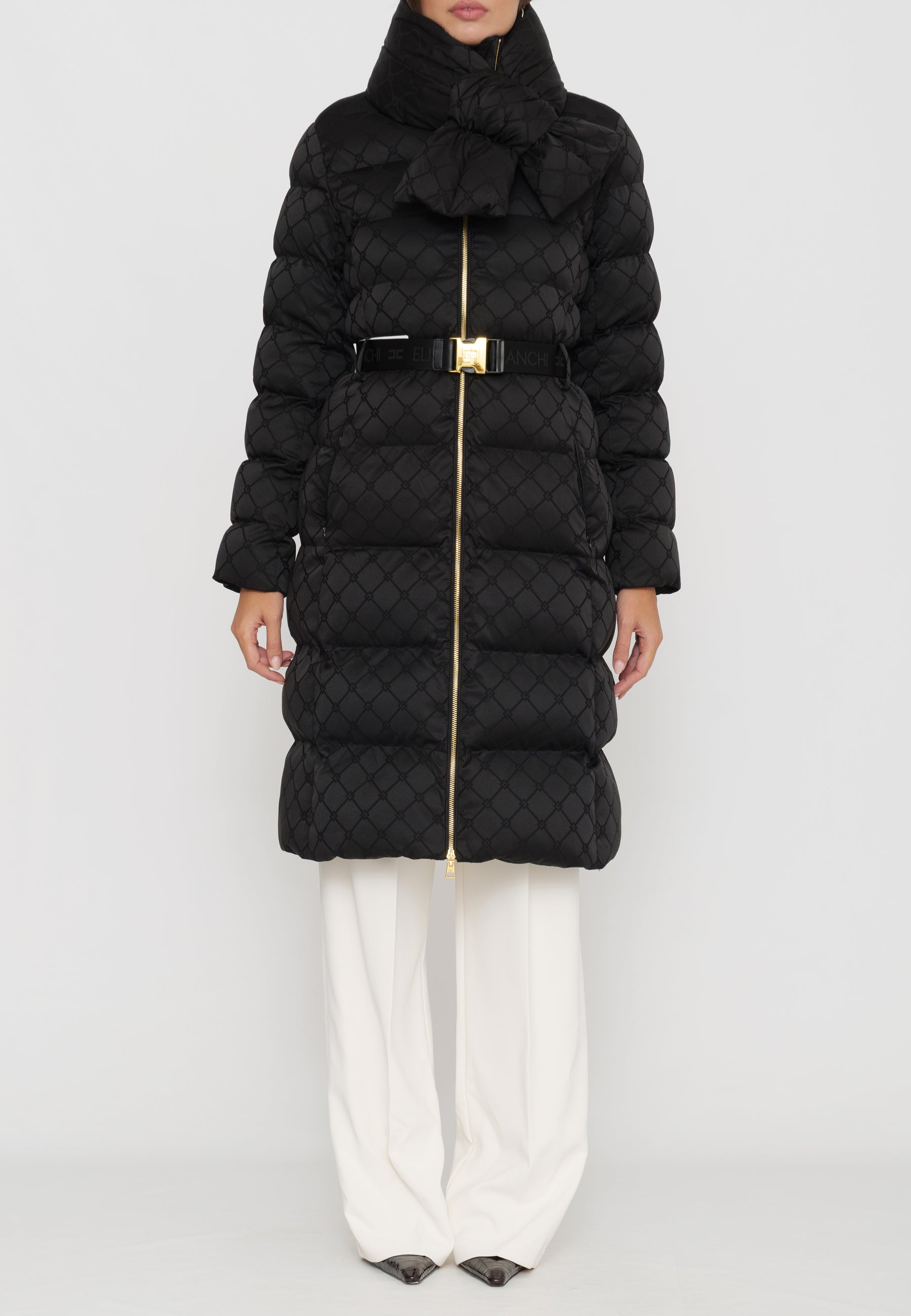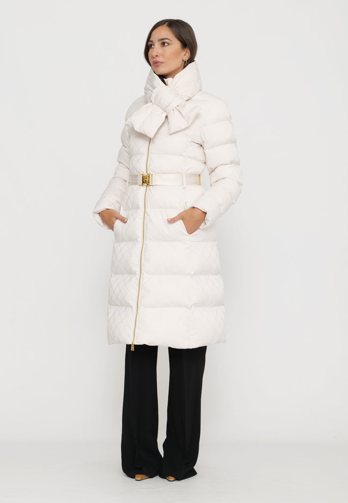 Questo piumino lungo in tessuto vela offre una vestibilità regular, ideale per chi cerca comfort e stile. Il collo è impreziosito da una sciarpa imbottita e amovibile, funzionale per adattarsi alle diverse condizioni climatiche. Le tasche con zip invisibile mantengono il design pulito, mentre il raffinato pattern jacquard a losanga dona una texture sofisticata. La cintura in vita con fibbia permette di valorizzare la silhouette, donando un tocco di eleganza e struttura al capo. Perfetto per chi desidera un look contemporaneo e ricercato durante la stagione fredda.