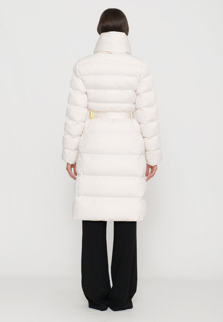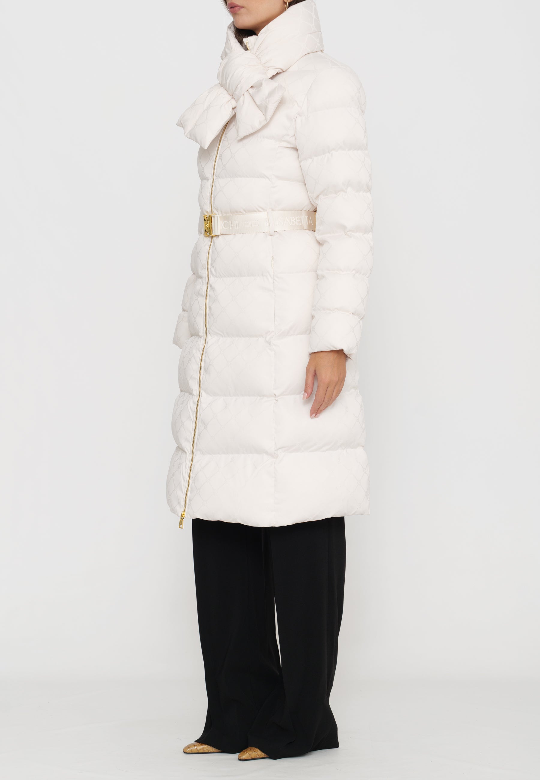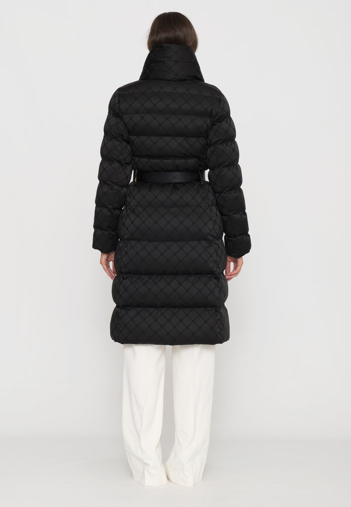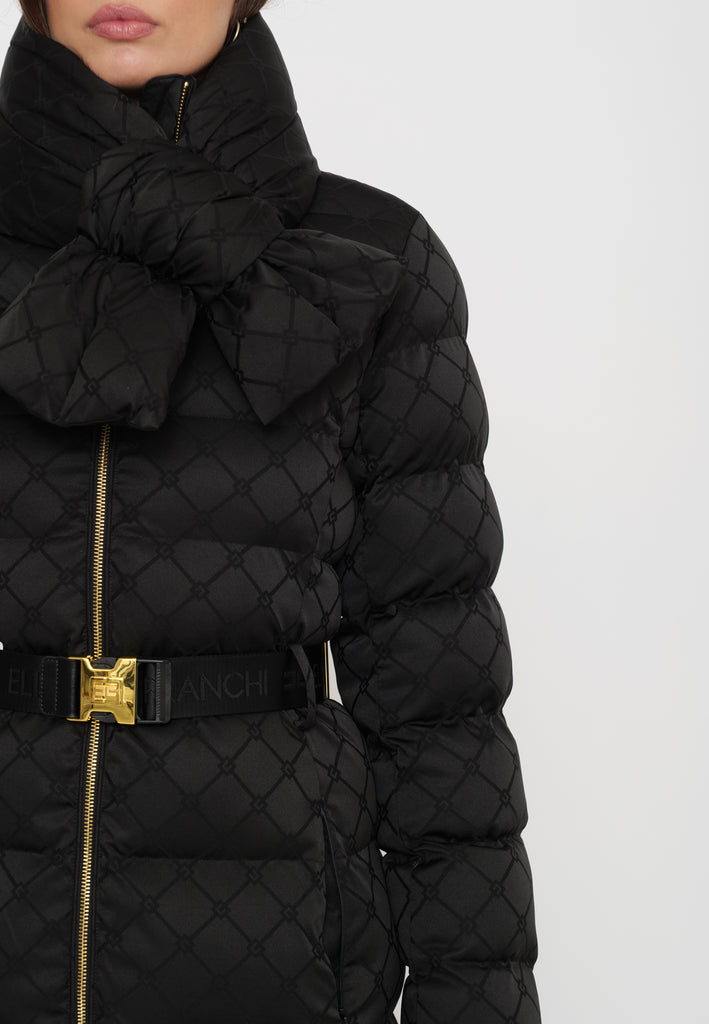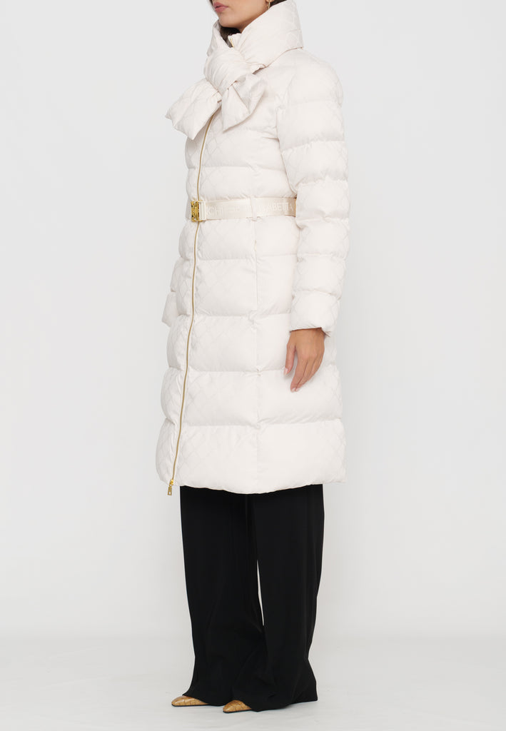 Questo piumino lungo in tessuto vela offre una vestibilità regular, ideale per chi cerca comfort e stile. Il collo è impreziosito da una sciarpa imbottita e amovibile, funzionale per adattarsi alle diverse condizioni climatiche. Le tasche con zip invisibile mantengono il design pulito, mentre il raffinato pattern jacquard a losanga dona una texture sofisticata. La cintura in vita con fibbia permette di valorizzare la silhouette, donando un tocco di eleganza e struttura al capo. Perfetto per chi desidera un look contemporaneo e ricercato durante la stagione fredda.