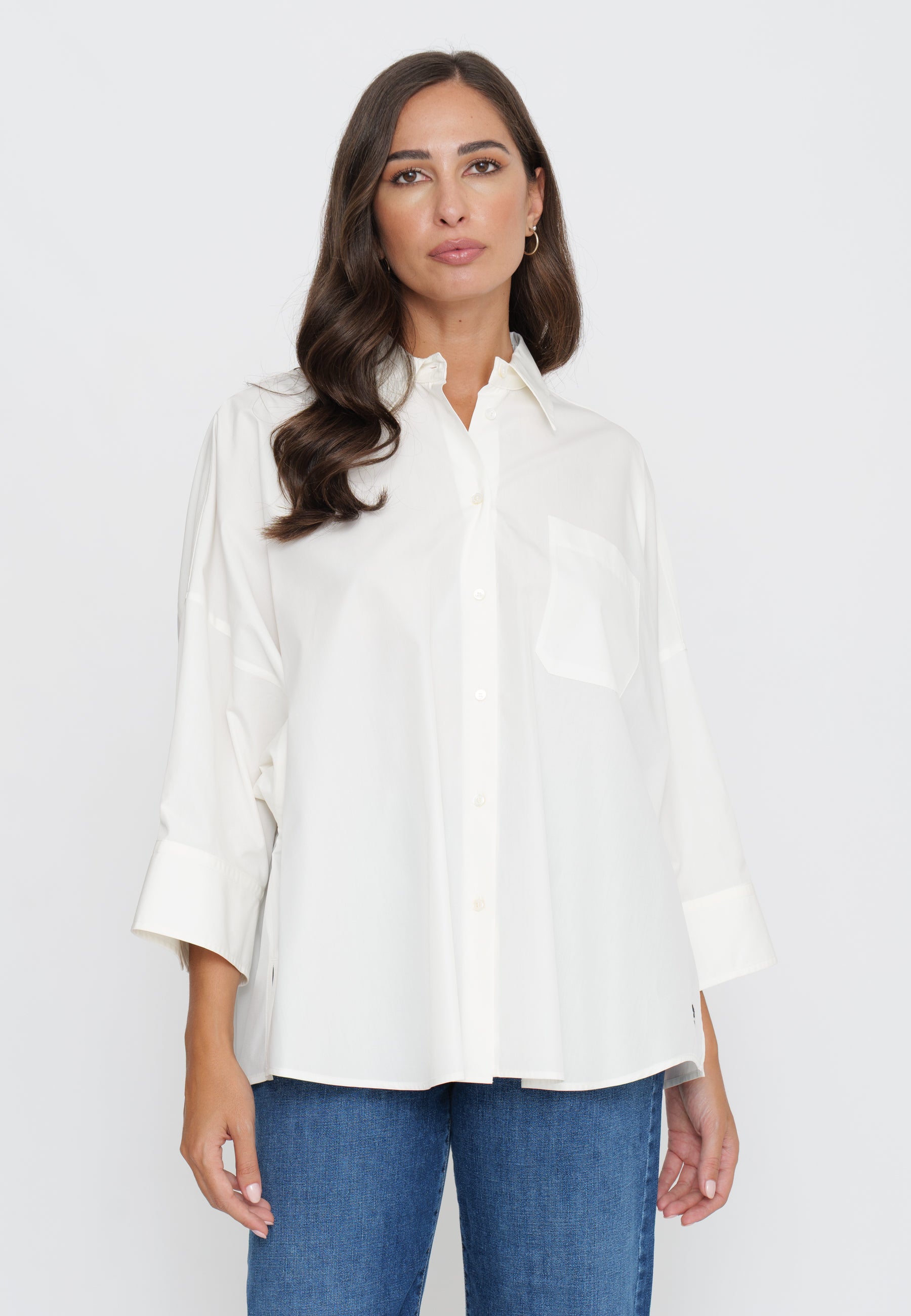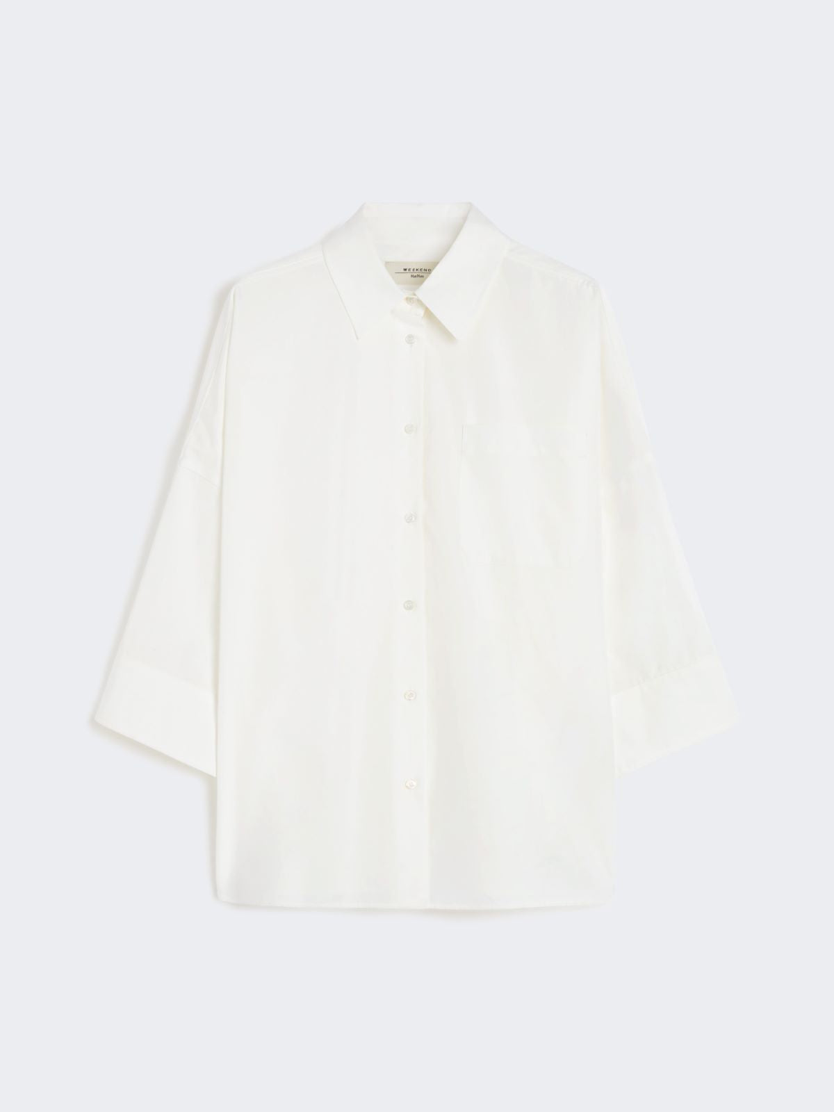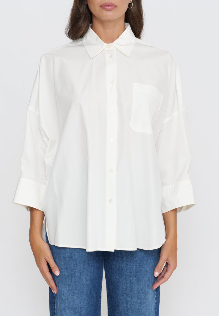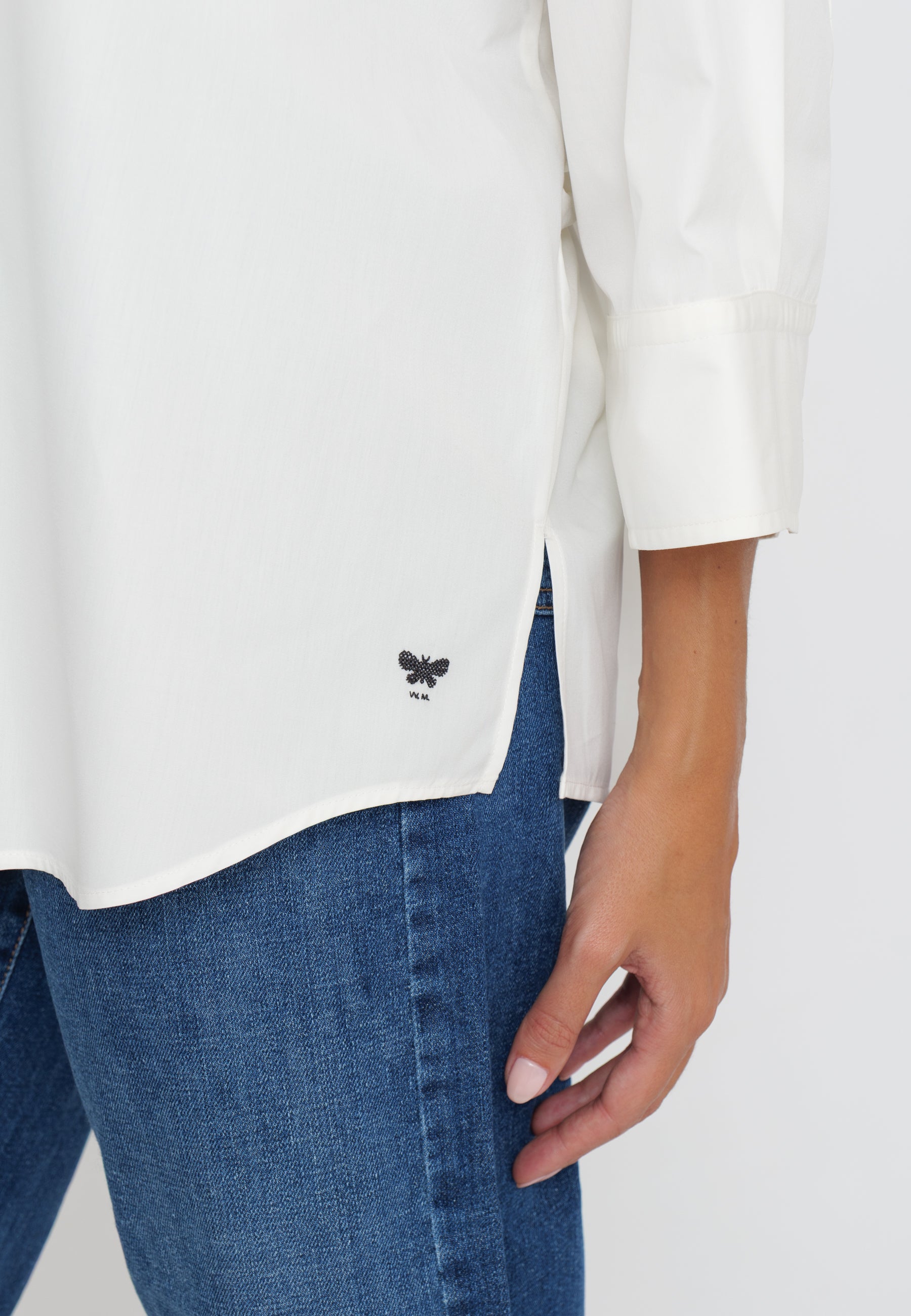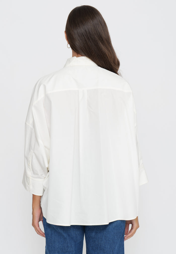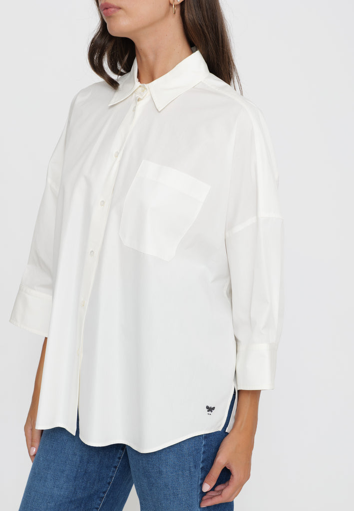 Camicia dal volume oversize con logo a farfalla ricamato sul fondo sinistro e ampie maniche 3/4 a giro basso.