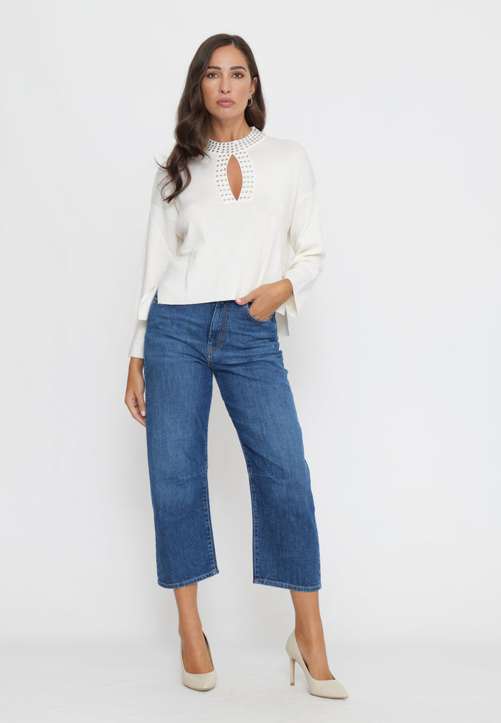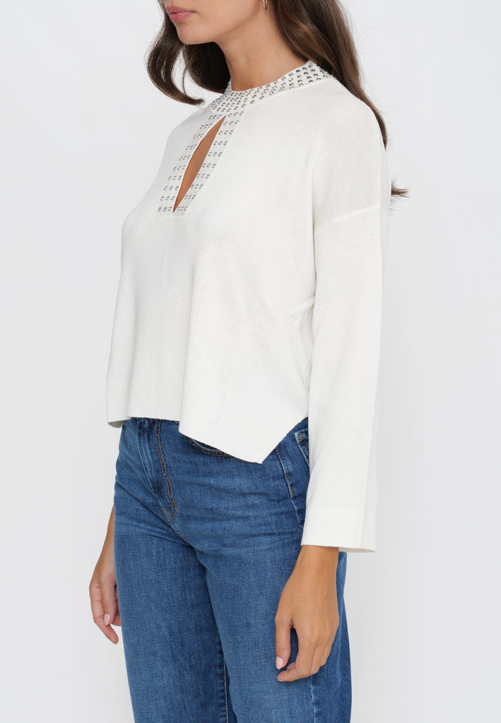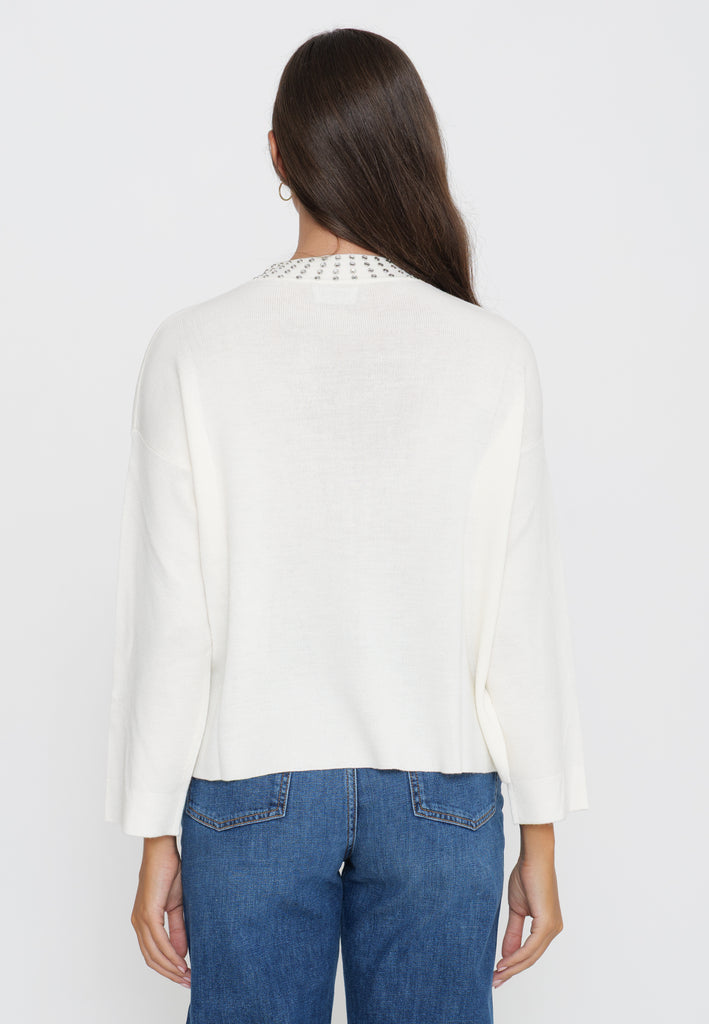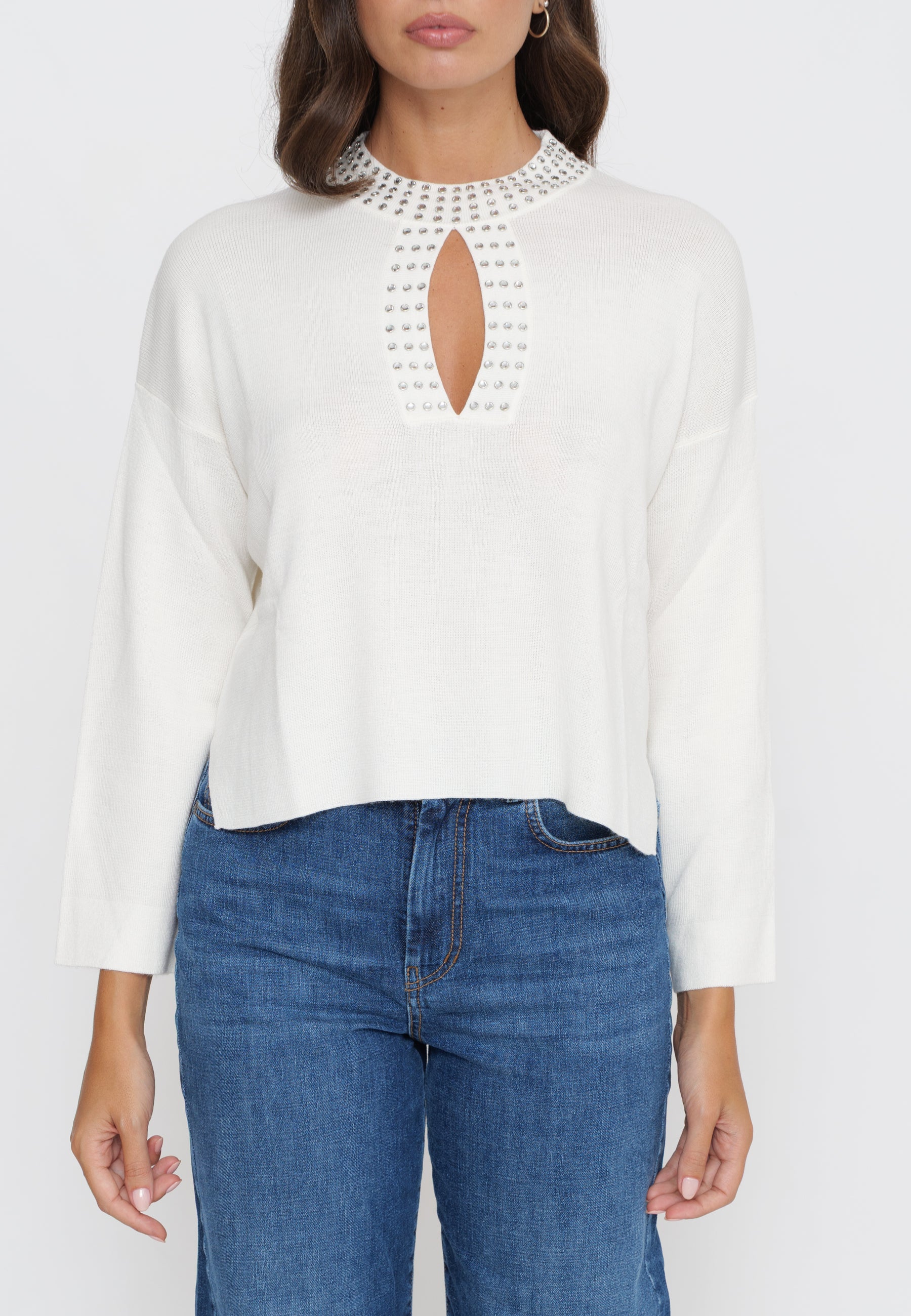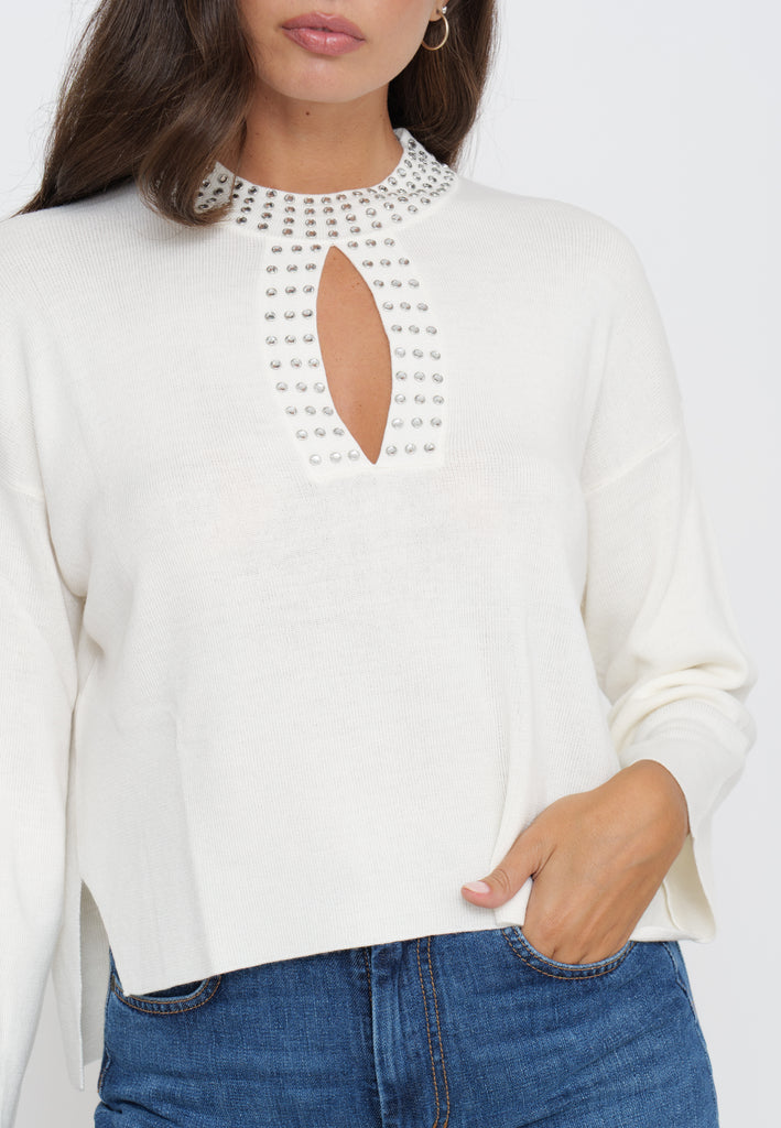 Maglia con borchie posizionate con cura, aggiungono un tocco contemporaneo al capo, rendendolo un capo di spicco che bilancia raffinatezza e design moderno. Perfetto per chi cerca un maglione di grande impatto che valorizzi qualsiasi outfit, mantenendo comfort e qualità.
