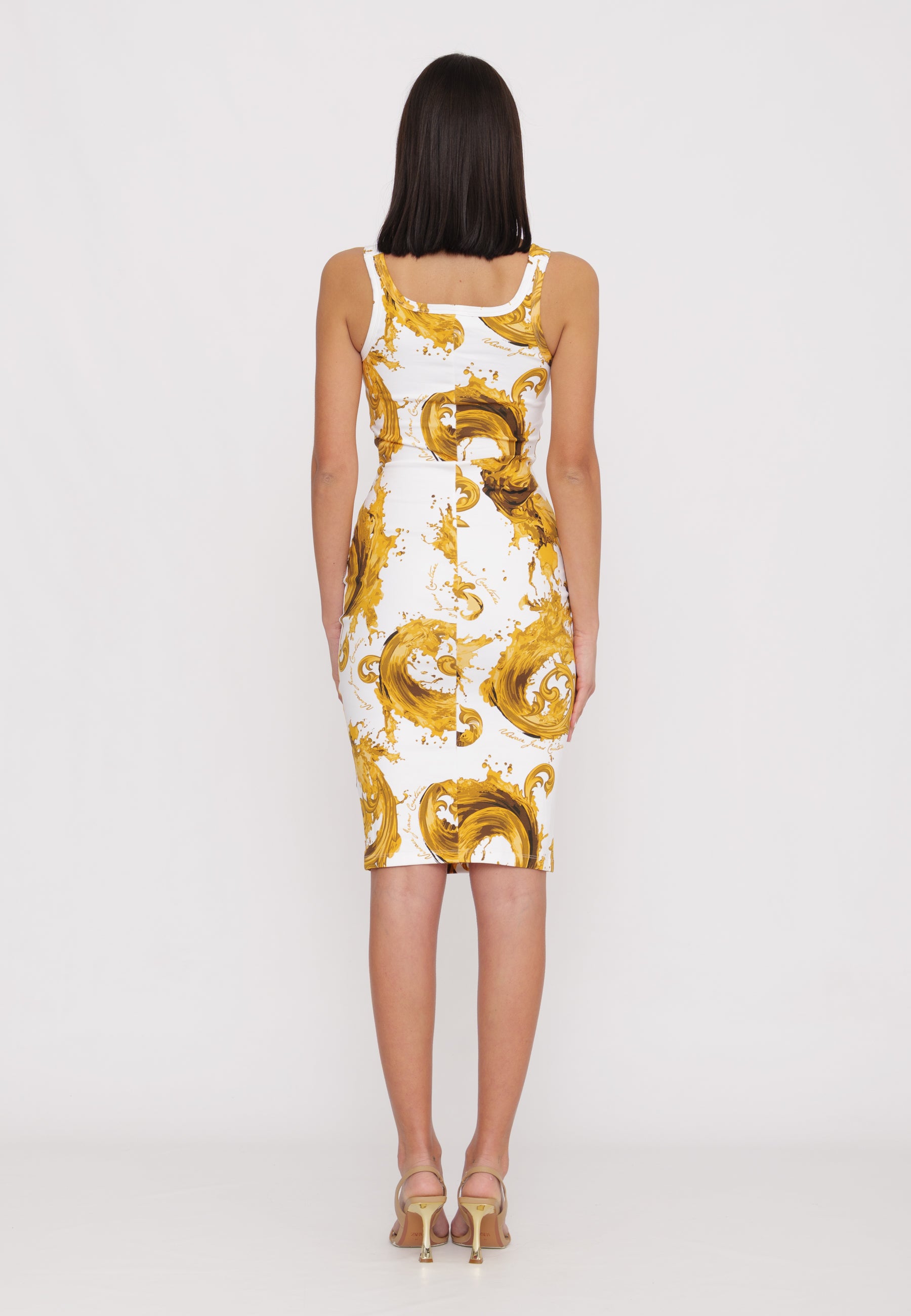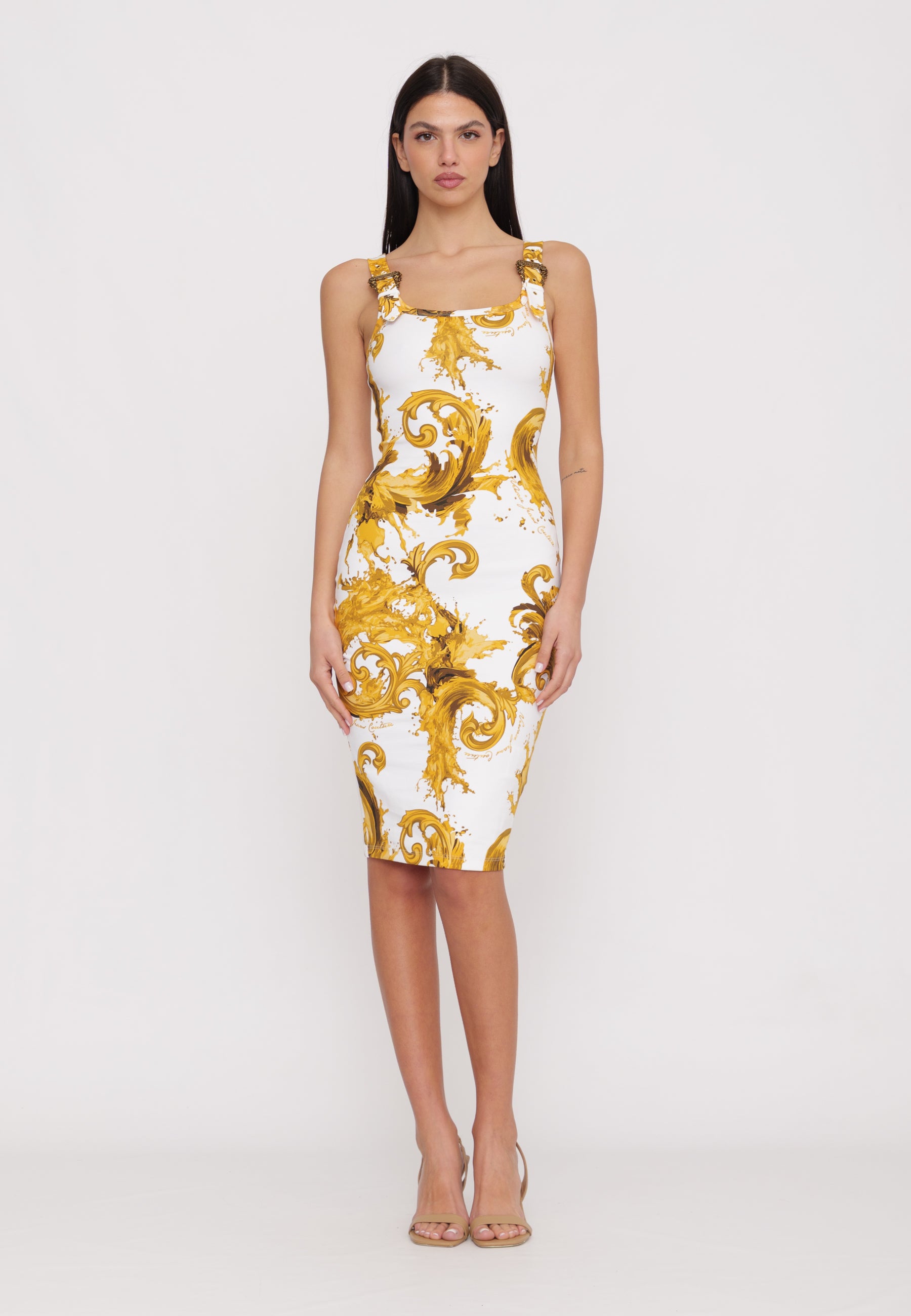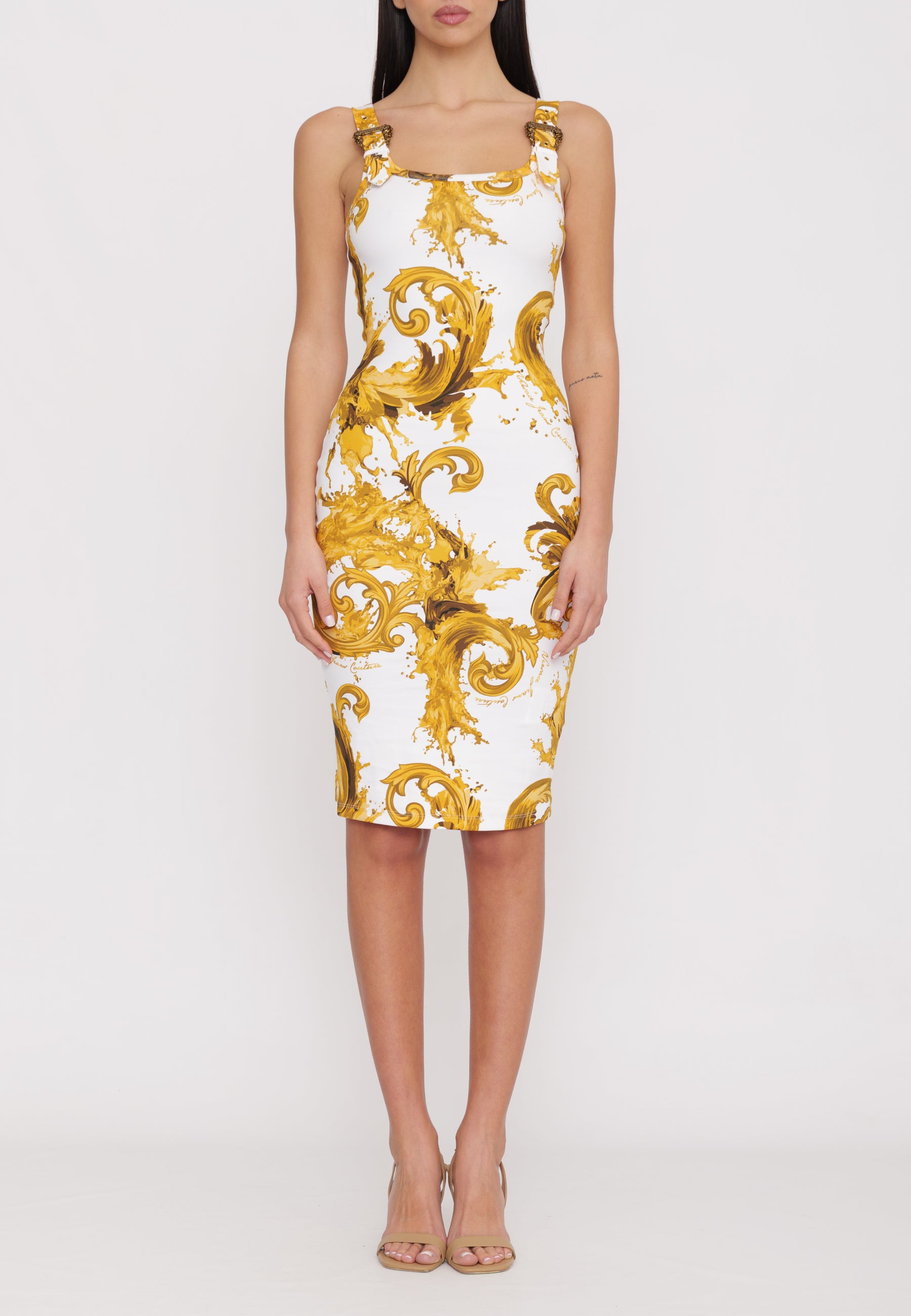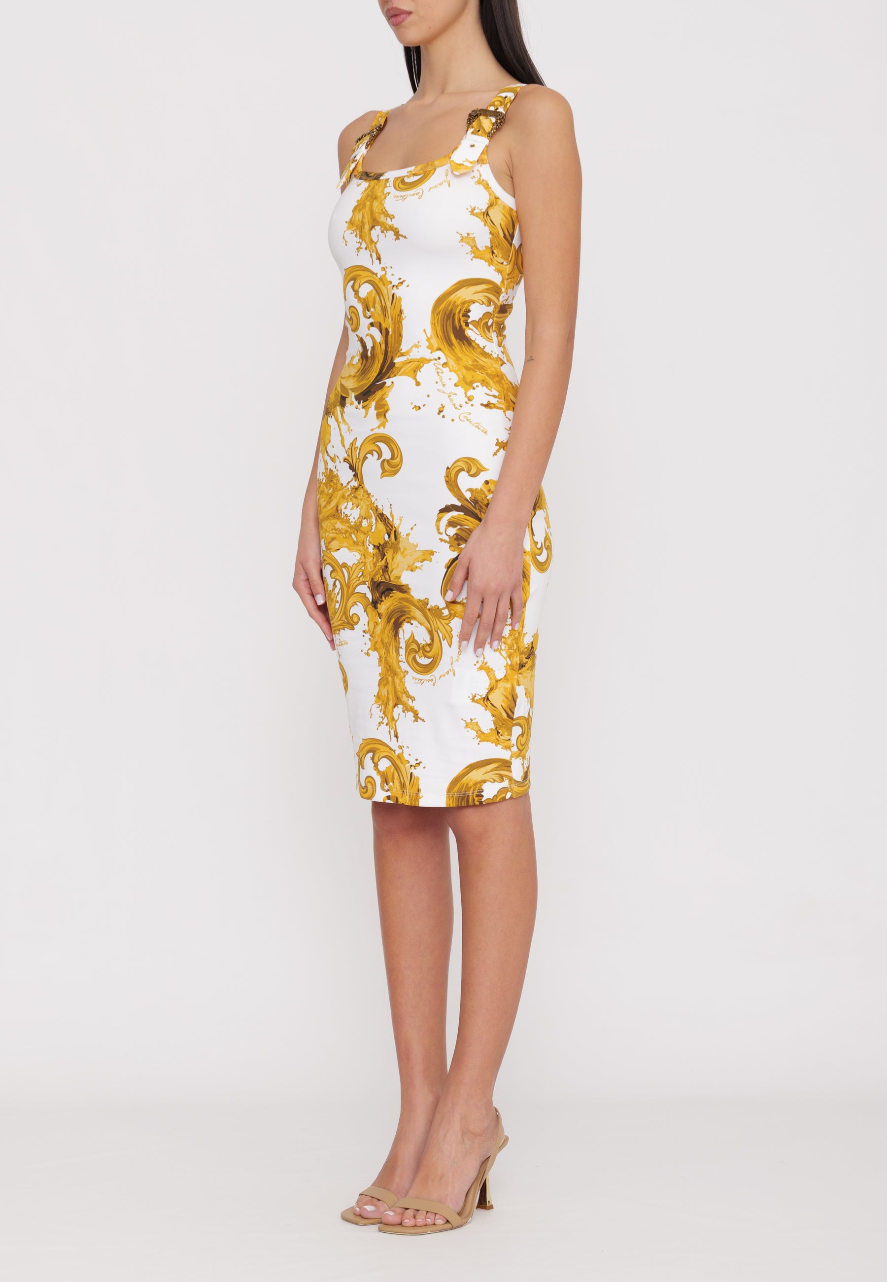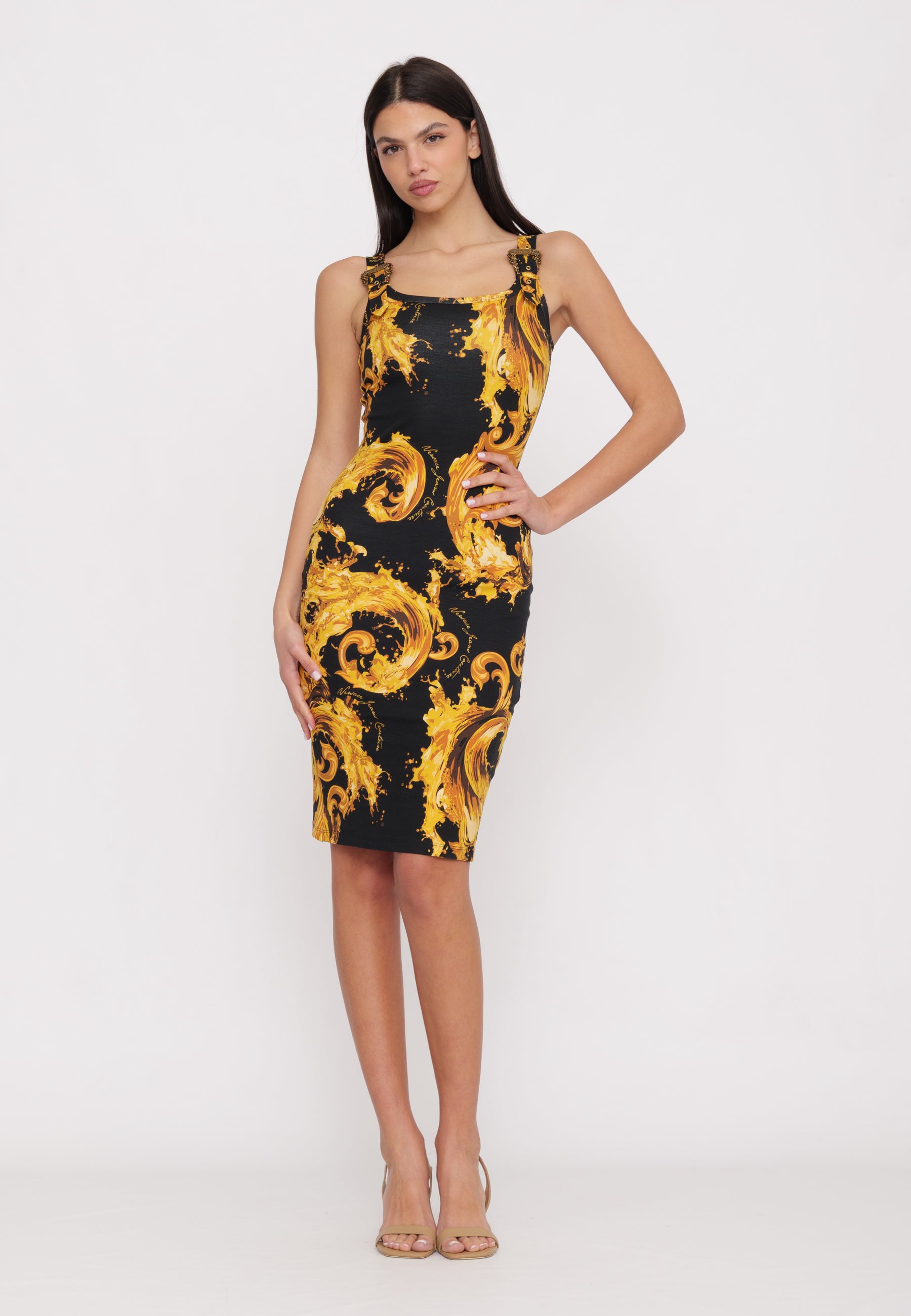 Abito in tessuto interlock elasticizzato che coniuga comfort e stile con la firma inconfondibile di Versace Jeans Couture. Il capo presenta una stampa barocco che cattura l'essenza del design italiano, arricchito da dettagli sofisticati come la fibbia sulle bretelle. La composizione elasticizzata garantisce una vestibilità impeccabile e libertà di movimento, mentre la qualità costruttiva assicura durabilità nel tempo. Un pezzo versatile che eleva qualsiasi guardaroba, perfetto per chi ricerca eleganza contemporanea con un tocco di lusso accessibile.