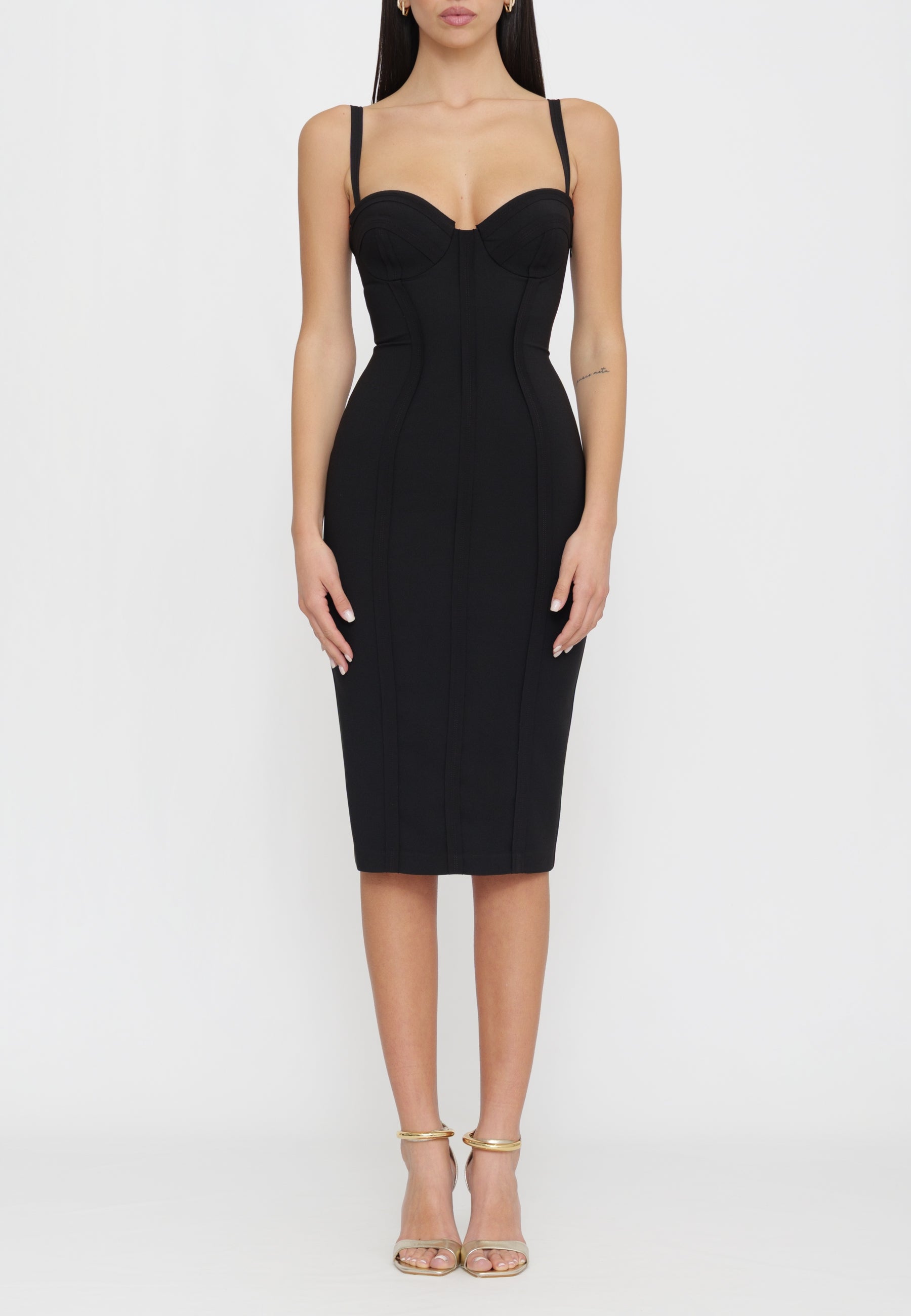 Abito elegante in crêpe leggero con silhouette aderente e raffinata. Il capo reinterpreta la corsetteria con un top stile bustier classico, mentre i tagli strategici sottolineati da cuciture esterne e finiture a taglio vivo creano un effetto strutturato e sofisticato. Impunture precise completano i dettagli, regalando al vestito un'allure contemporanea e sensuale. Perfetto per occasioni speciali che richiedono stile e personalità.