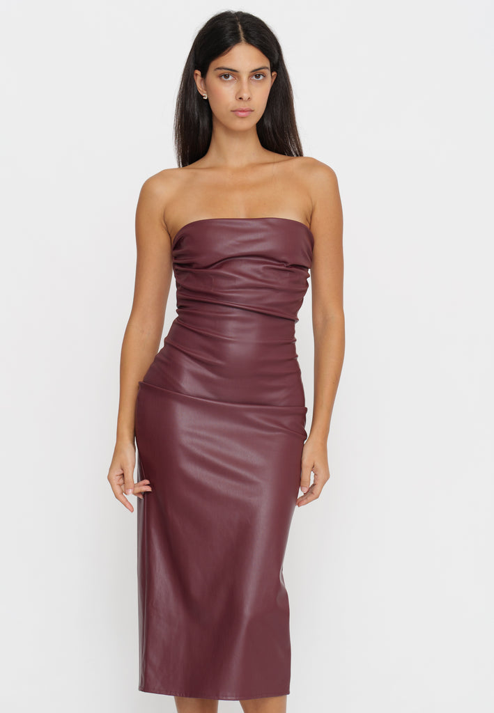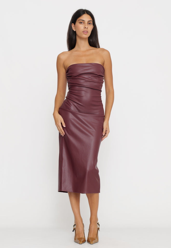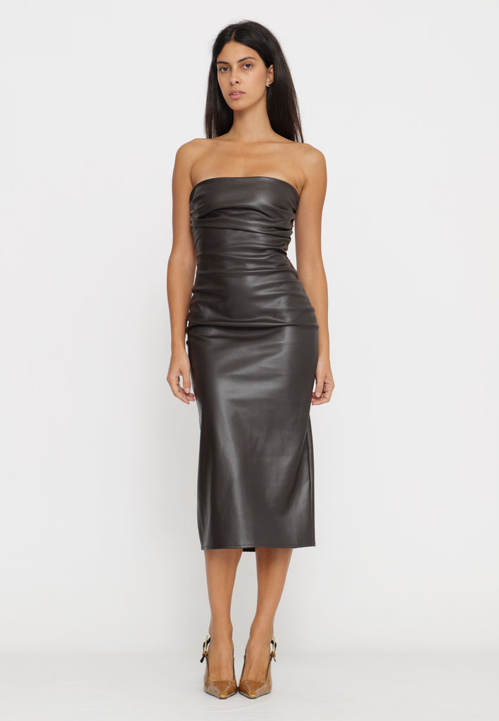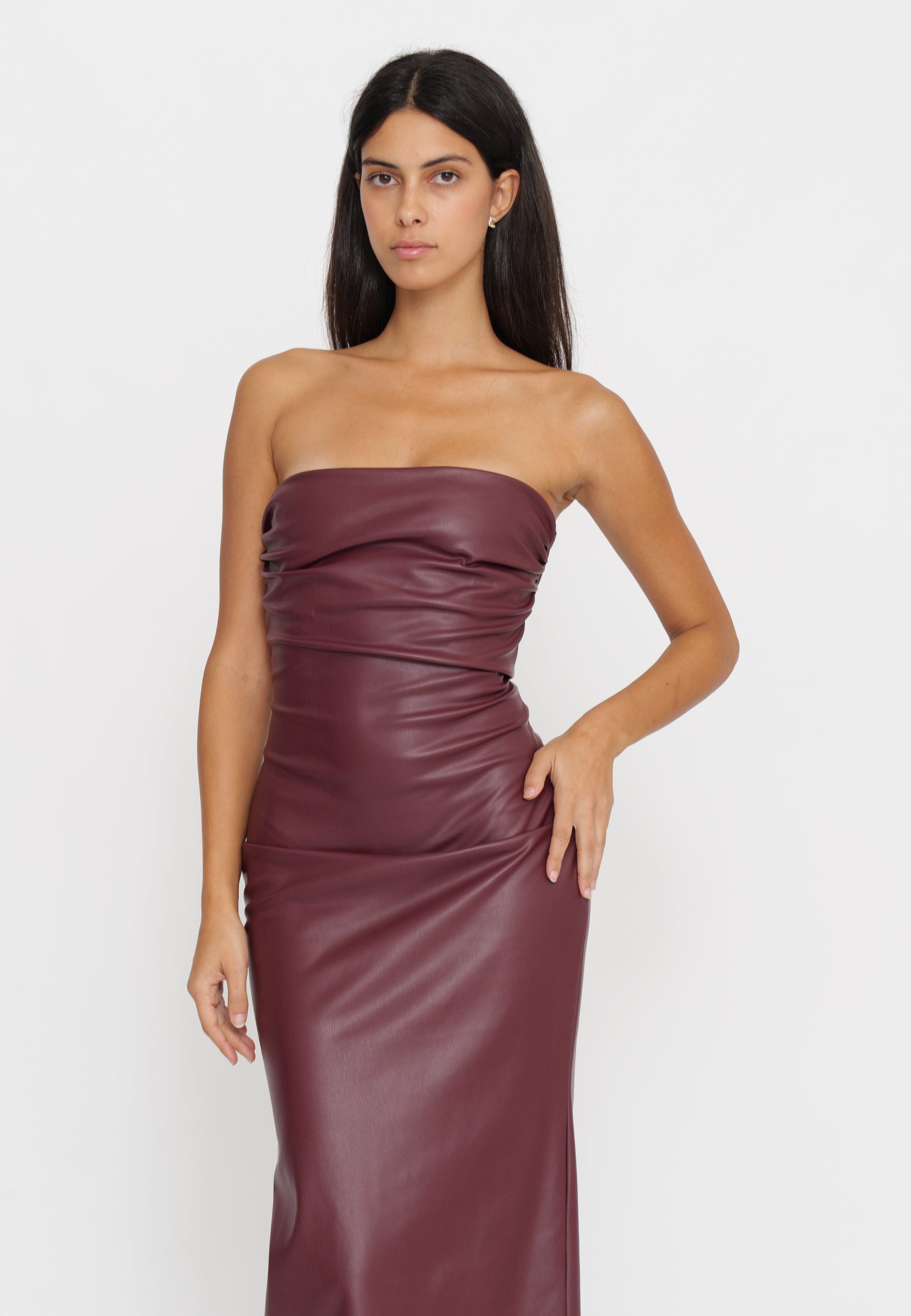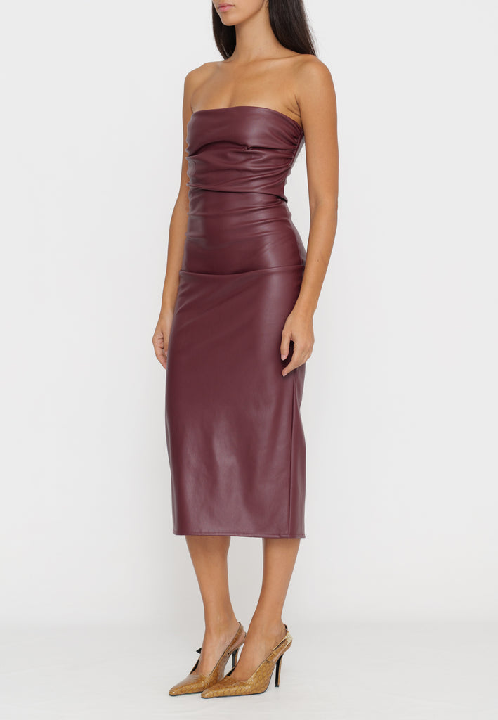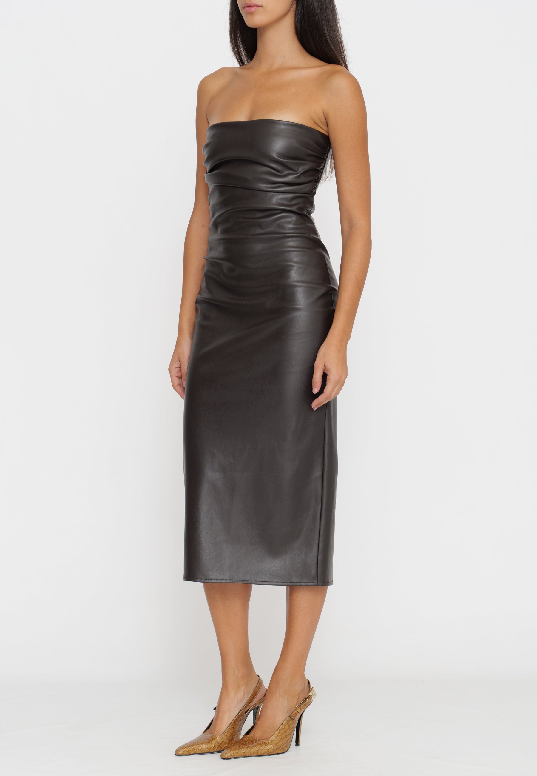 Questo abito tubino in ecopelle unisce stile e sostenibilità, caratterizzato da un elegante drappeggio che valorizza la silhouette. Il taglio aderente enfatizza la figura, mentre lo spacco sul retro aggiunge un tocco di sensualità e praticità nei movimenti. Perfetto per occasioni formali o serate speciali, offre un look sofisticato e contemporaneo senza rinunciare al comfort.