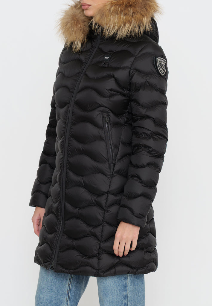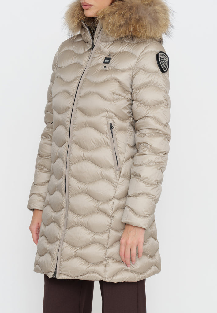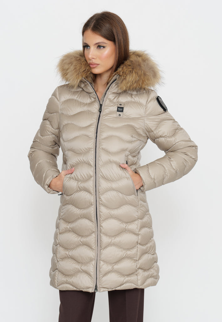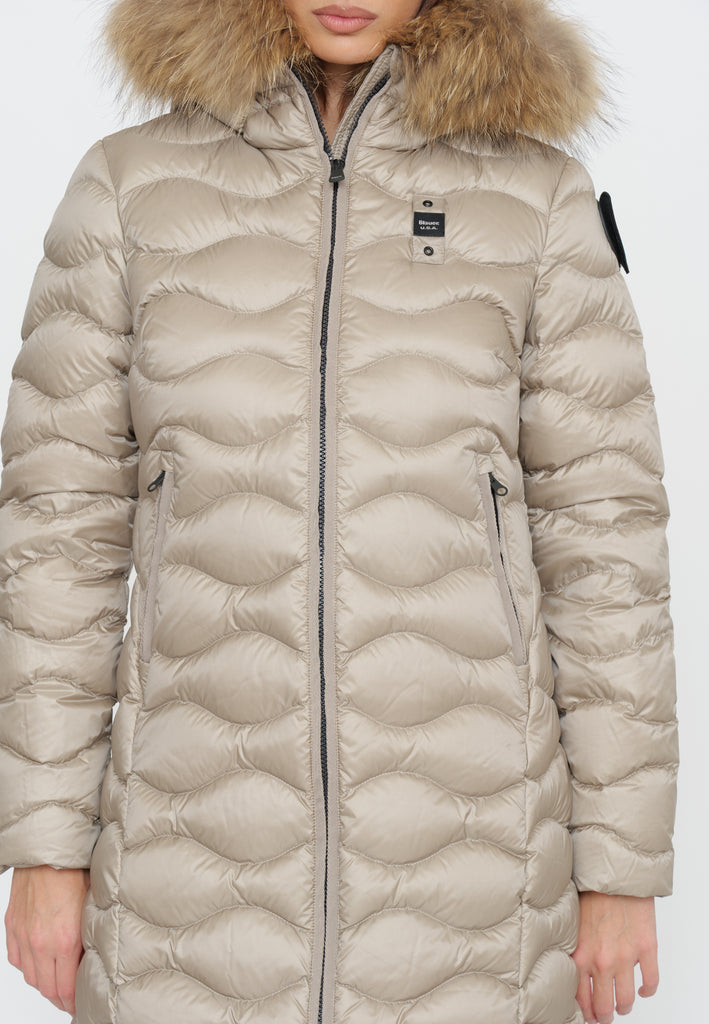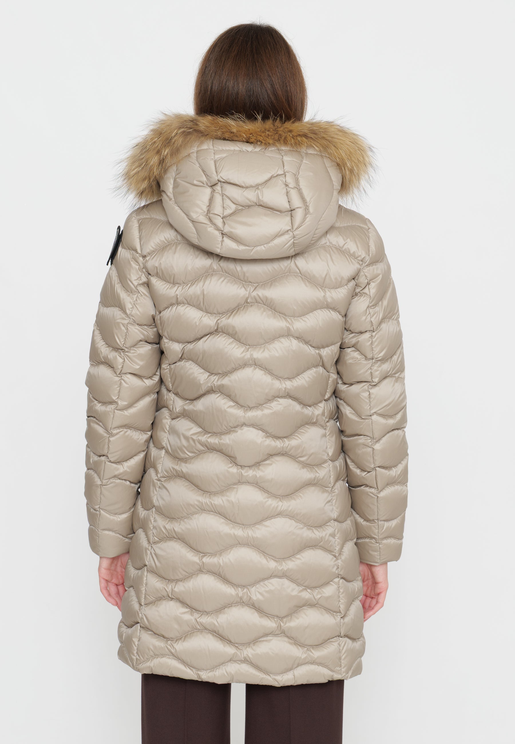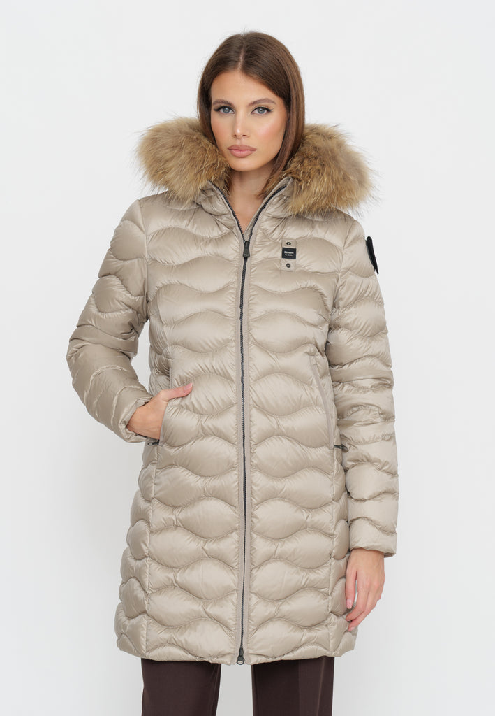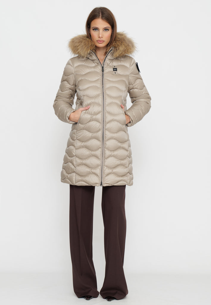 Piumino lungo donna dalla silhouette elegante e raffinata, caratterizzato da trapuntatura orizzontale che esalta la linea del punto vita. Realizzato con imbottitura in piuma 90/10 (250 gr), garantisce isolamento termico superiore mantenendo leggerezza. Il cappuccio fisso presenta profilo in vera pelliccia removibile, mentre l'interno in contrasto colore aggiunge un dettaglio sofisticato. Dotato di chiusura zip con copri cursore, tasche esterne e interne con velcro per praticità. Disponibile in tonalità fashion, rappresenta la scelta ideale per chi ricerca qualità costruttiva e stile contemporaneo.
