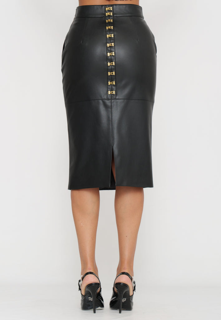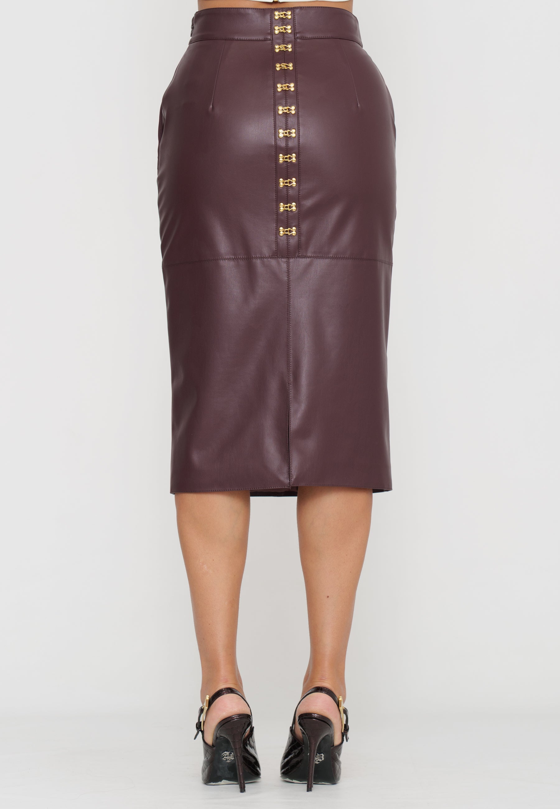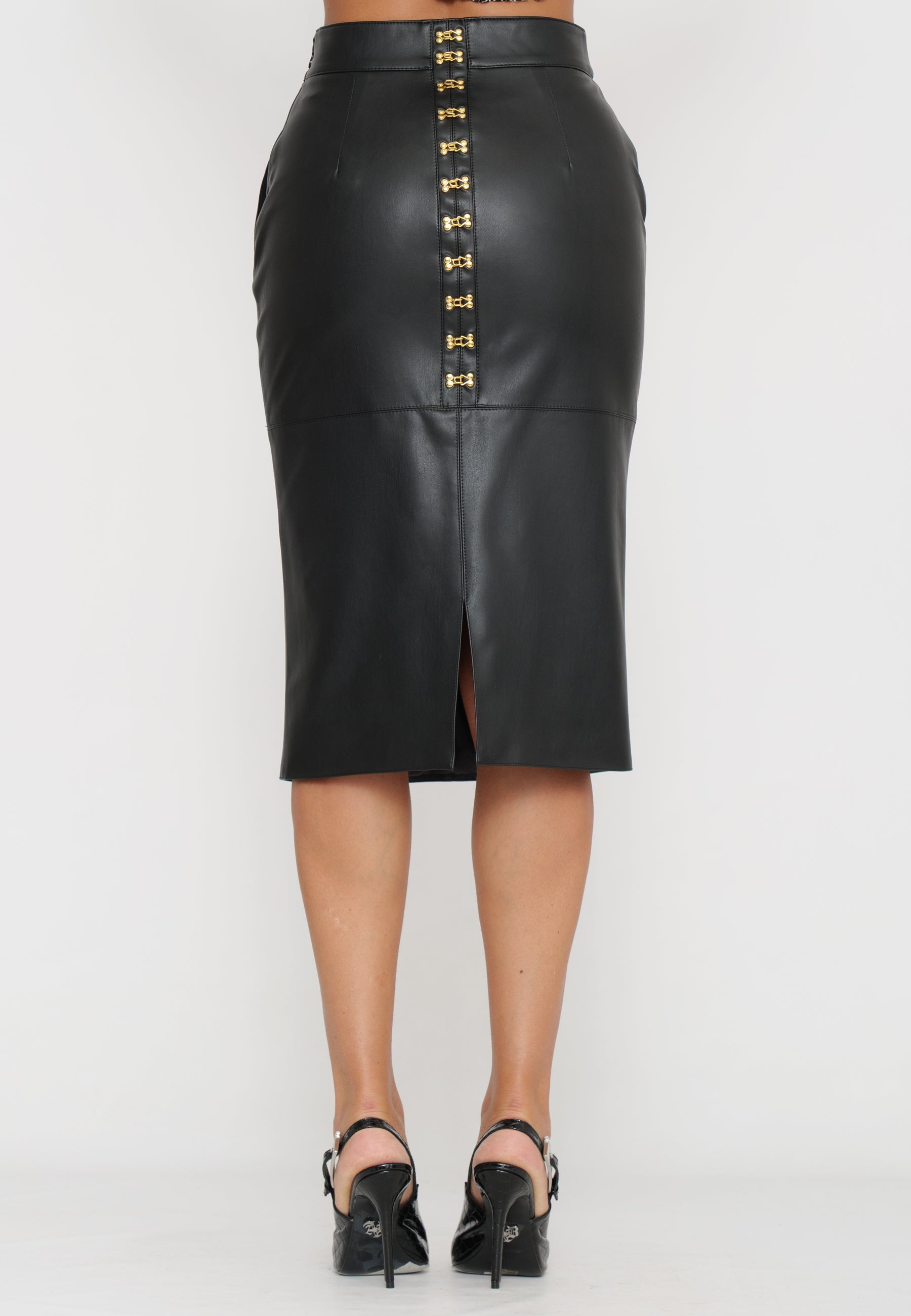 Gonna realizzata in ecopelle di alta qualità, unisce stile e sostenibilità. Il design è completato da eleganti gancetti che aggiungono un tocco di originalità e praticità. Perfetta per un look contemporaneo e sofisticato. Sorprende il retro con ganci gioiello in metallo dorato, a regalare ispirazioni di gusto corsetteria.