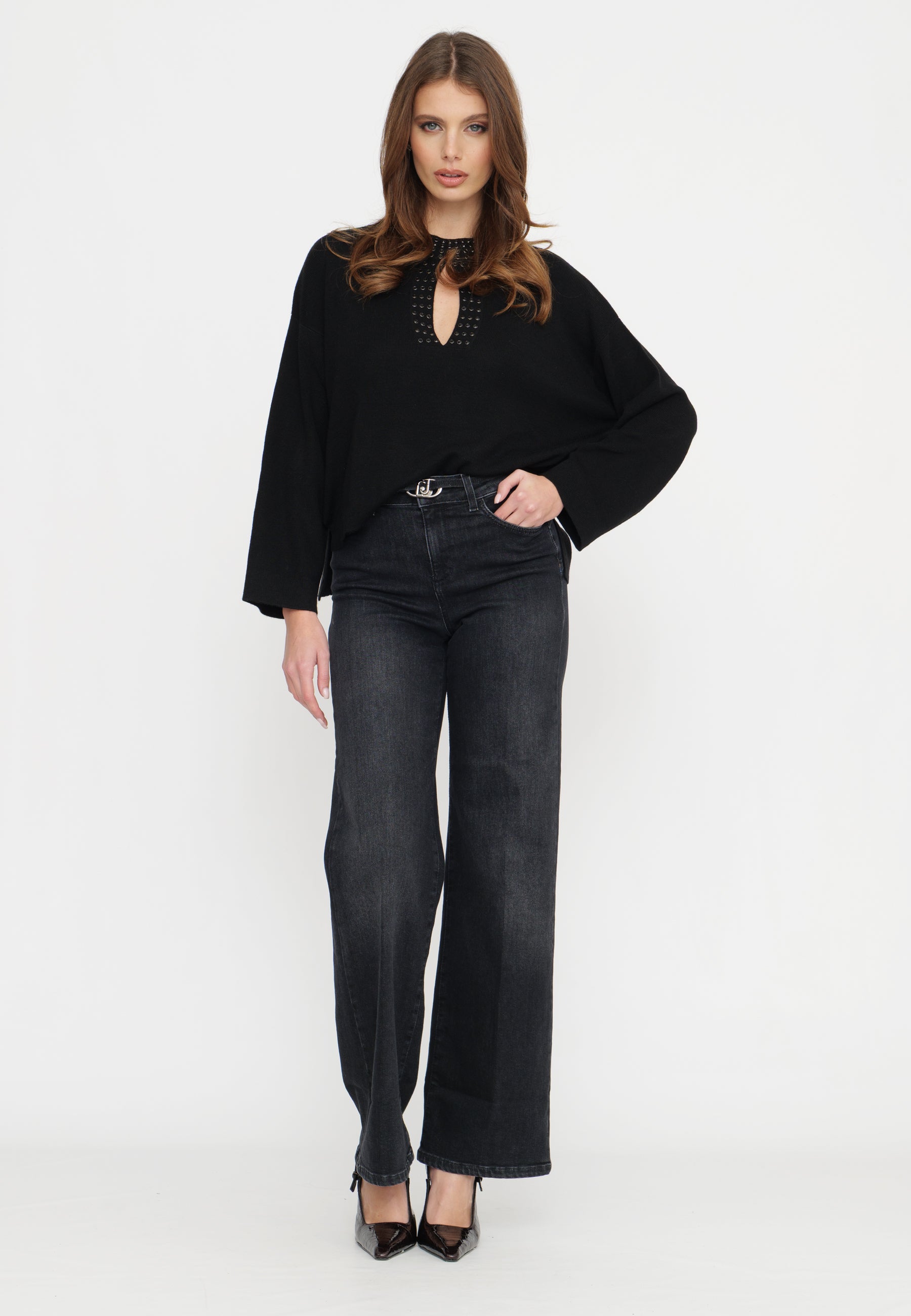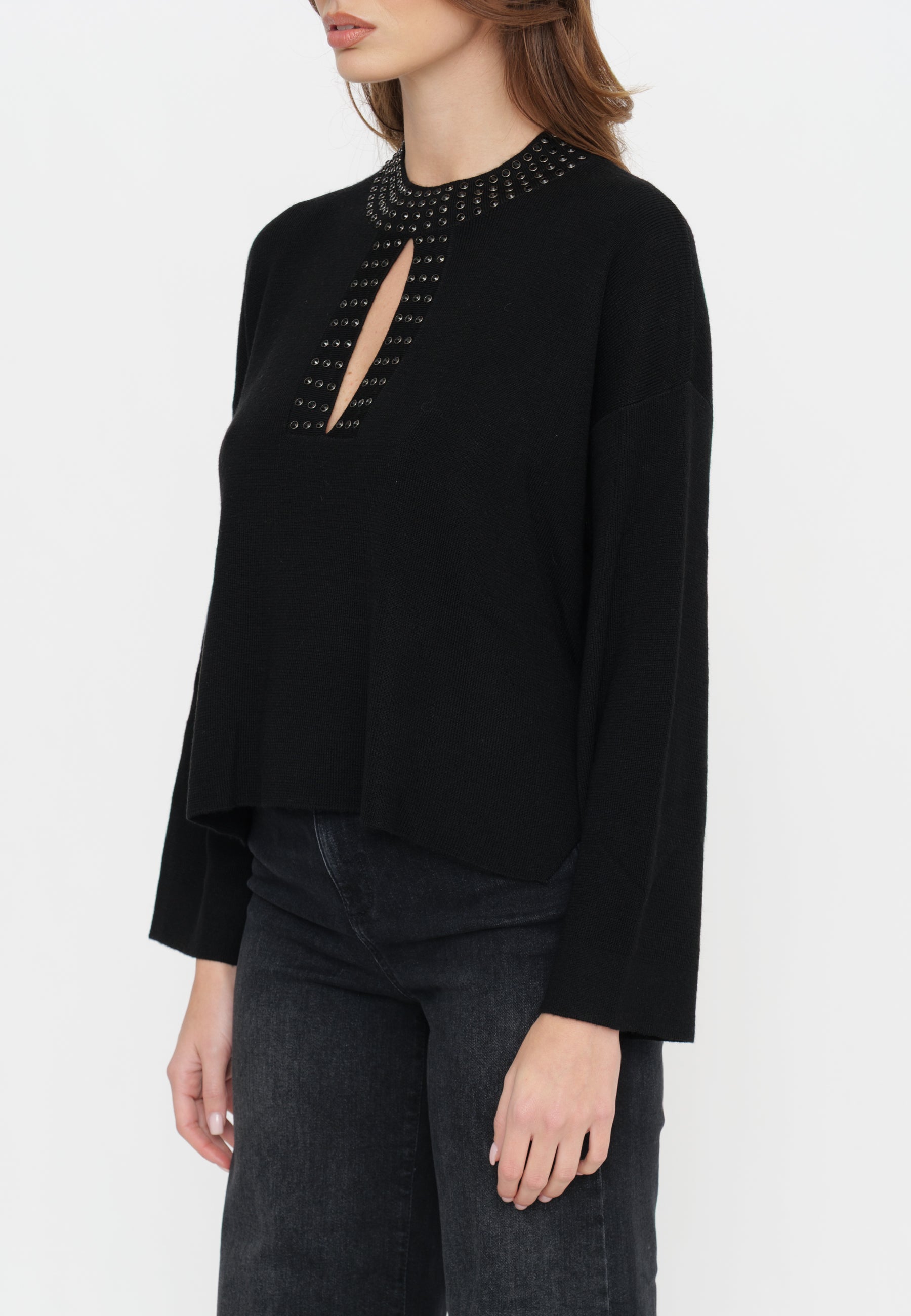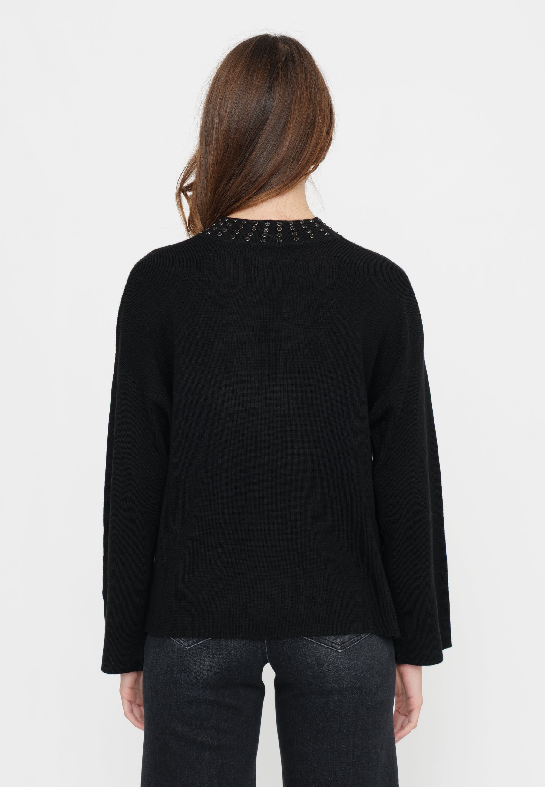 Maglia con borchie posizionate con cura, aggiungono un tocco contemporaneo al capo, rendendolo un capo di spicco che bilancia raffinatezza e design moderno. Perfetto per chi cerca un maglione di grande impatto che valorizzi qualsiasi outfit, mantenendo comfort e qualità.