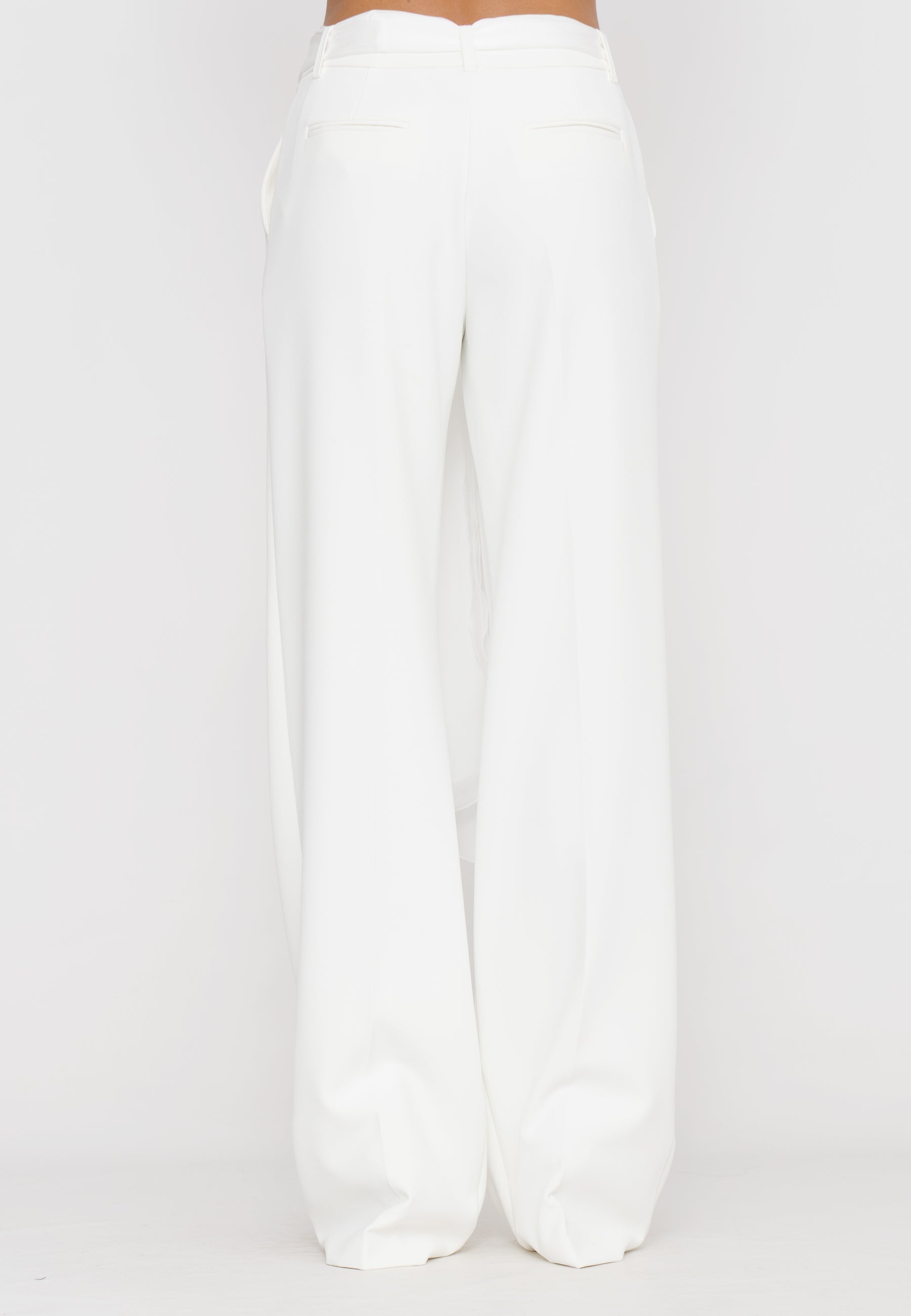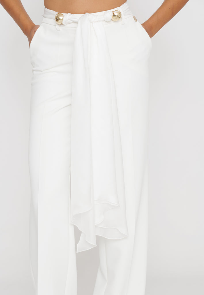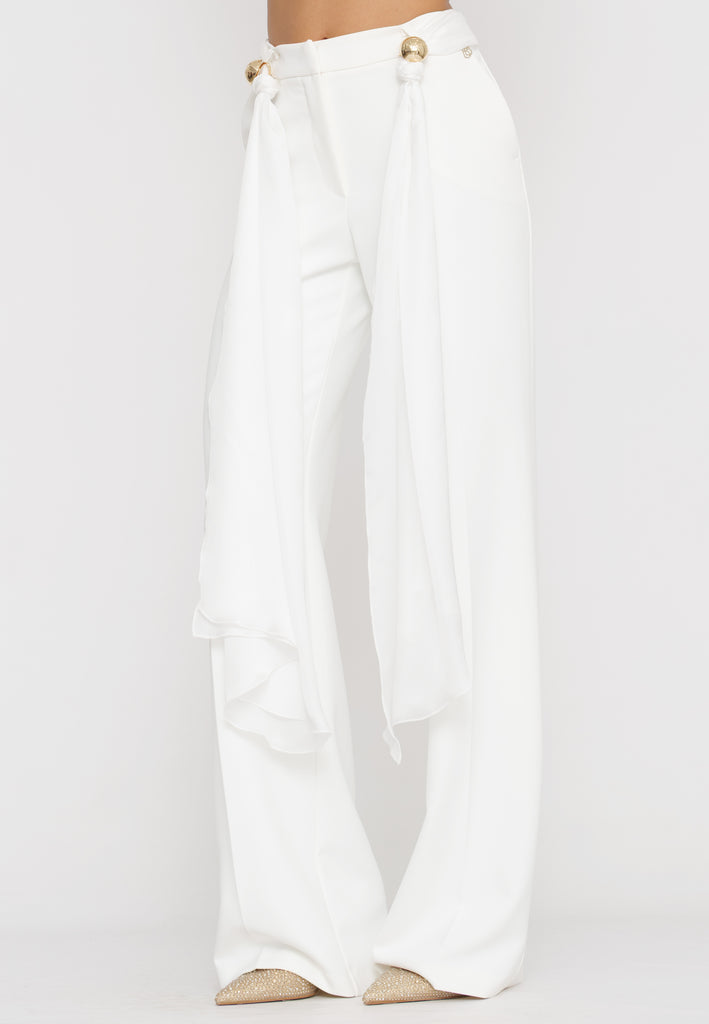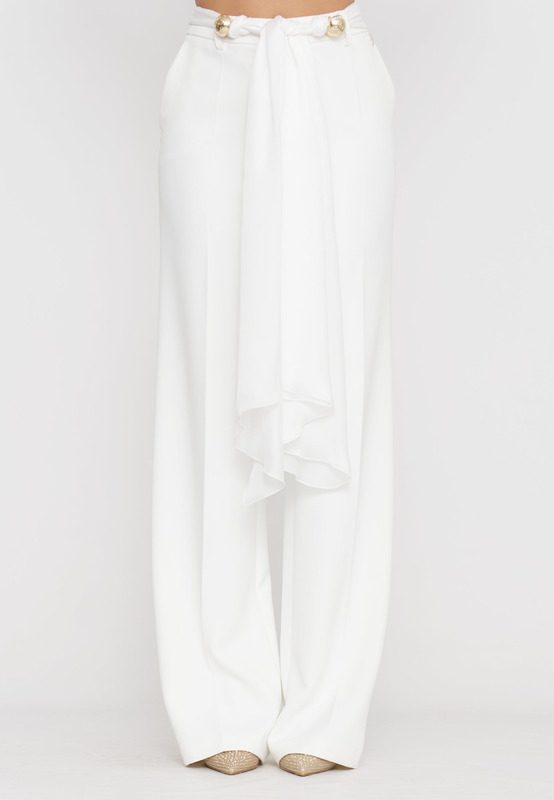 Pantaloni palazzo che offrono un’eleganza senza tempo grazie alla loro linea ampia e fluida. Dotati di una fusciacca removibile in vita, consentono di modulare la silhouette per un look personalizzato e raffinato. Realizzati con materiali di alta qualità, assicurano comfort e vestibilità perfetta, ideali per un outfit sofisticato e versatile.