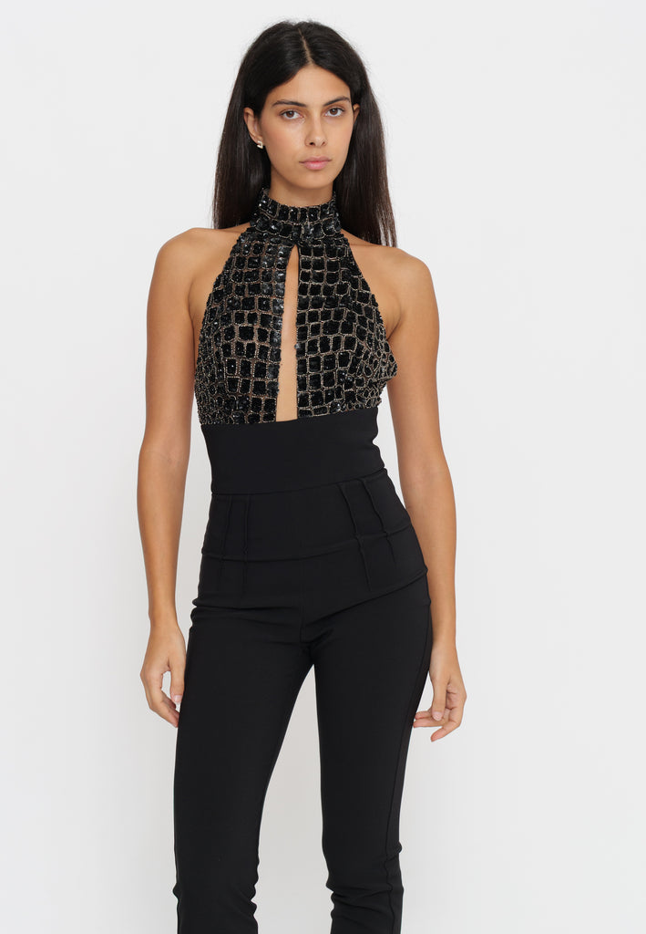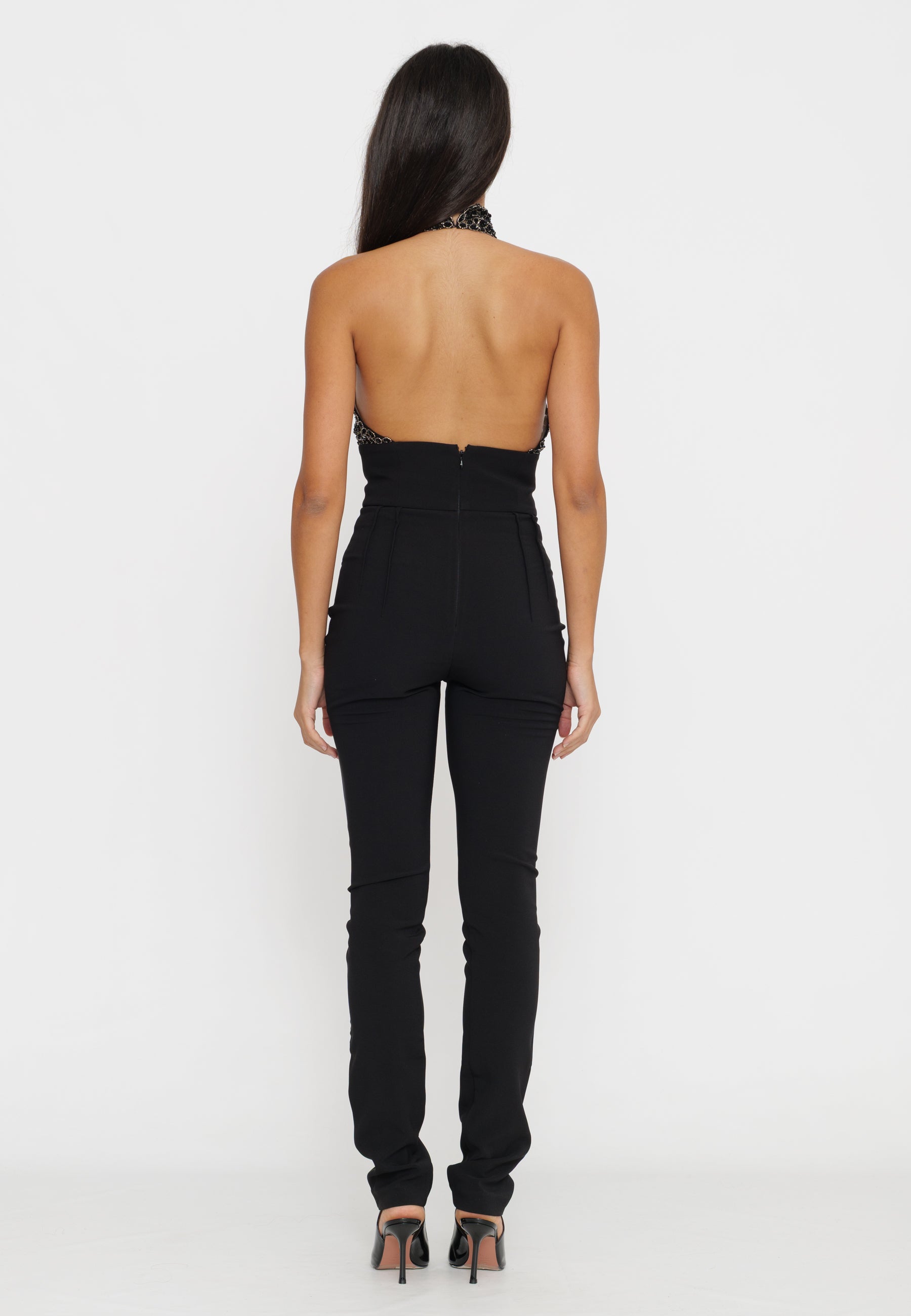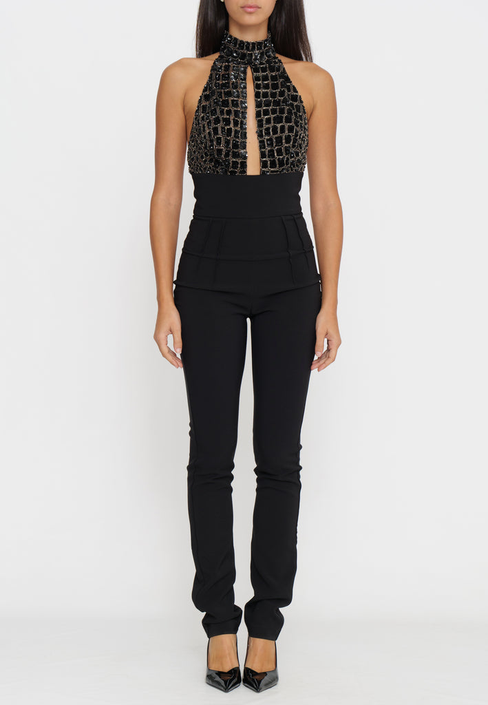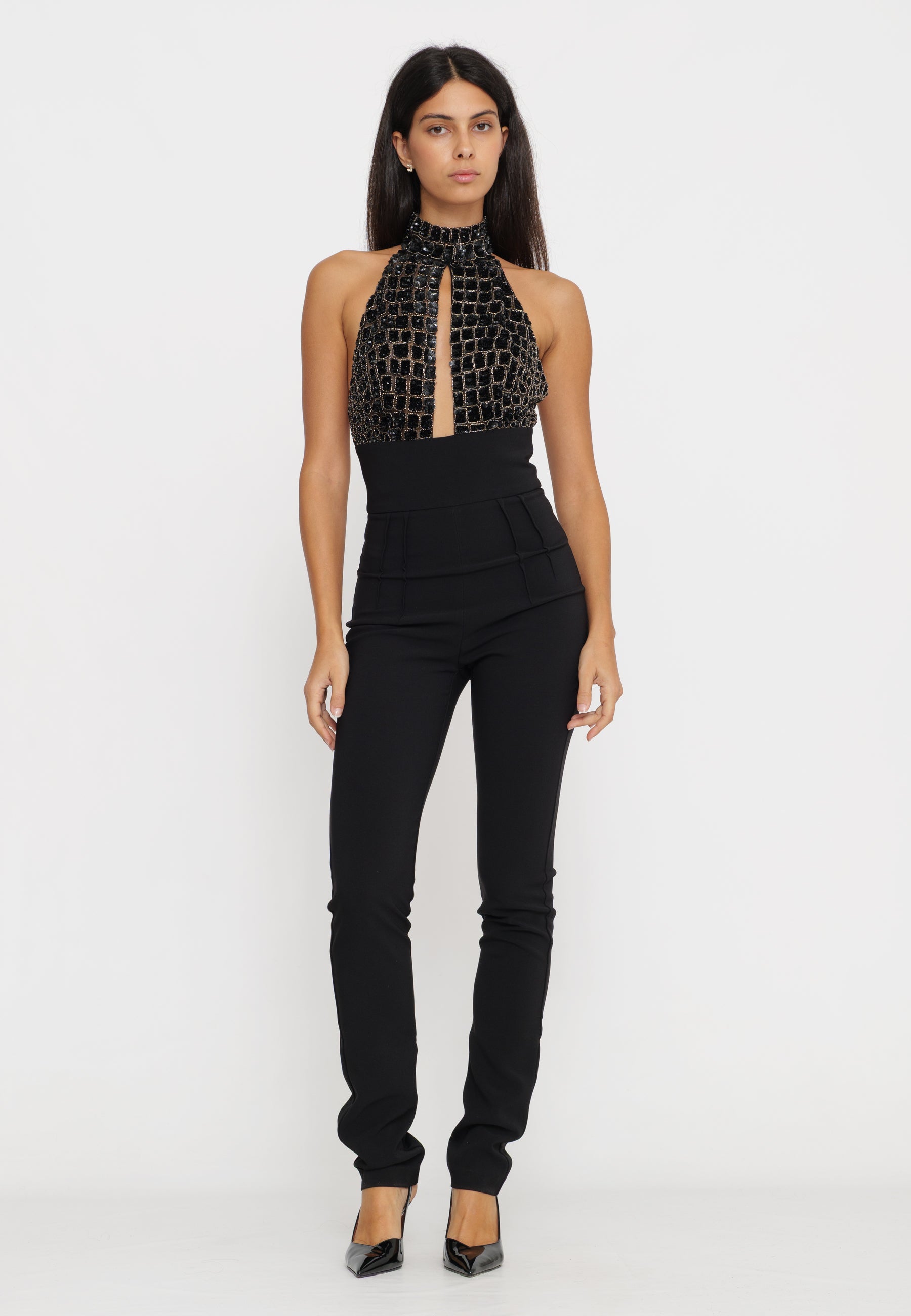 Tuta elegante dalla silhouette aderente con scollo all'americana che valorizza la figura. Il top in tulle è arricchito da raffinati ricami con motivo cocco e brillanti che creano effetti luminosi e tridimensionali. I pantaloni in crêpe presentano vita alta con nervature strutturate per una definizione impeccabile e caviglia morbida per il massimo comfort. Un capo sofisticato che unisce dettagli couture e praticità.