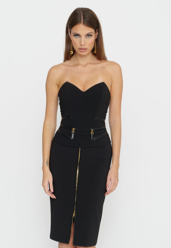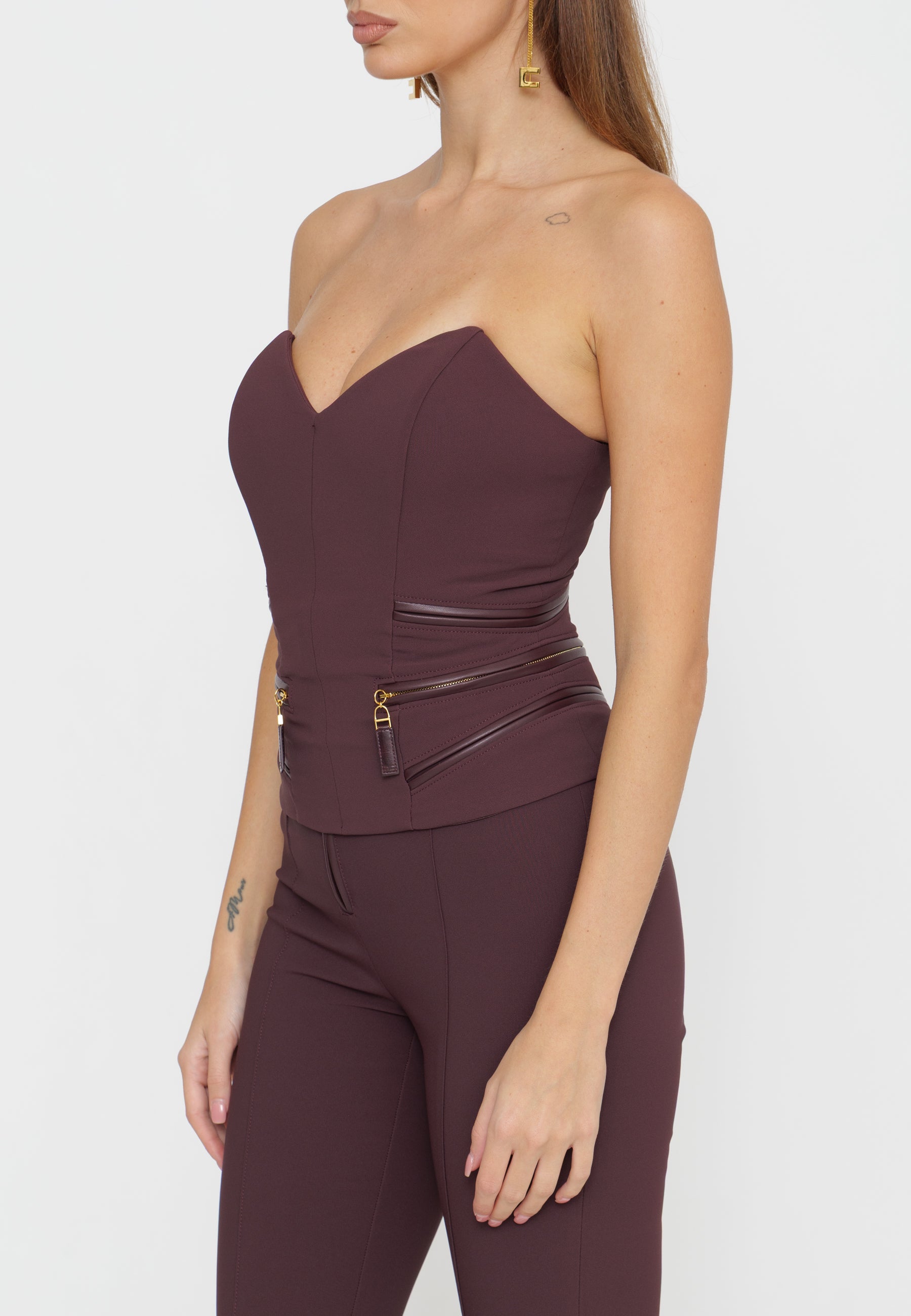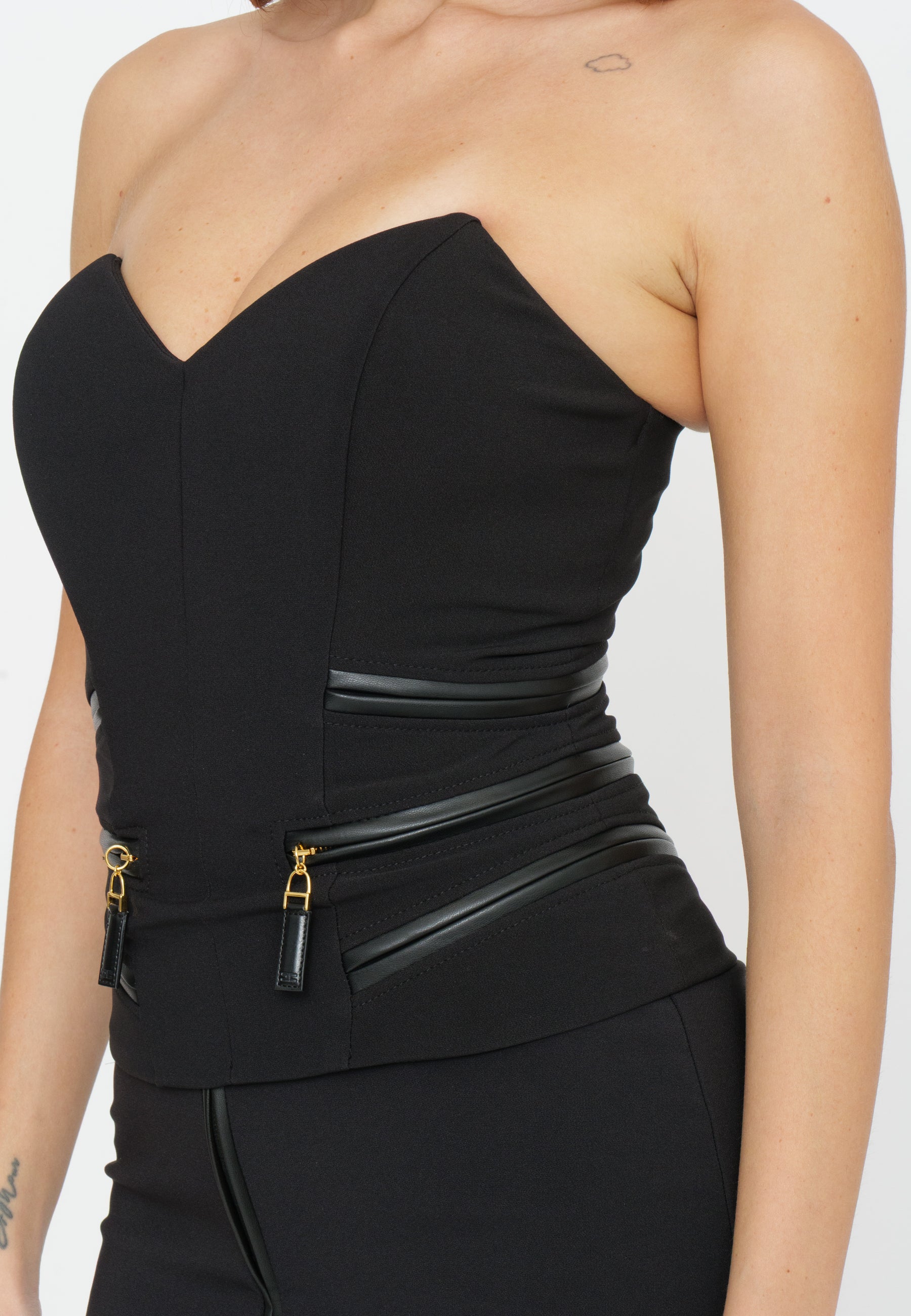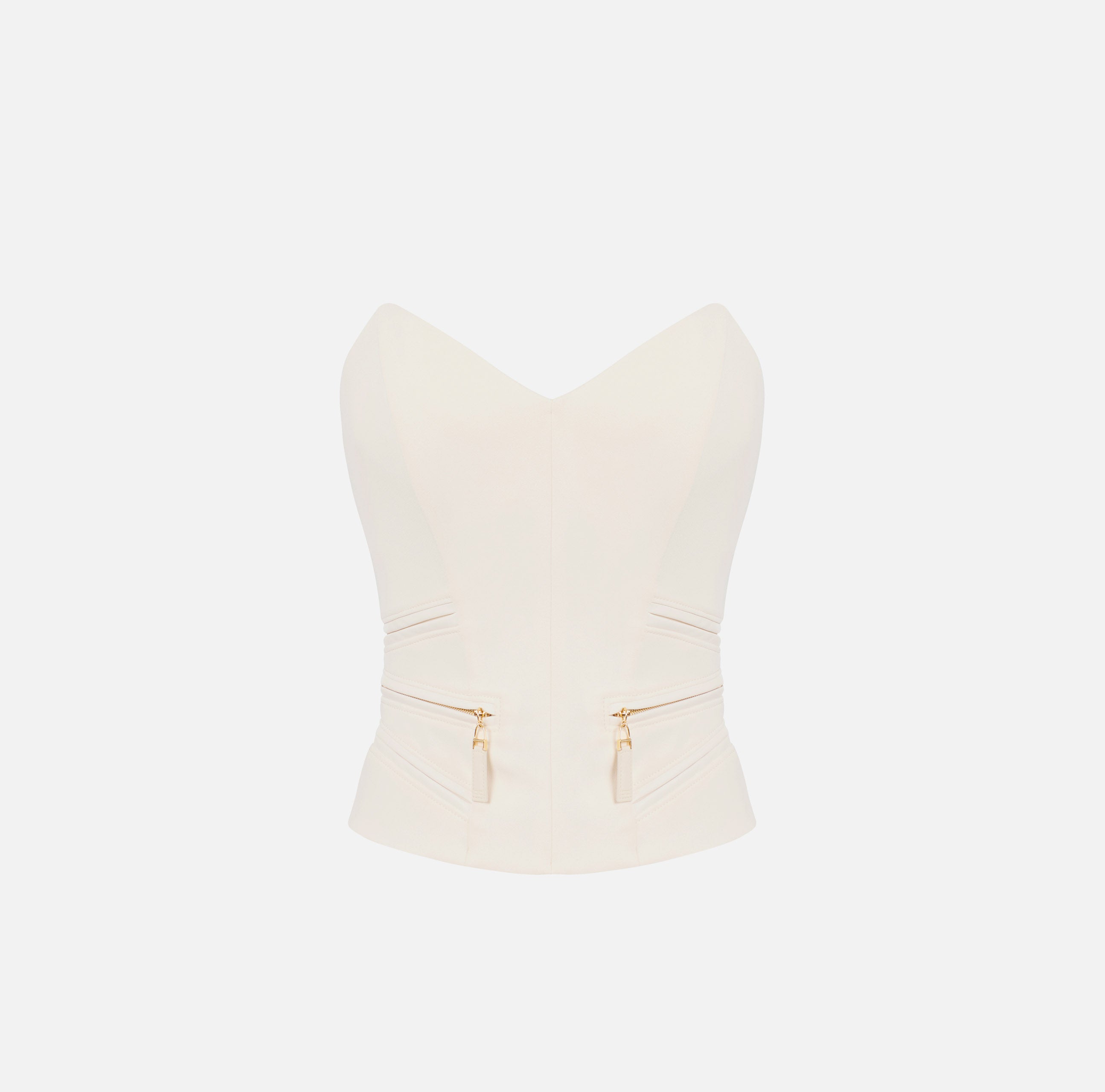 Top in crêpe con silhouette bustier che reinterpreta i codici della maison. La struttura è valorizzata da dettagli zip tono su tono e filetti che marcano le linee del capo, creando definizione e movimento. La chiusura zip posteriore assicura una vestibilità impeccabile e facilita l'indossamento. Un pezzo versatile che combina eleganza minimale e dettagli costruttivi sofisticati, perfetto per composizioni sia casual che più formali.